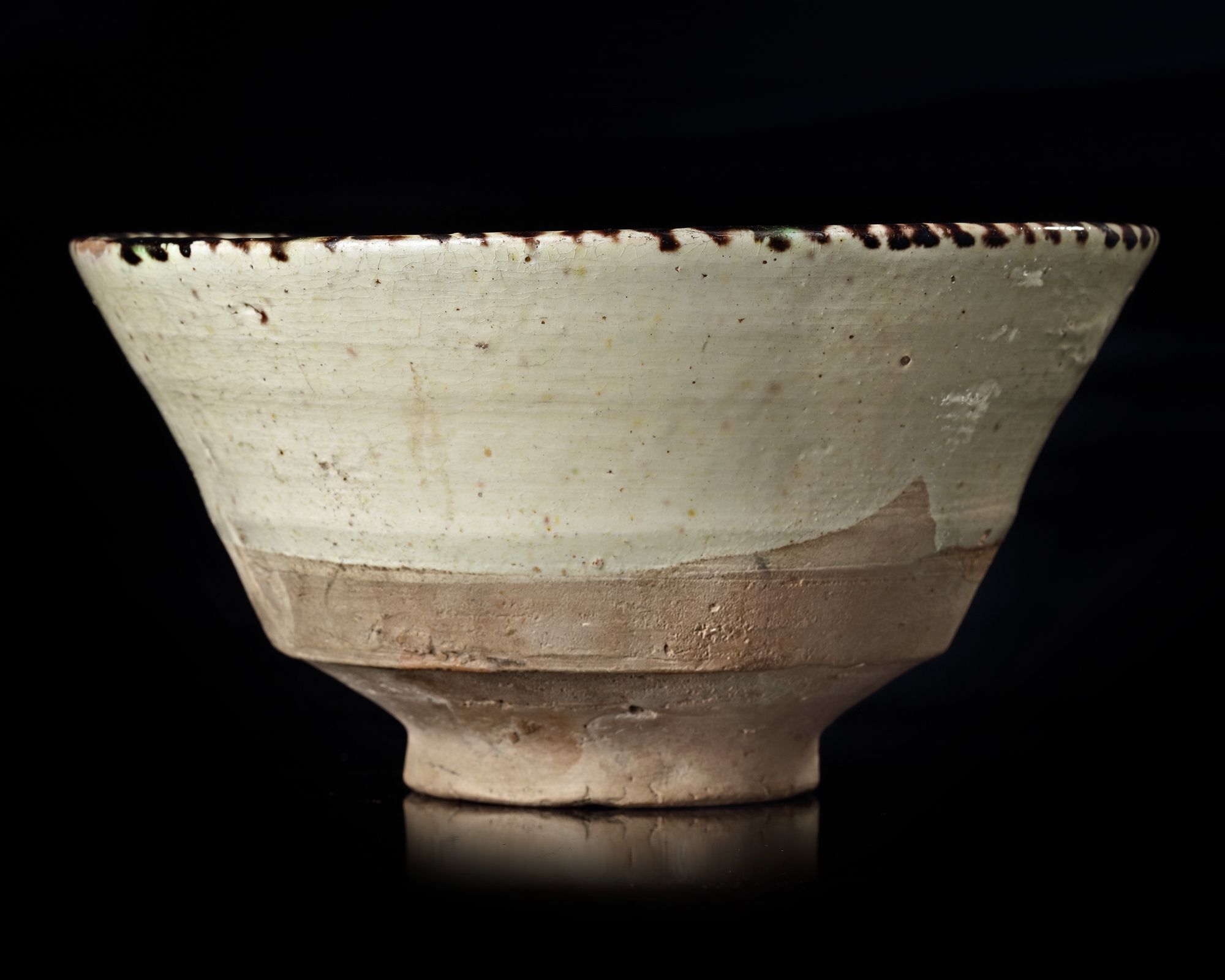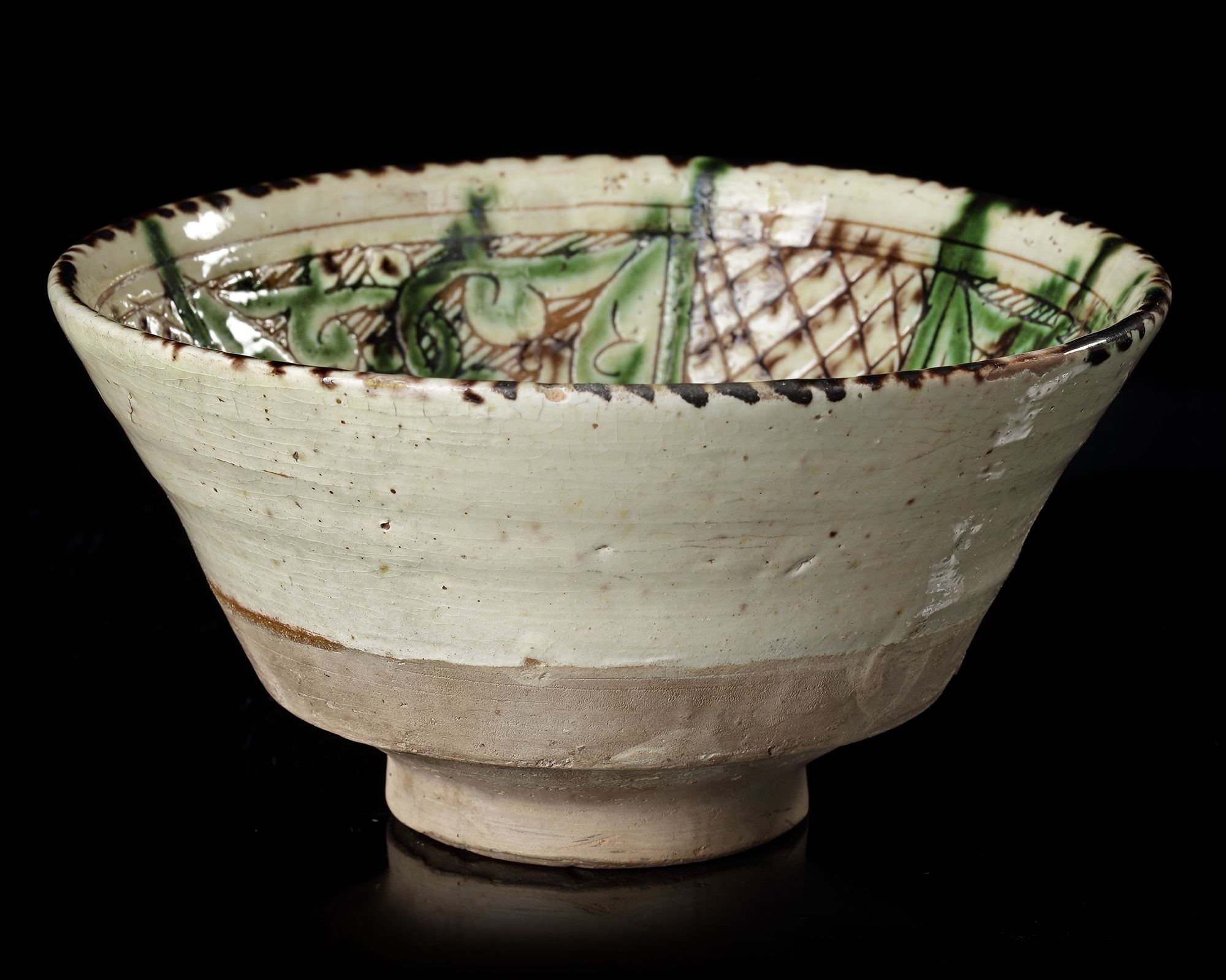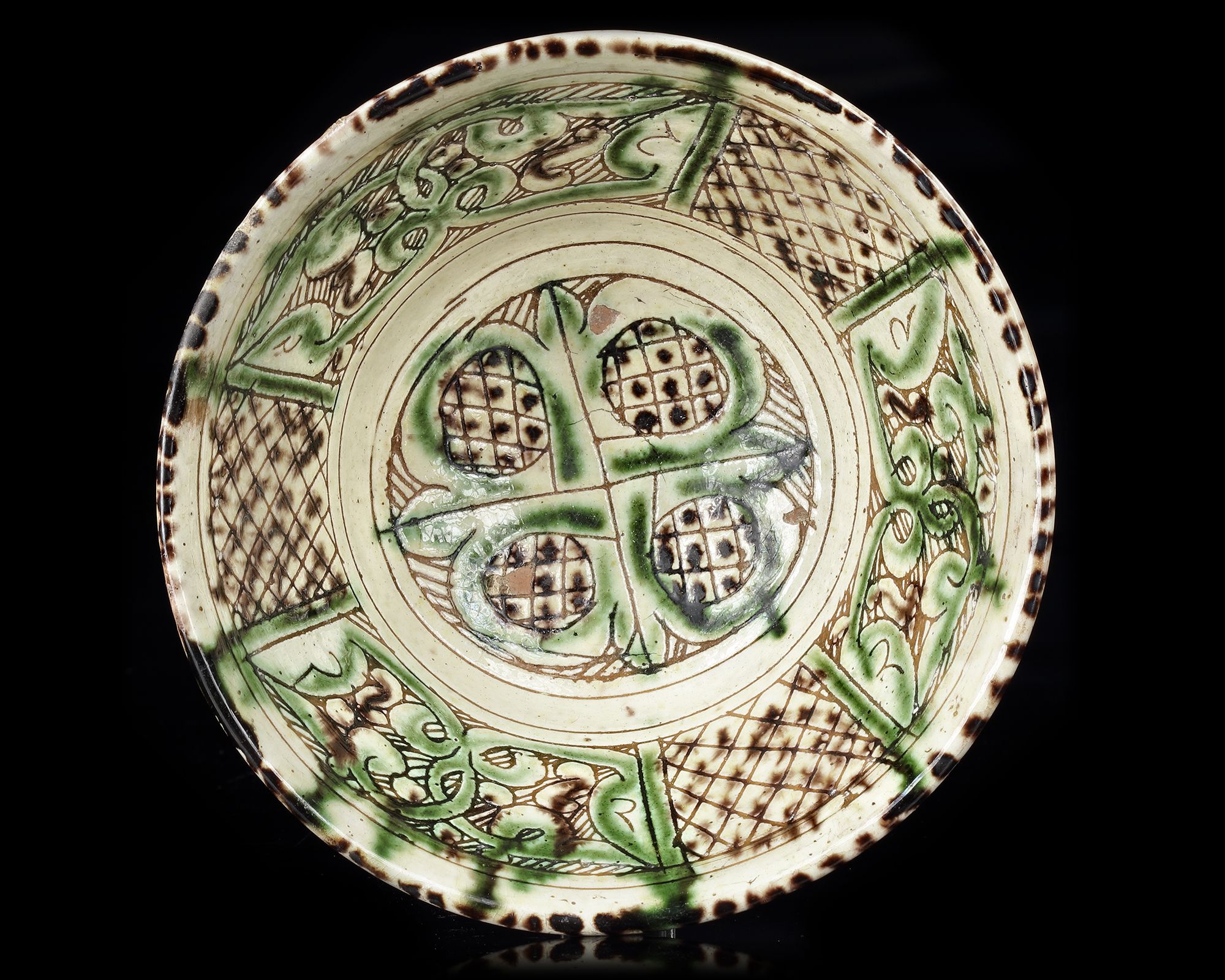Of rounded form with flaring sides and lipped rim, scratched through a white slip and splashed in manganese and green with four-heads rosette, the sides with alternating panels enclosing geometric designs and floral leafy sprays.