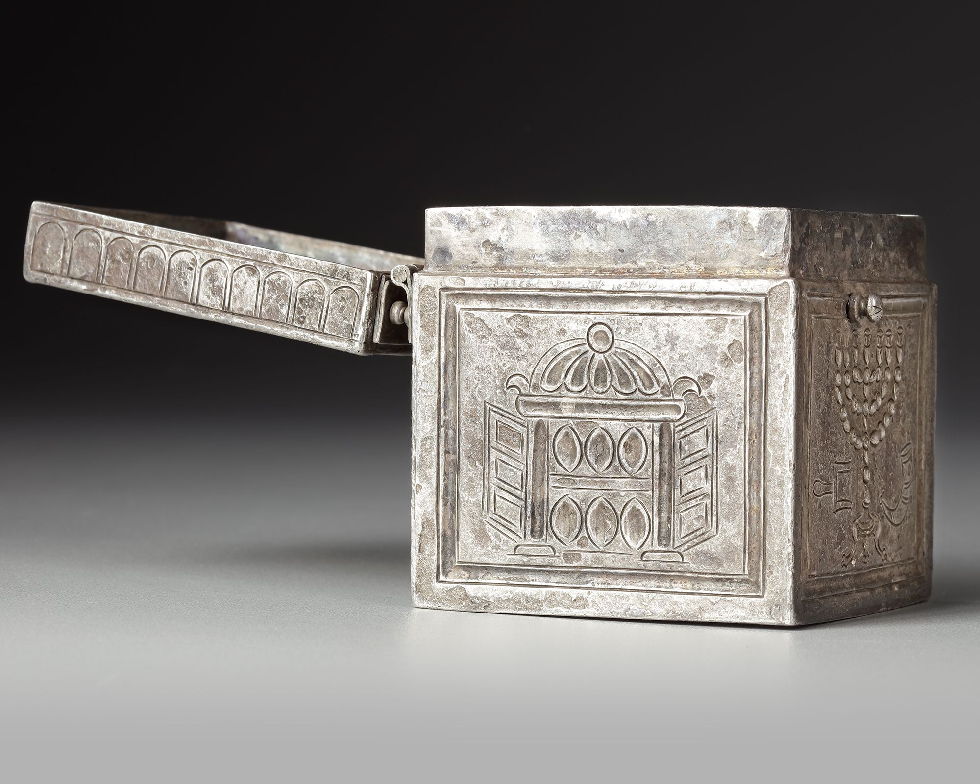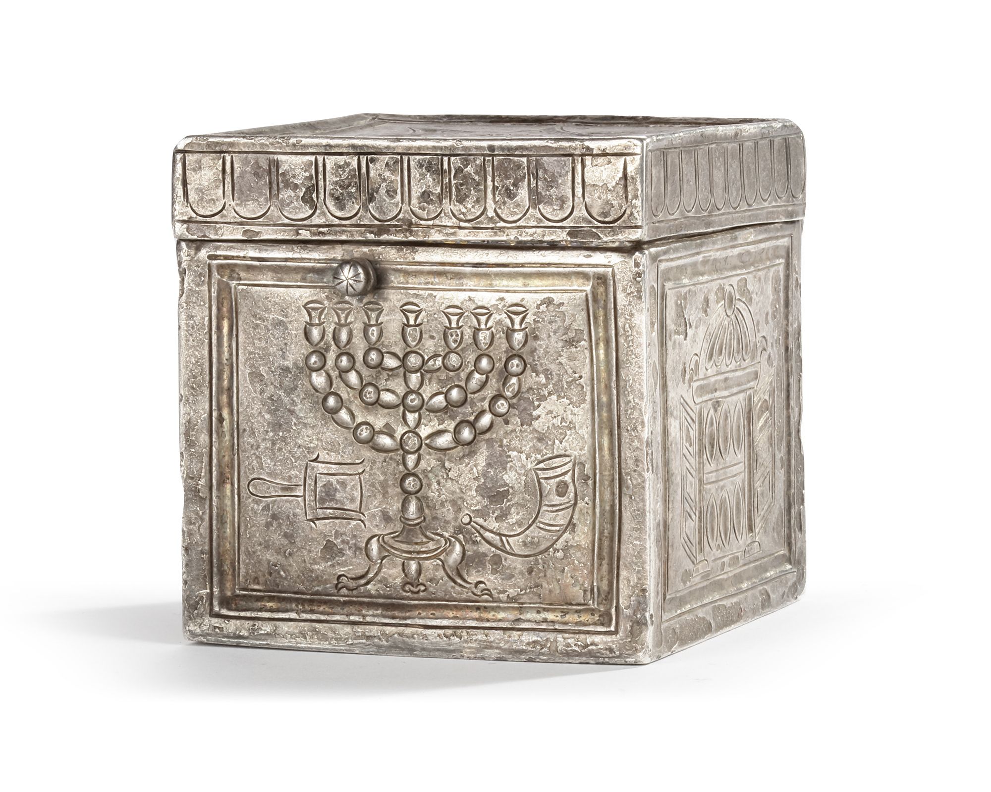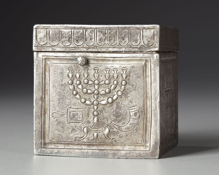 A late Roman silver box with repoussee and engraved decoration showing Judaic subjects in the form of menorahs on two sides and the Torah ark on the other two. The engraved representations of the Torah Ark are identical whereas the menorahs are individually represented. One of the menorahs is flanked bu two symbols, one, the shofar or ram's horn, is commonly shown next to the candelabra. The other however, an ash shovel, is unique and might well point to the use of the box, namely a container for incense.