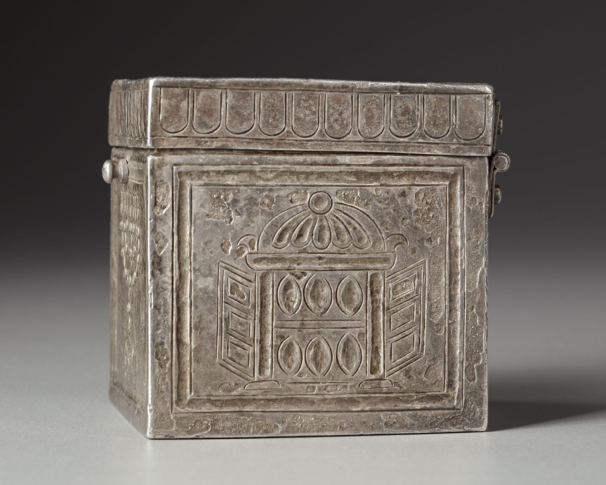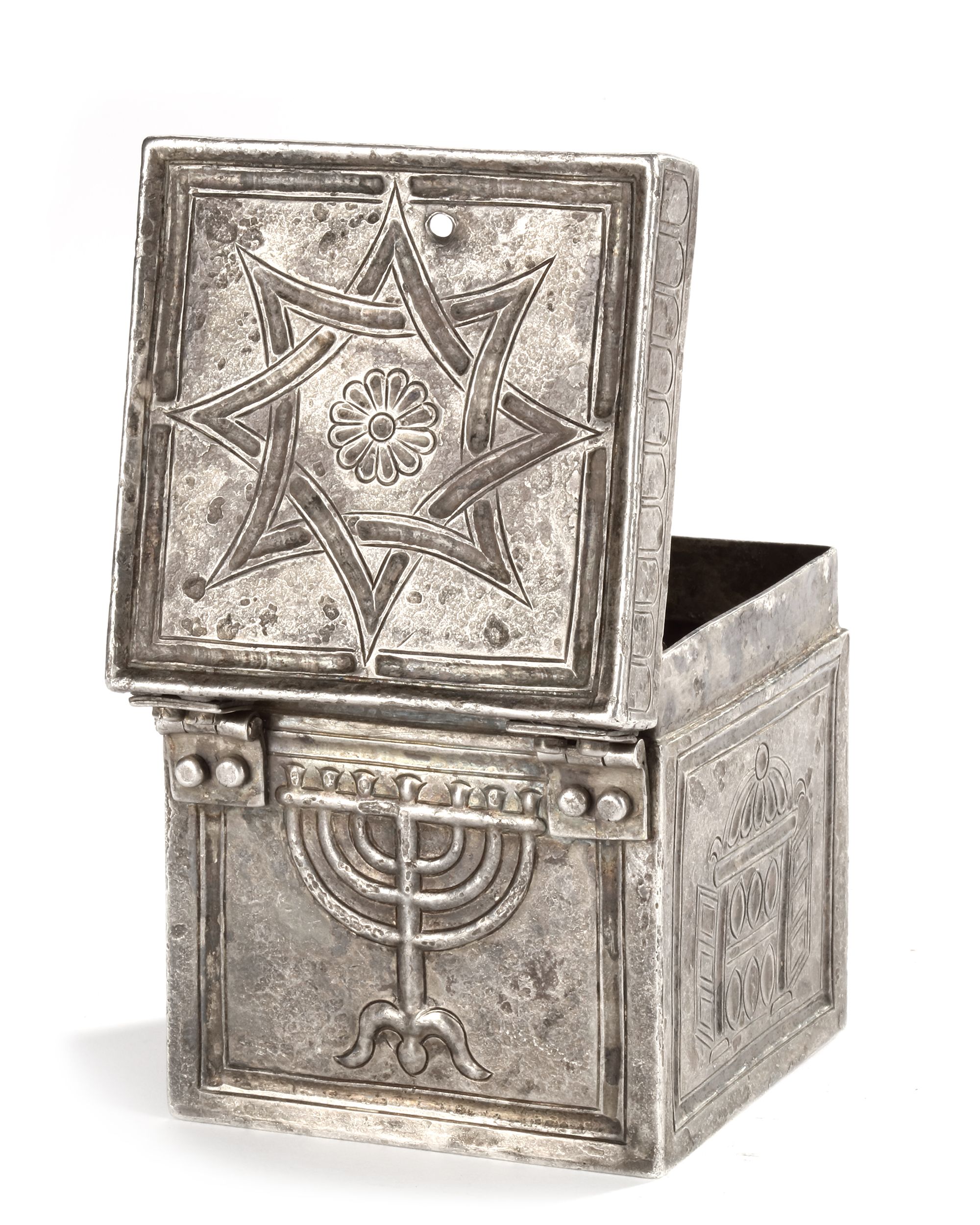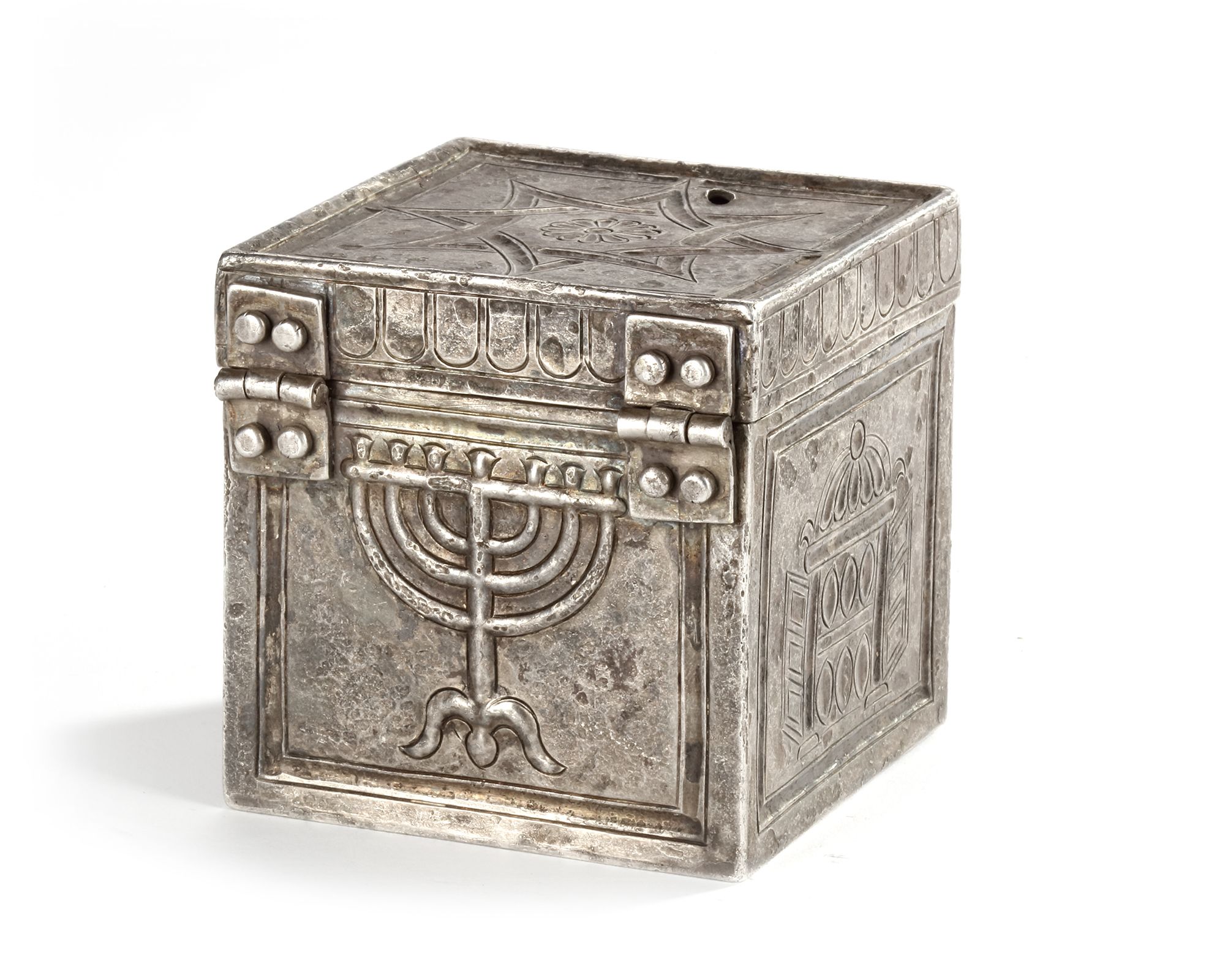 A late Roman silver box with repoussee and engraved decoration showing Judaic subjects in the form of menorahs on two sides and the Torah ark on the other two. The engraved representations of the Torah Ark are identical whereas the menorahs are individually represented. One of the menorahs is flanked bu two symbols, one, the shofar or ram's horn, is commonly shown next to the candelabra. The other however, an ash shovel, is unique and might well point to the use of the box, namely a container for incense.