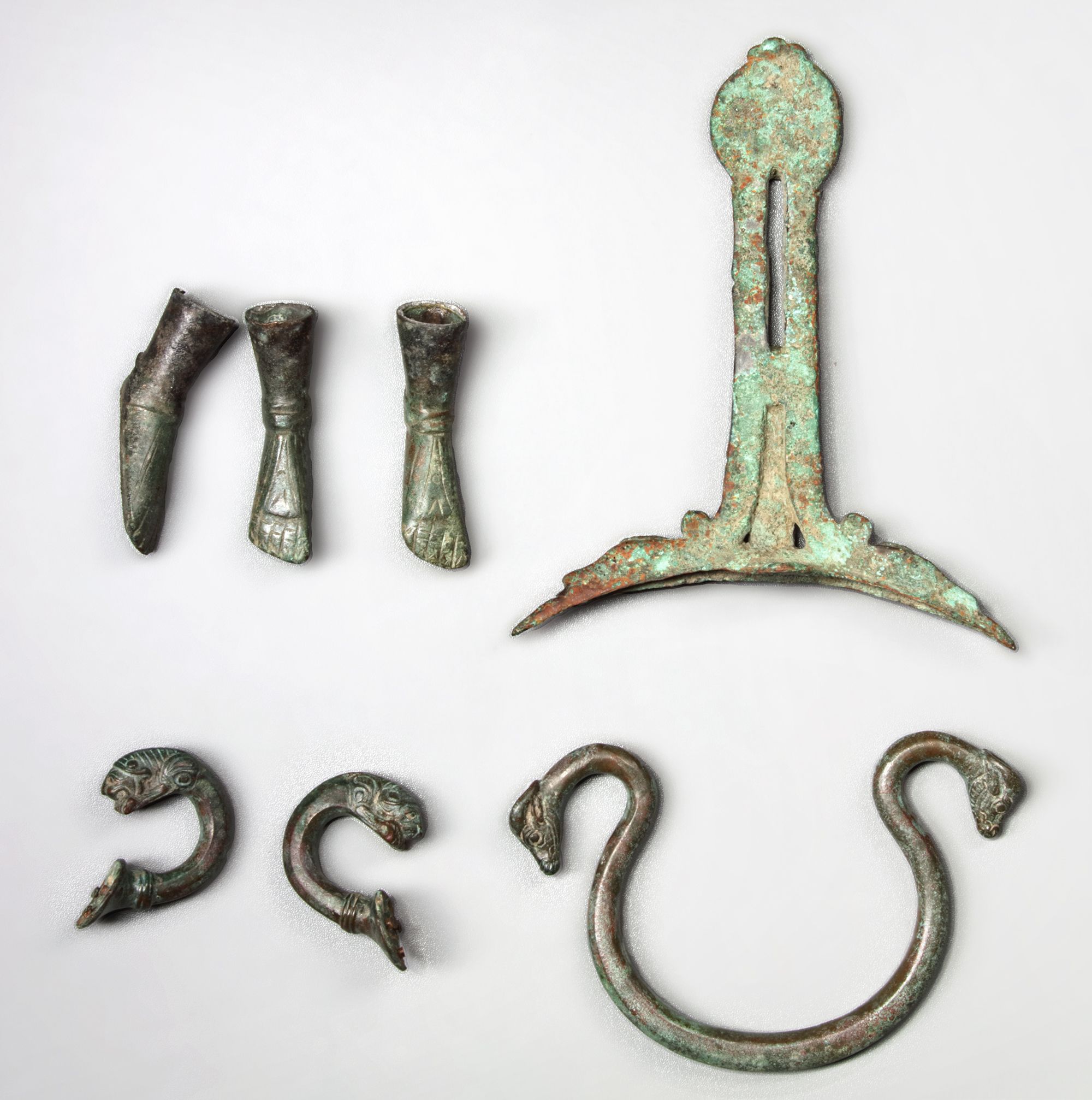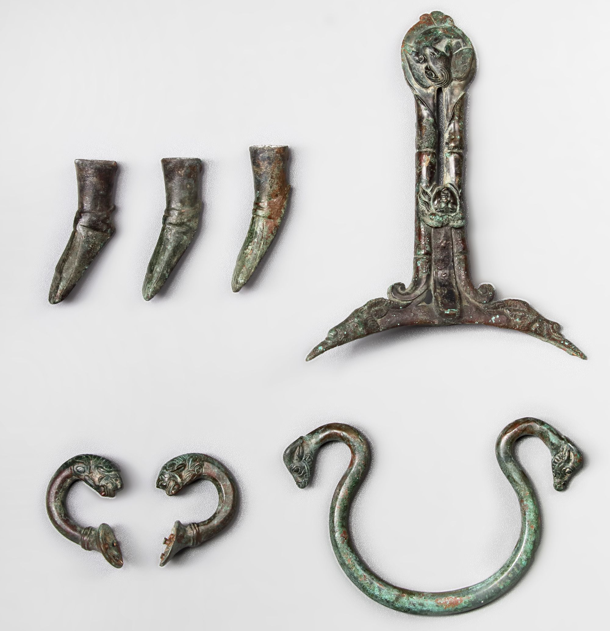 Seven bronze handles and appliqués from various periods.