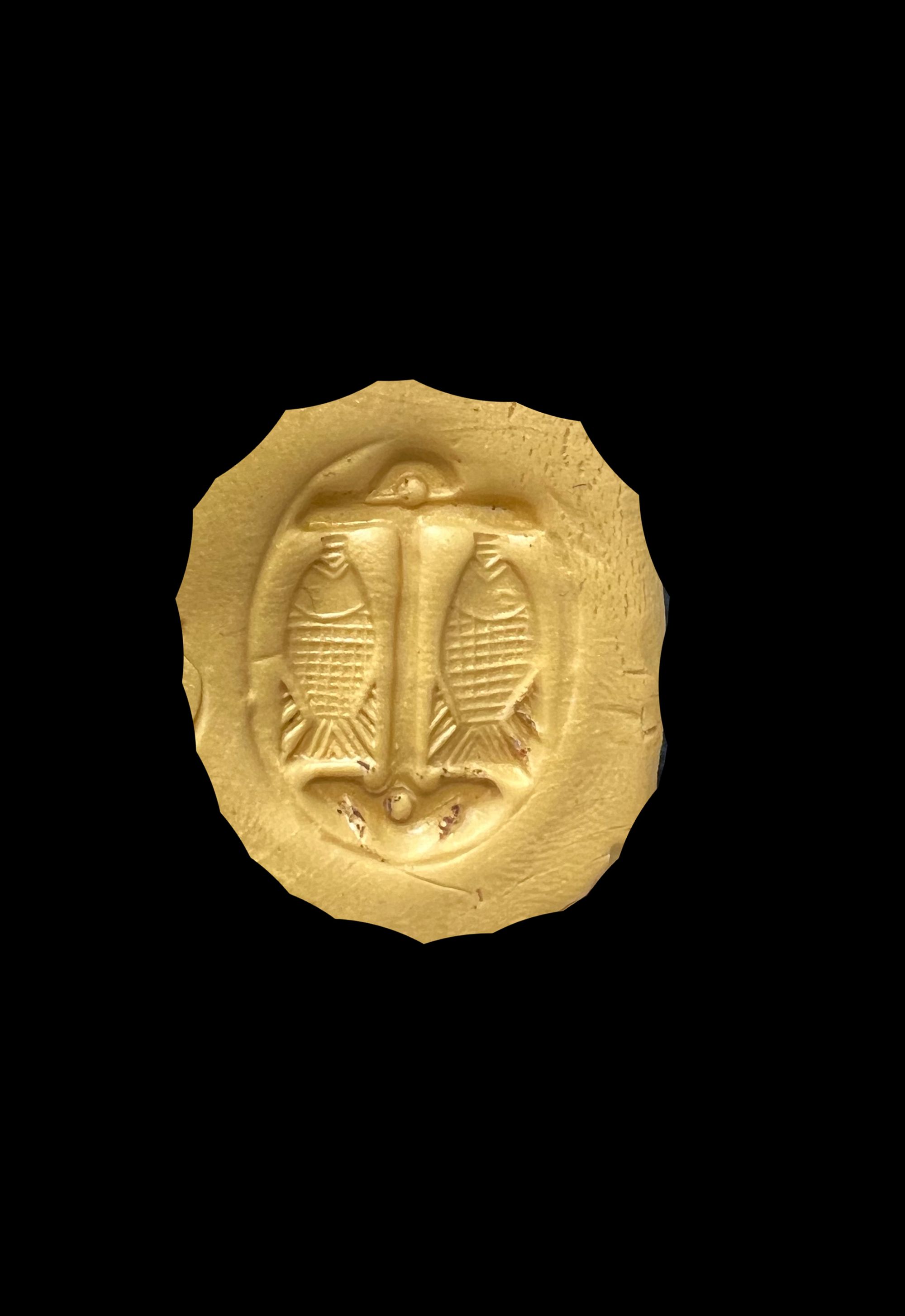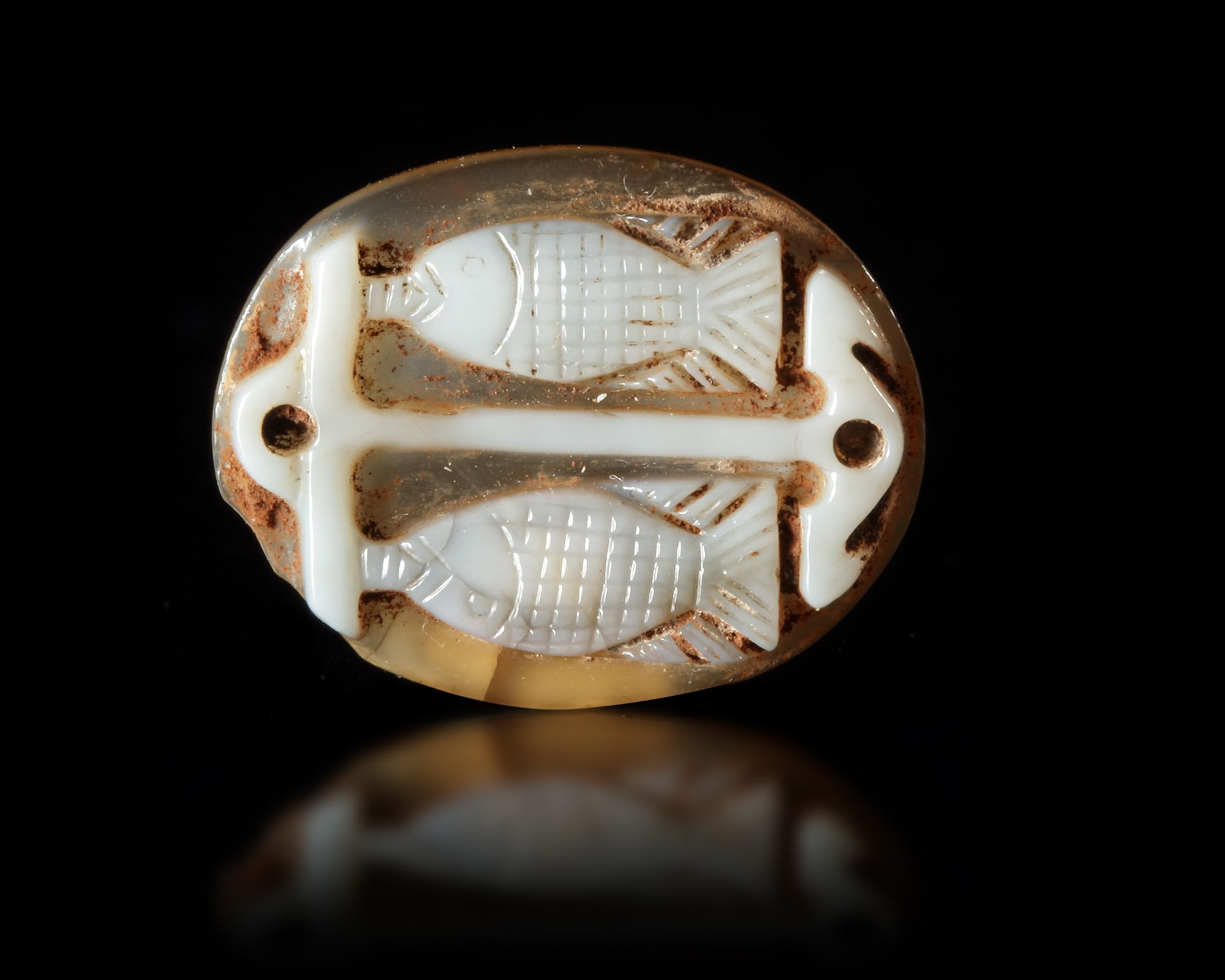 A cameo in agate with an anchor and two fish shown. This type is a symbol for Christianity playing on the Greek word for fish is "ichthys." As early as the first century, Christians made an acrostic from this word: Iesous Christos Theou Yios Soter.