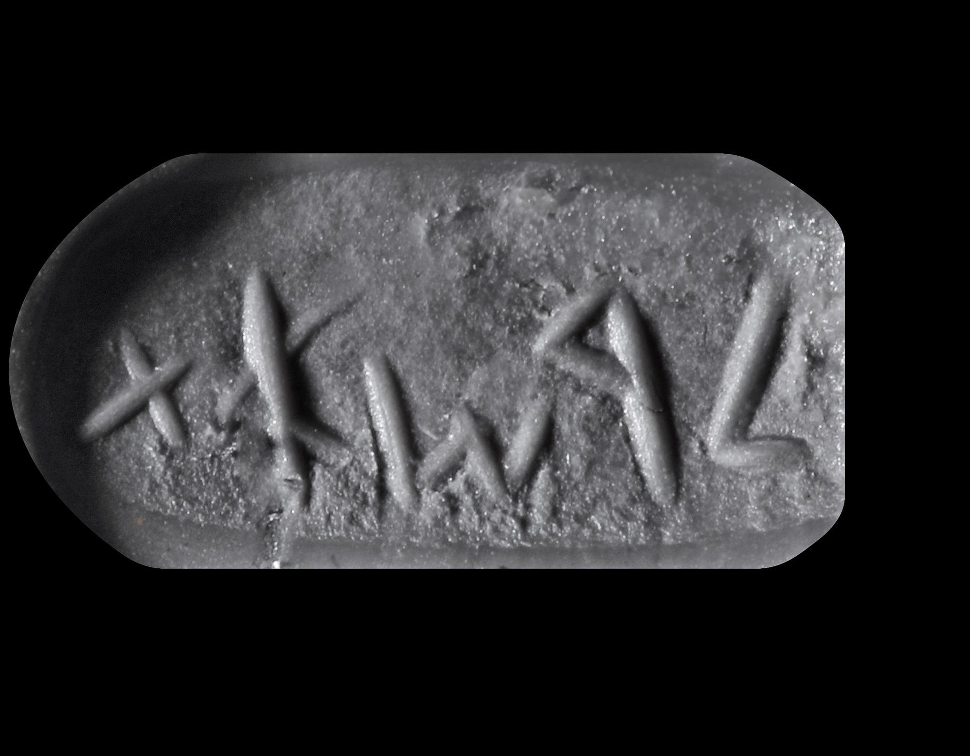 A carnelian amulet in the shape of a lower leg. On the sole of the foot there are five Aramaic/Phoenician letters. The leg is mounted in a gold cap with a suspension hoop. with Aramaic letters
