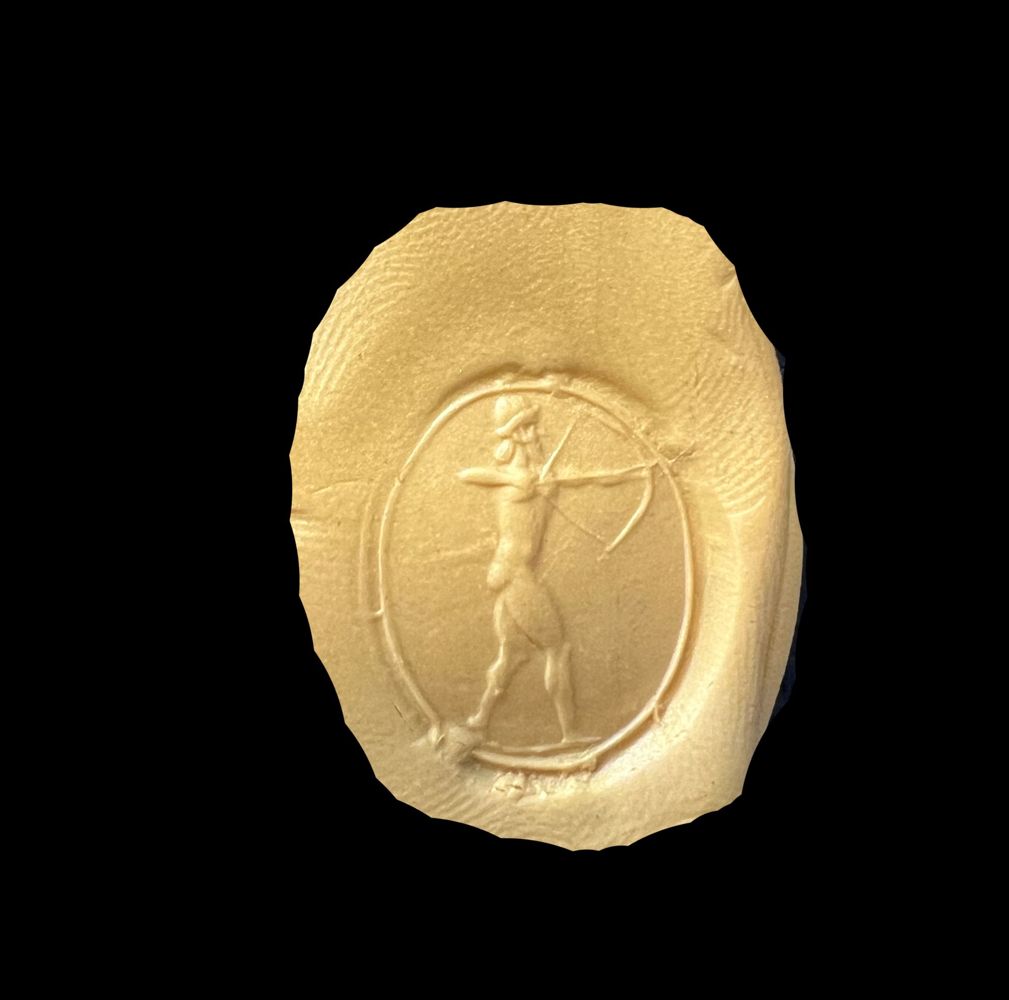 A scaraboid made of banded agate somewhat oxidized. It shows a naked archer about to shoot an arrow with the features of a Persian judging by his hair and long beard.