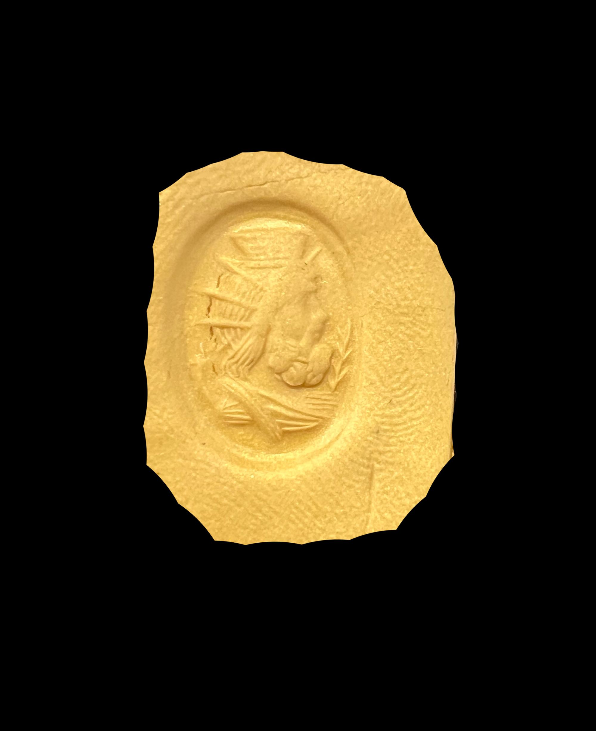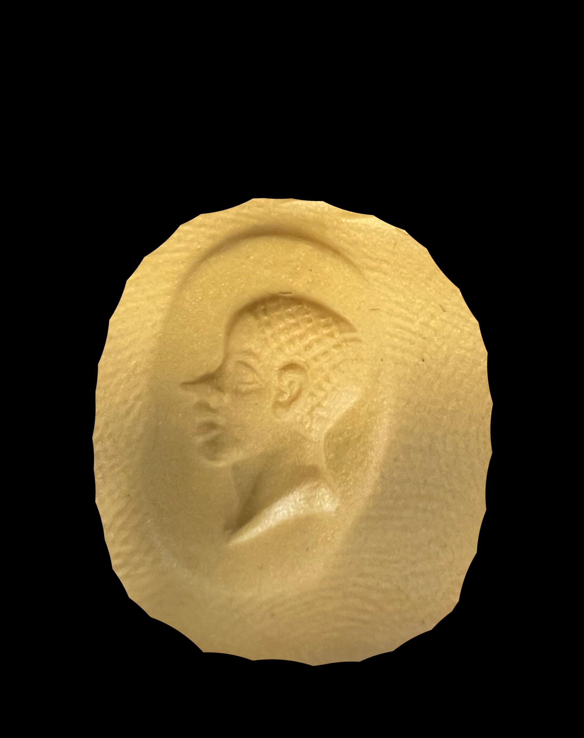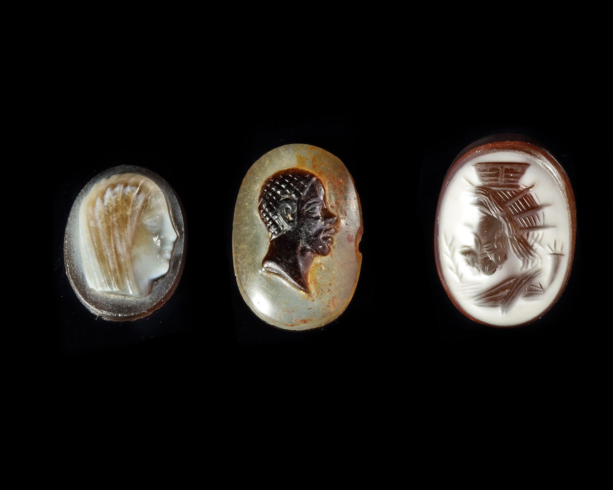 Two cameos, one of a young male African and the other of a veiled youth or young woman. An intaglio of Serapis in a banded agate, he holds a cornucopia and palm frond in front of him.