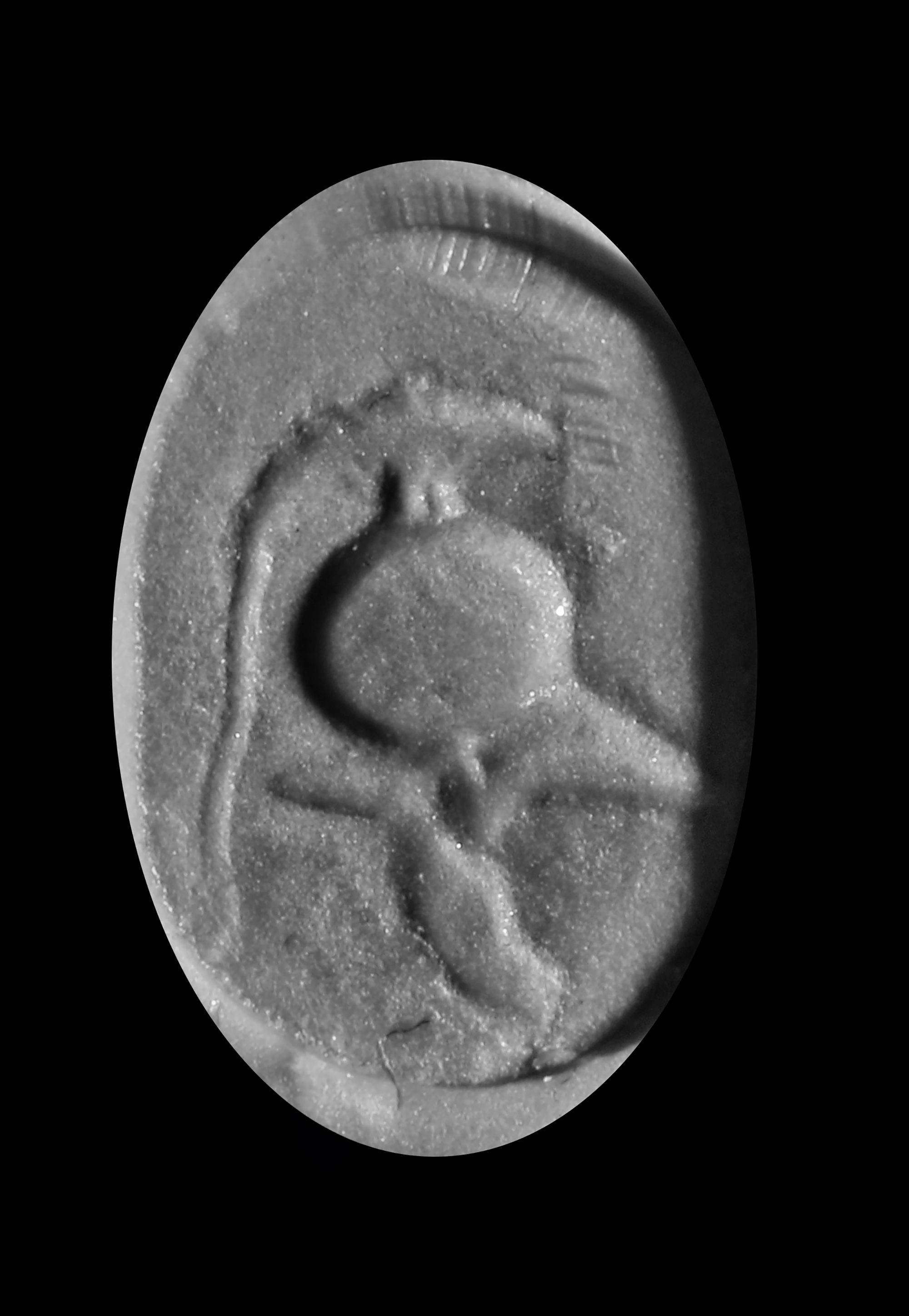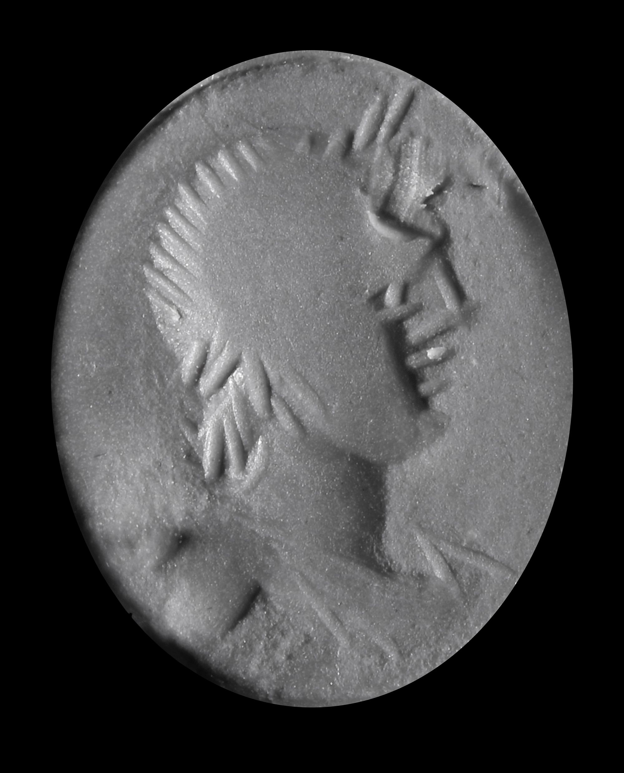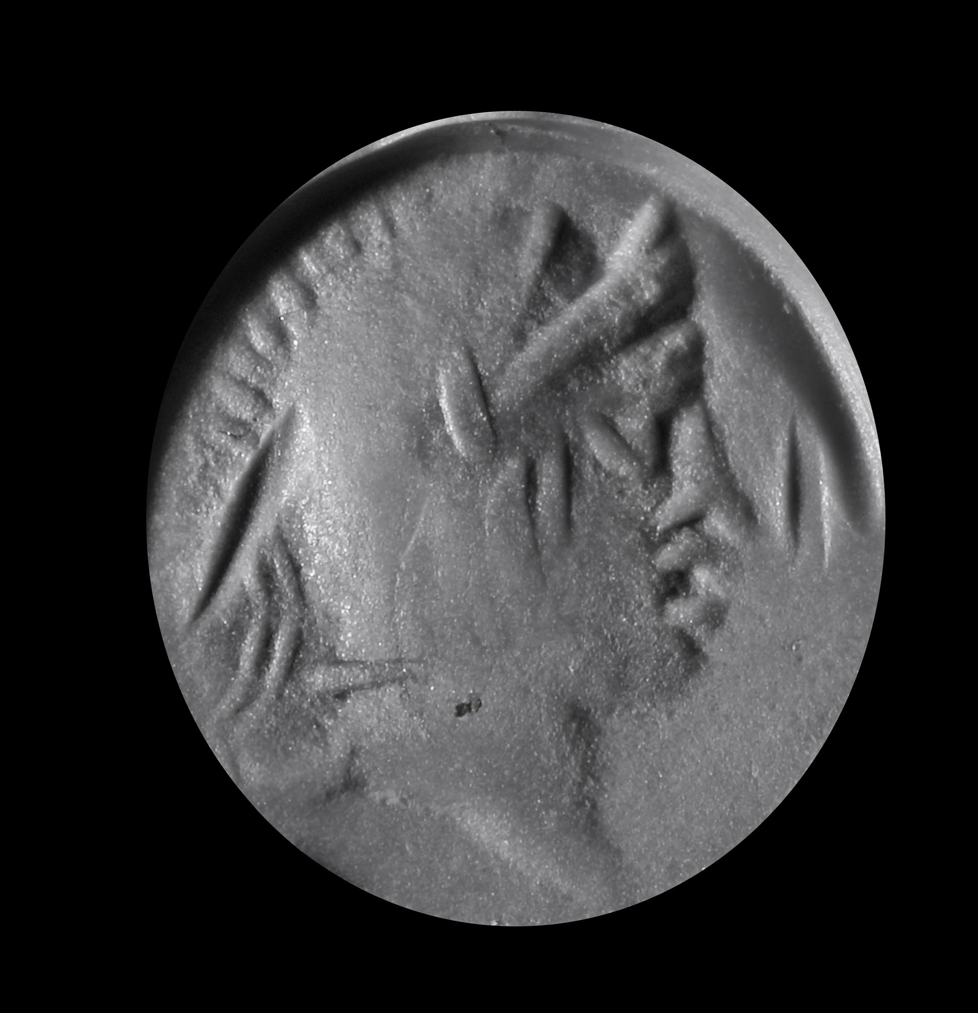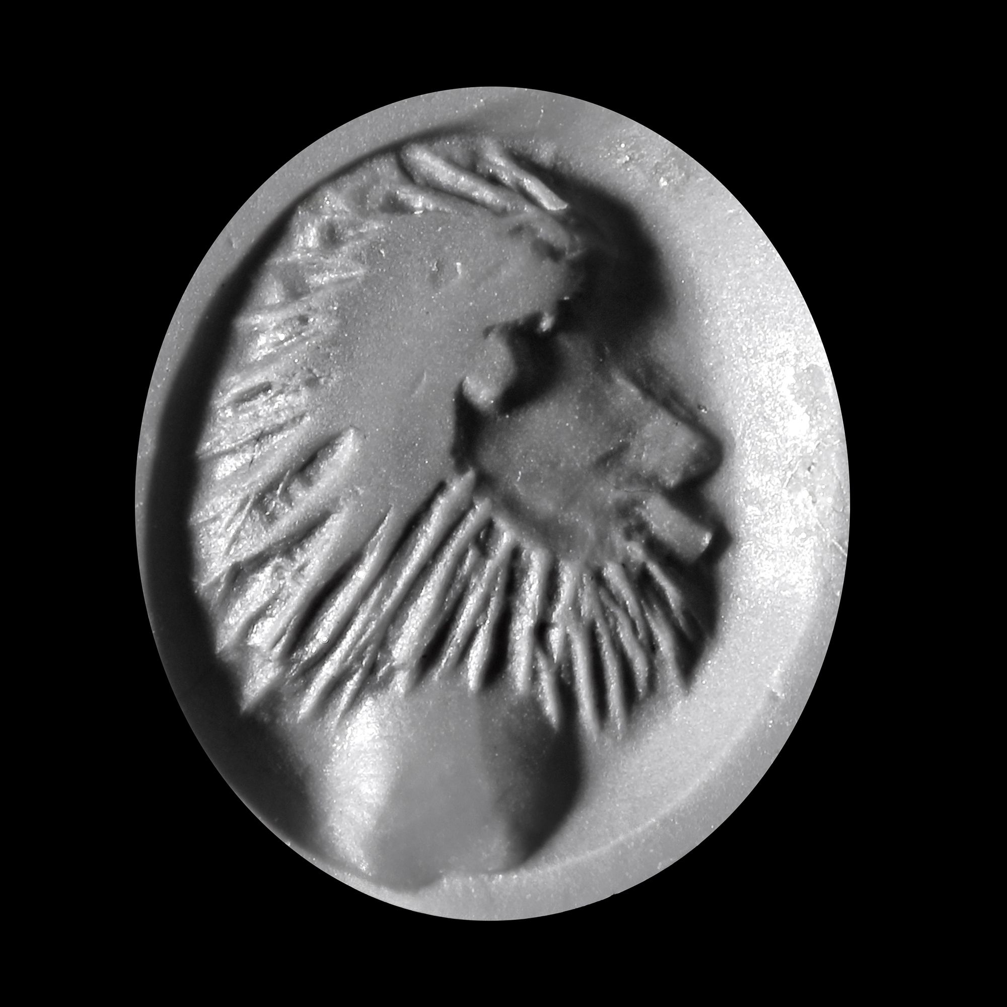 An interesting group of intaglios, mainly Roman of good quality. The subjects Zeus/Jupiter, a head of Mars/Ares, a young Apollo, a fisherman, a Macedonian helmet, a stag standing to the right. Also there is a very crude head of a bearded man, possibly post Roman from Western Europe. In addition is a 19th century heraldic intaglio with a monogram on the back.