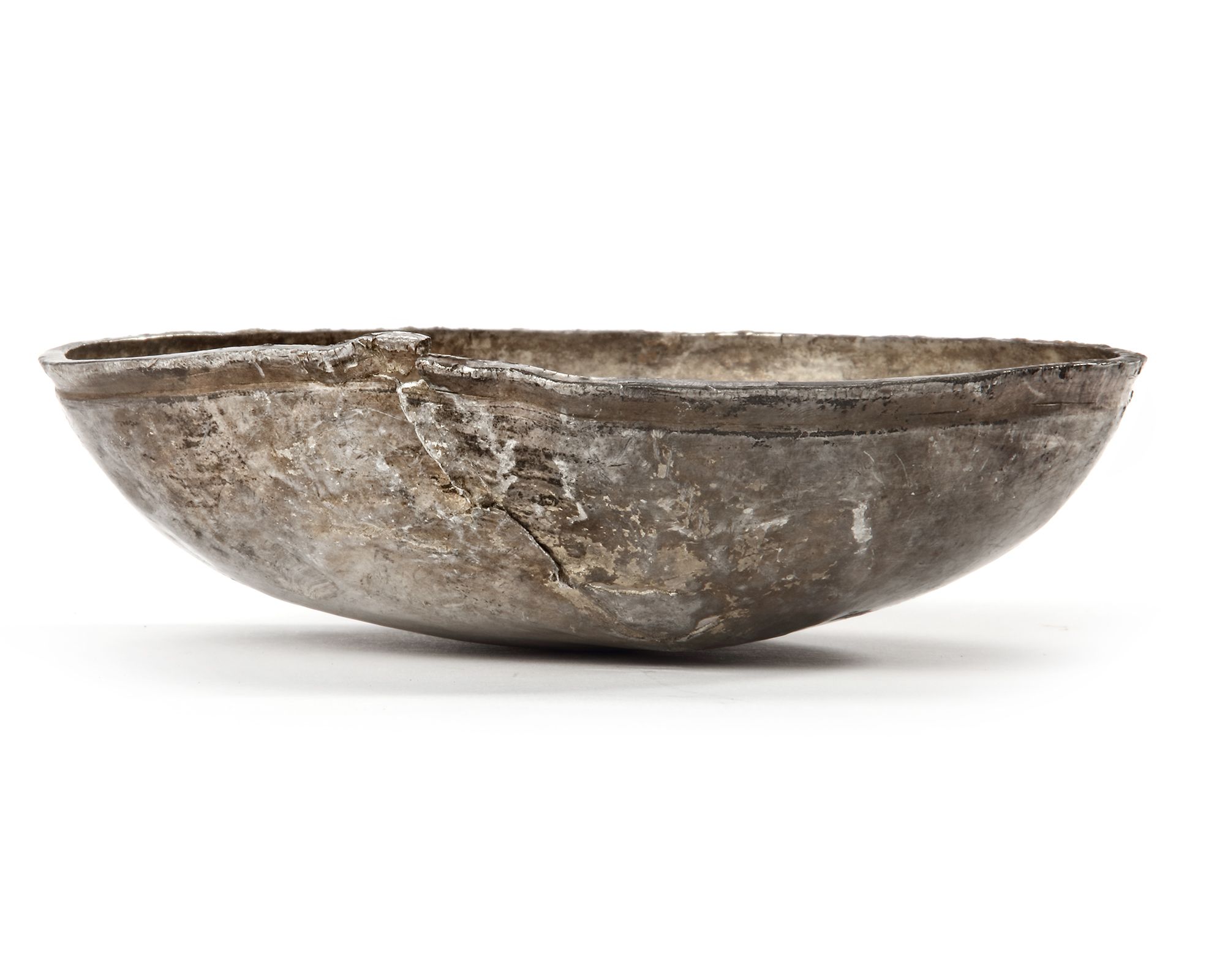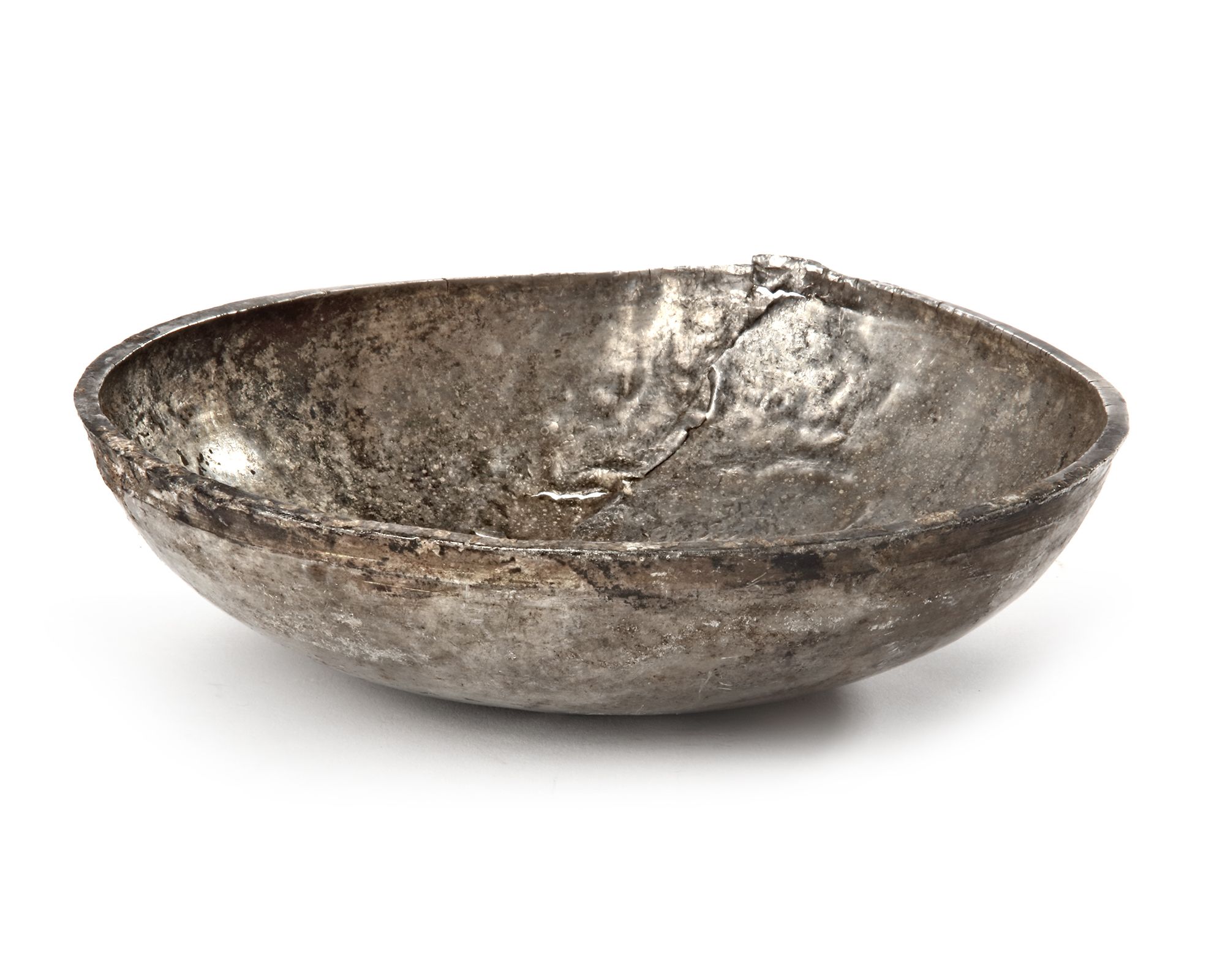 A small silver bowl, from the later Sassanian period. The interior of the bowl is decorated with a band formed of a double circle and a light gilding within is an engraved goose, a fairly popular subject at the time. There is a small amount of damage to the bowl.
