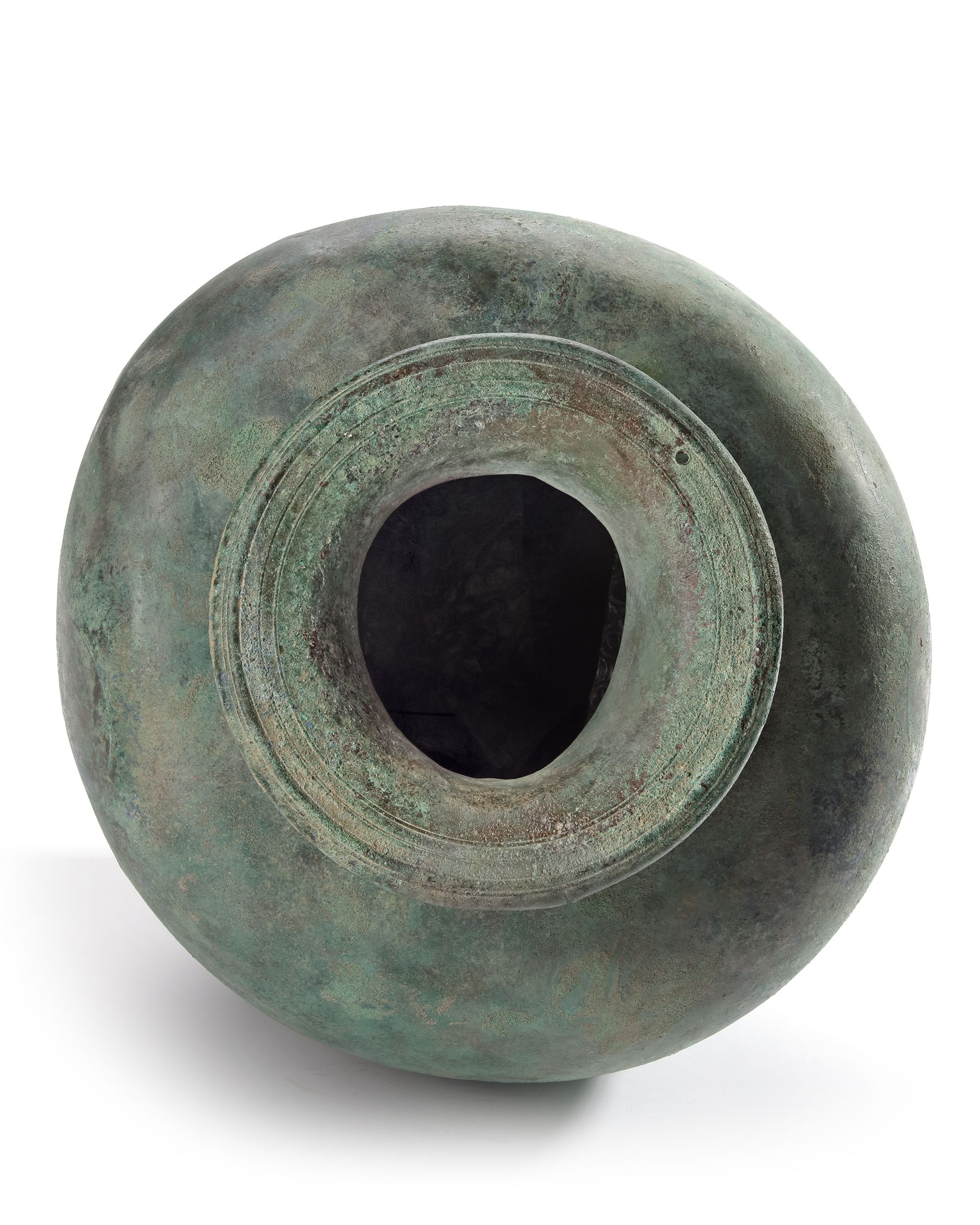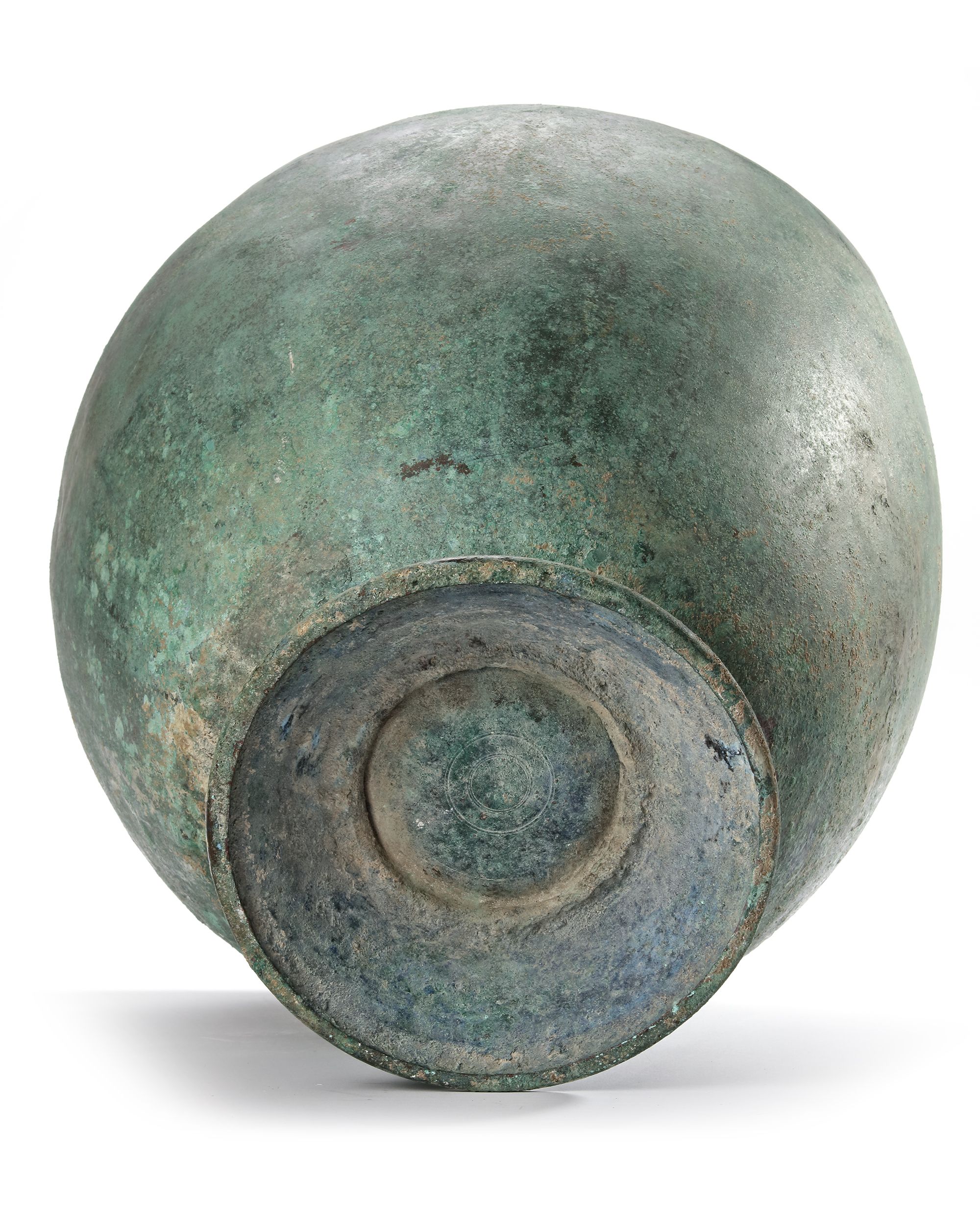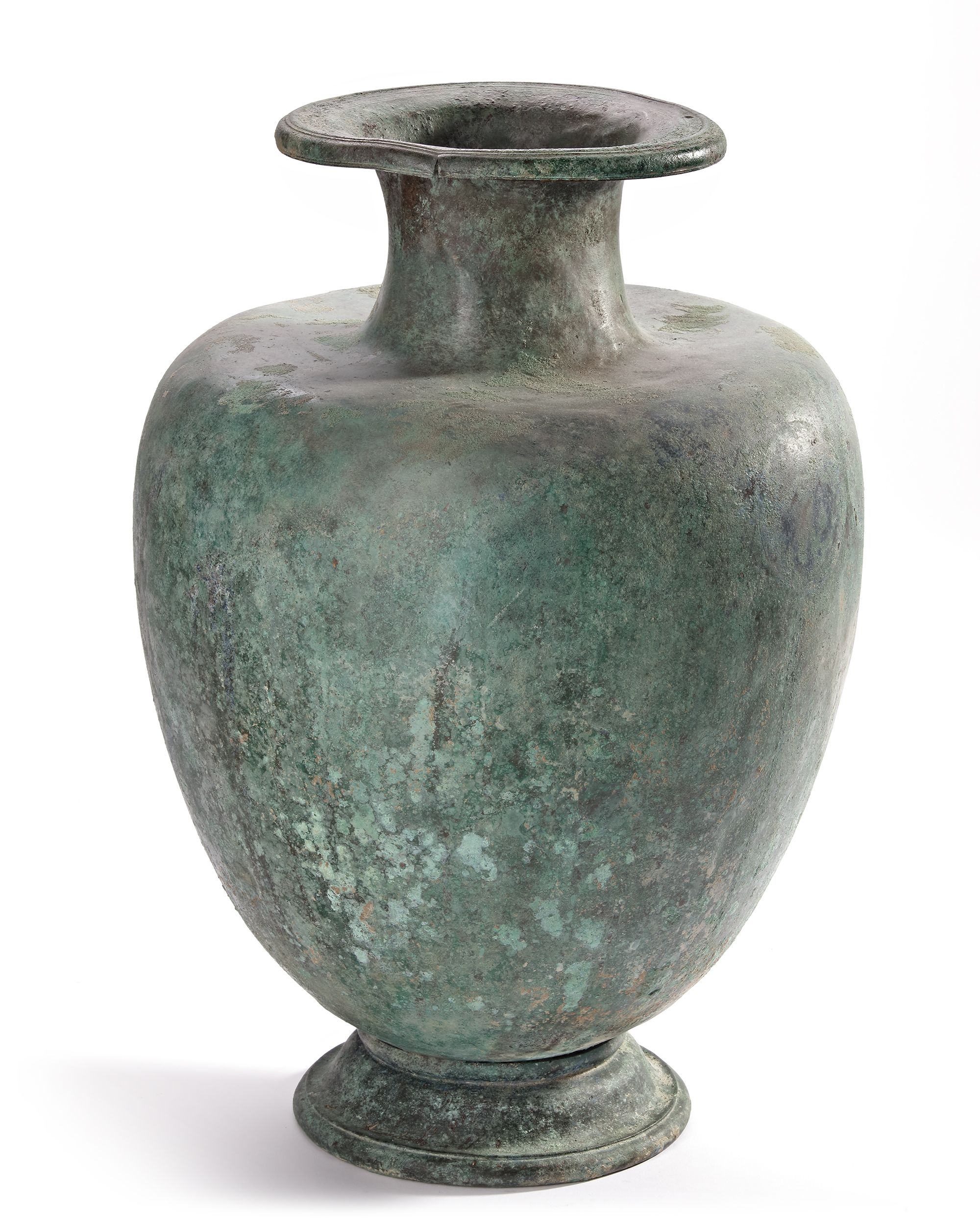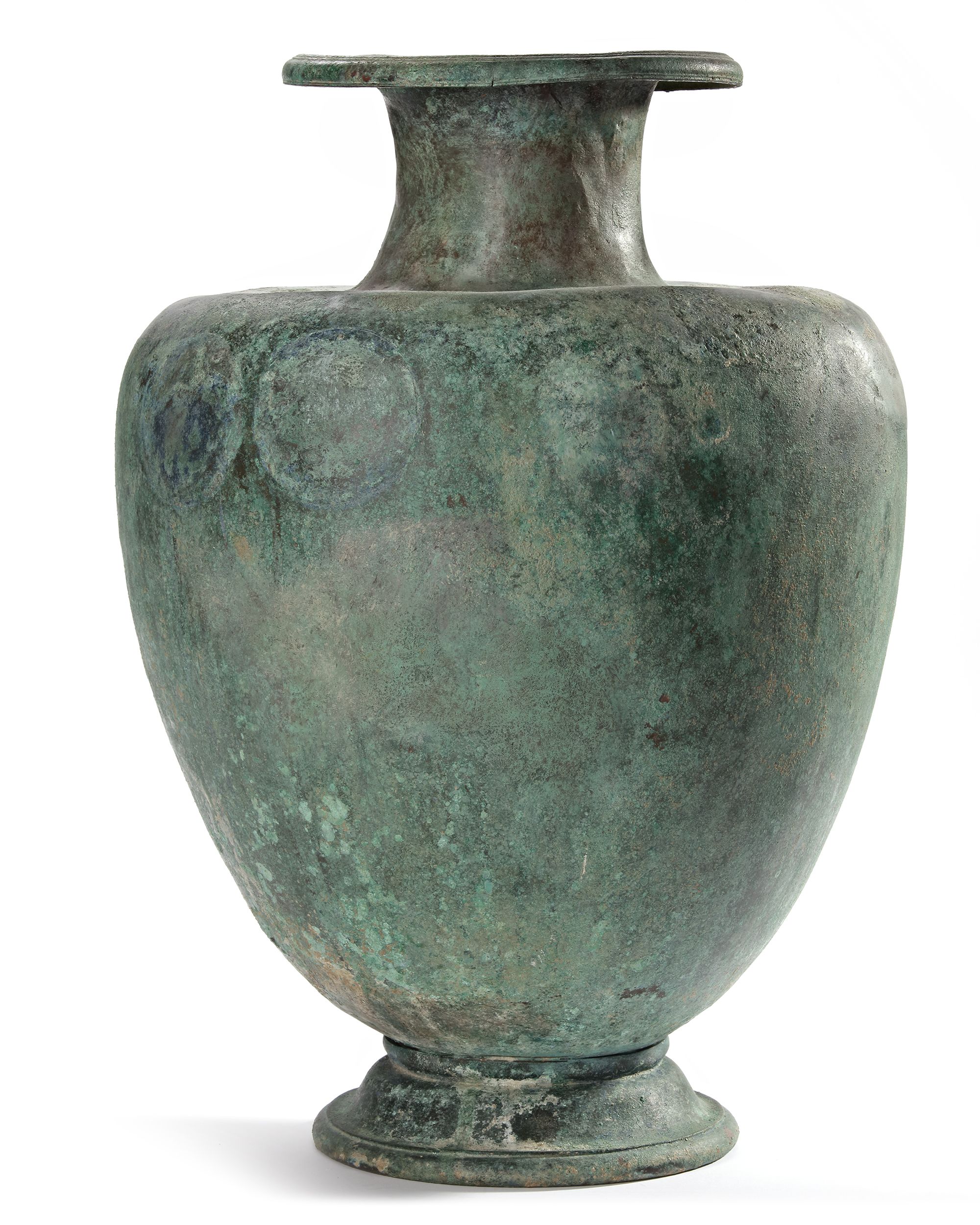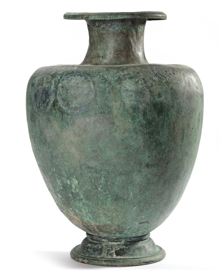 A well preserved Hydria missing its handles. There would have been two lateral handles soldered to the body at opposite sides to each other. The trace of two large circles can be seen where they were positioned. Between them the upright handle was attached and a heart shaped ghosting of the outline can be seen. A drilled hole at the rim might suggest a chain attached to a stopper.