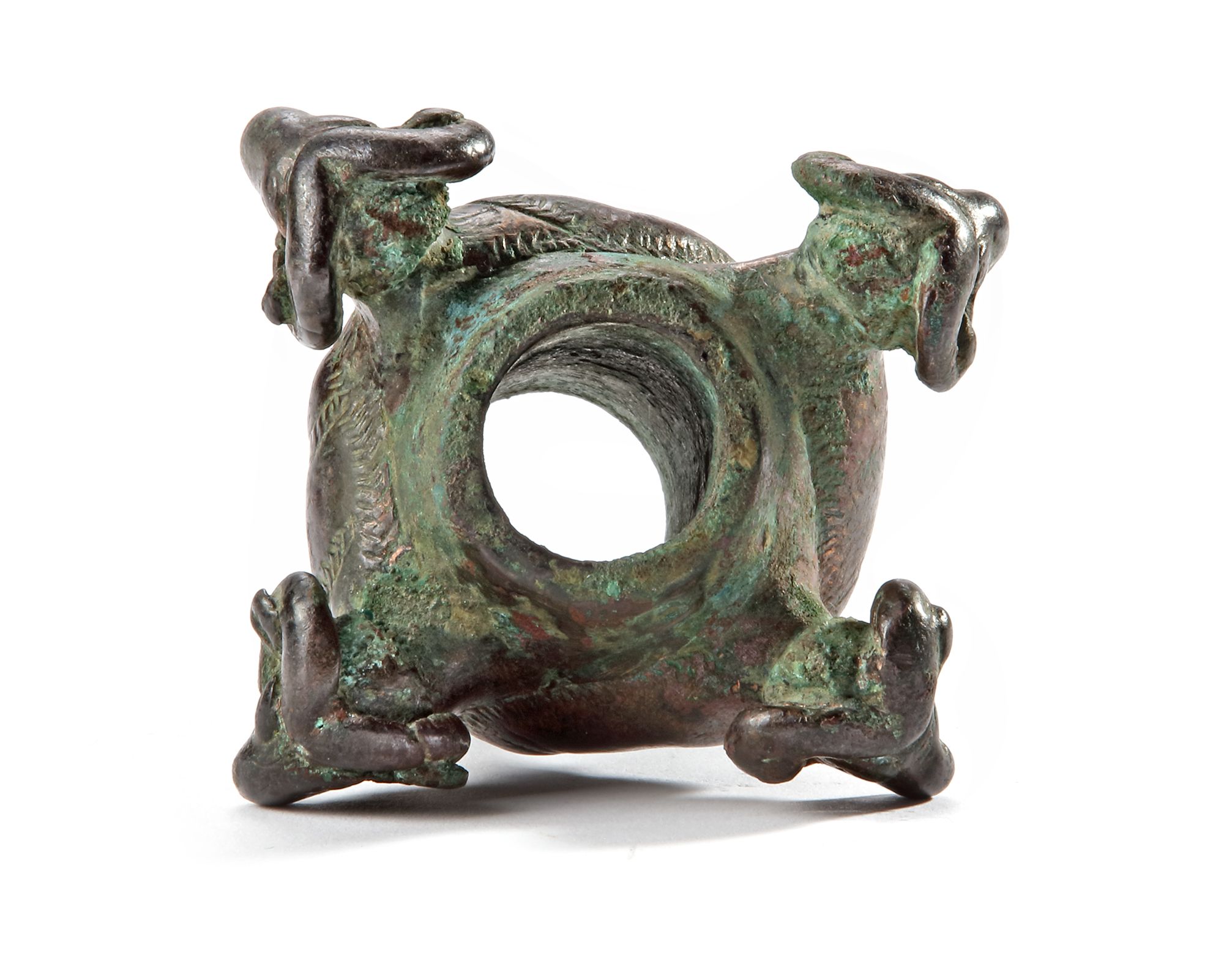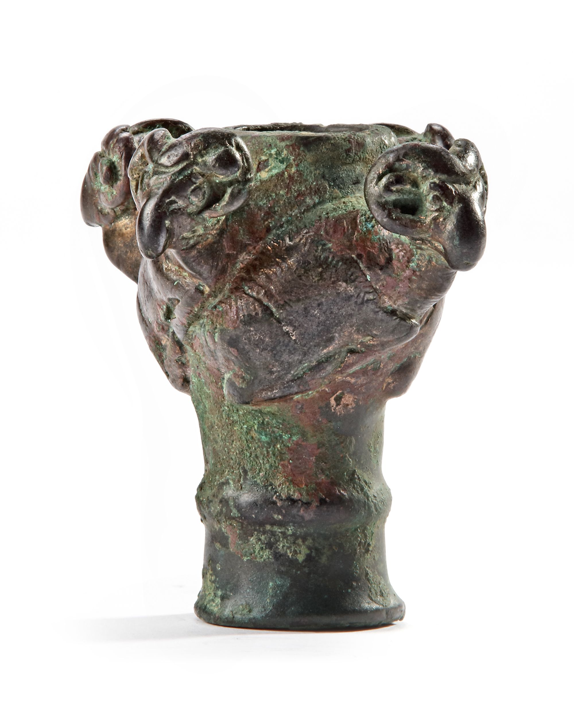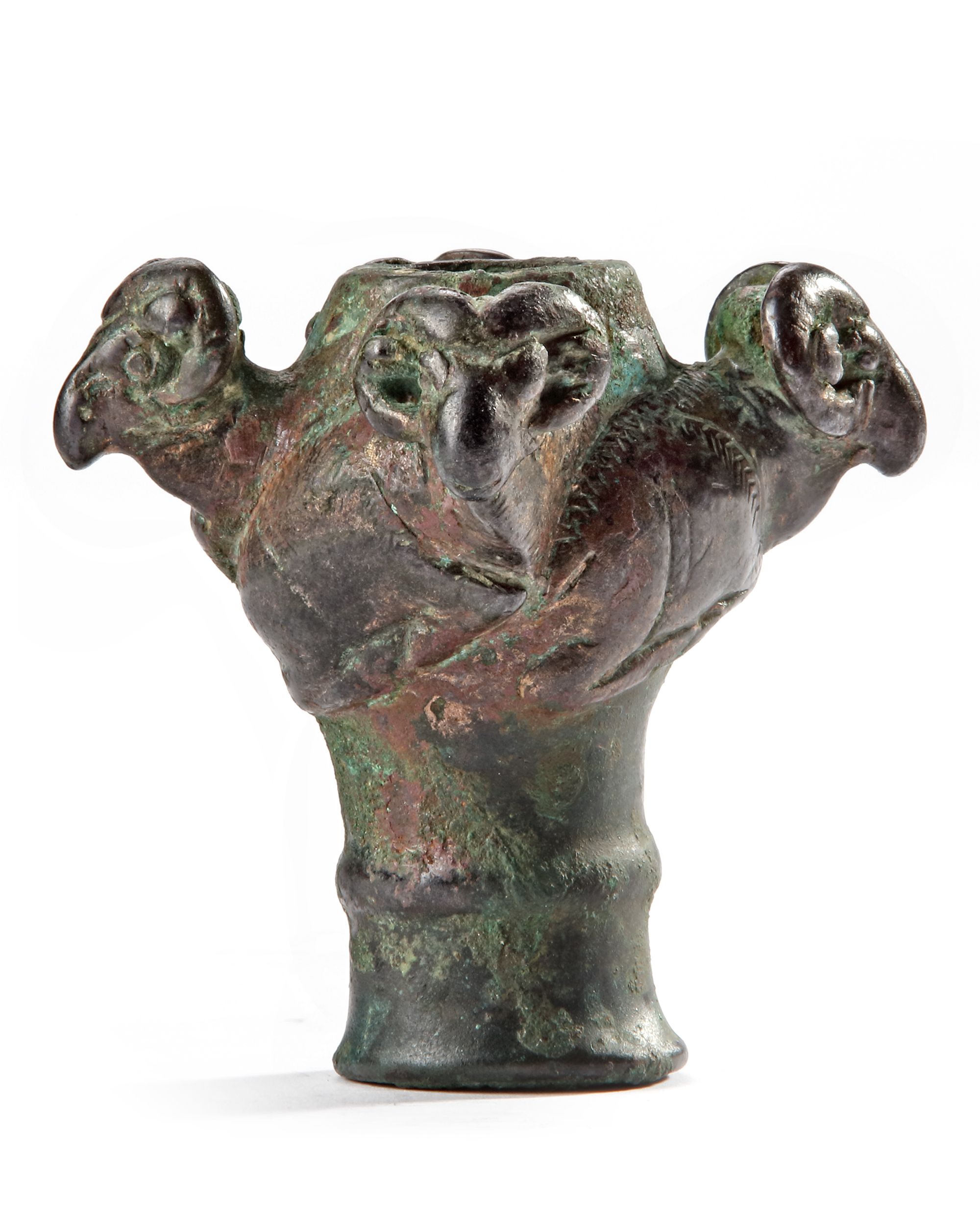 An elegant bronze mace head from Luristan. The mace head is decorated with four reclining rams with large curved horns, the protruding heads provide the appendages to the mace which would have served originally the function of a weapon. By this period these decorated maces are thought to be ceremonial although their abundance suggests that they may still have been used in warfare.