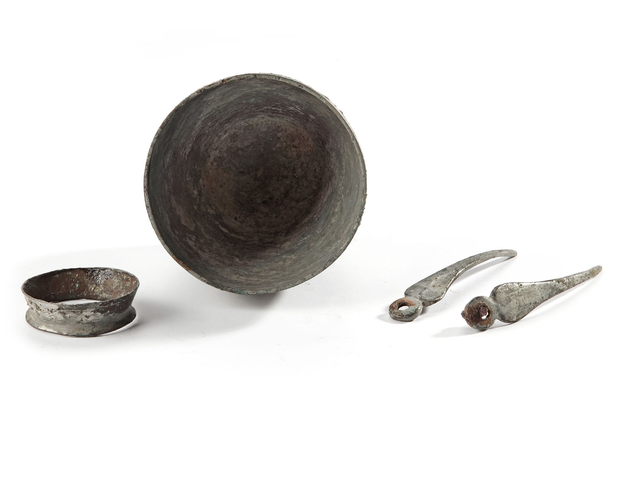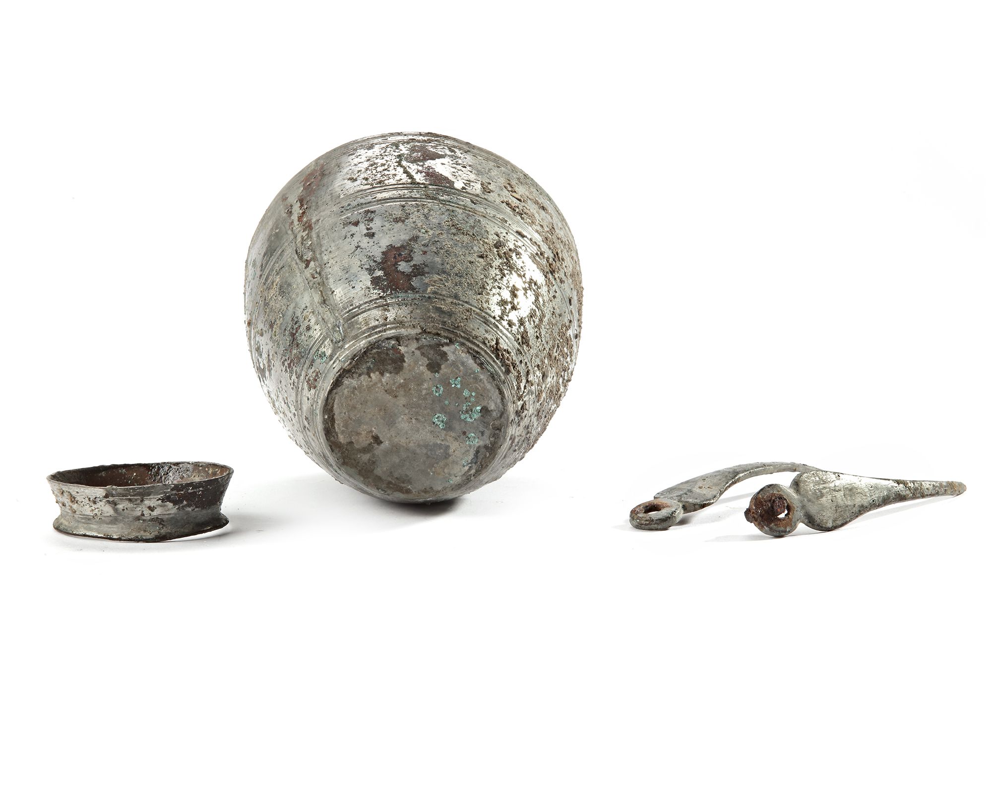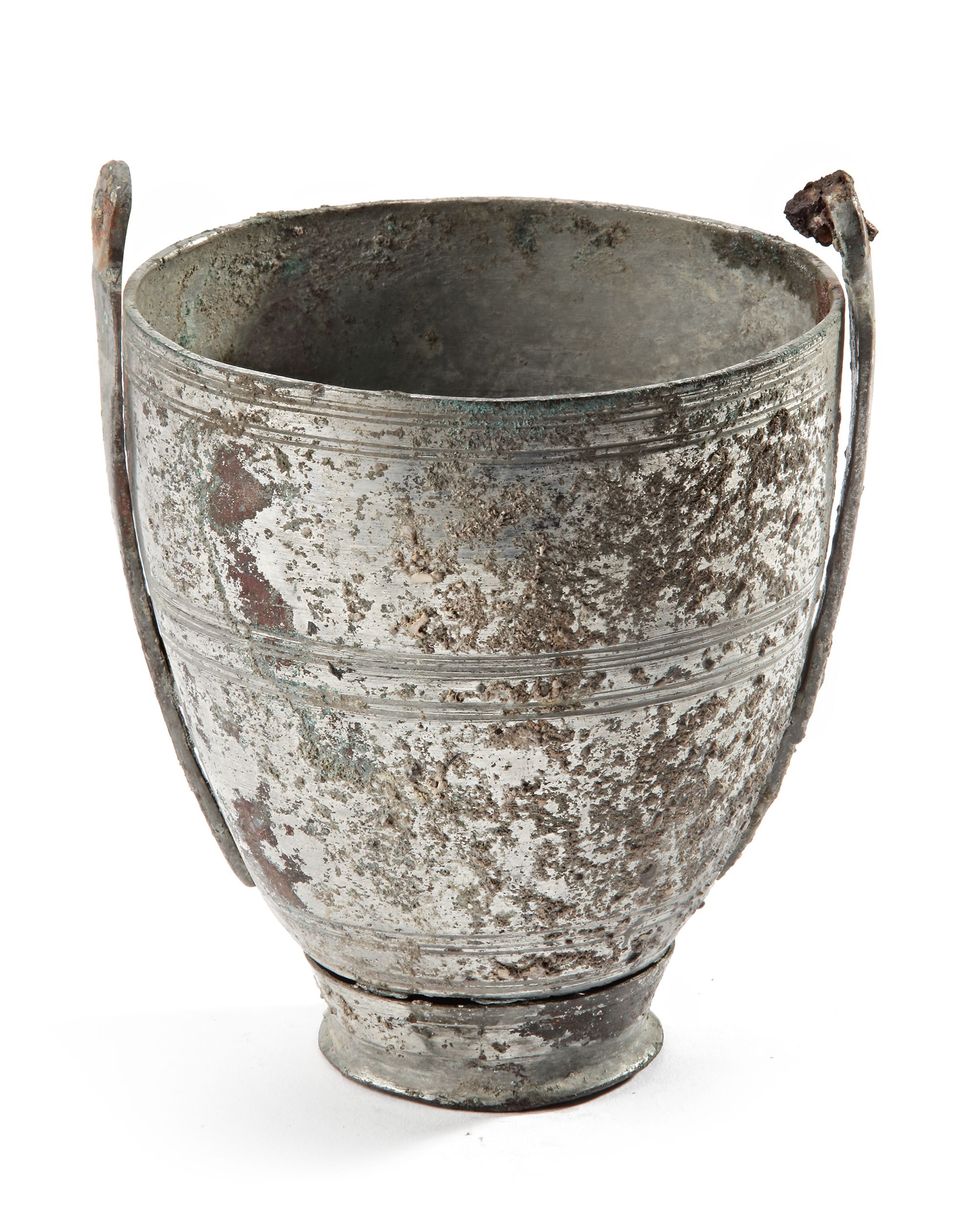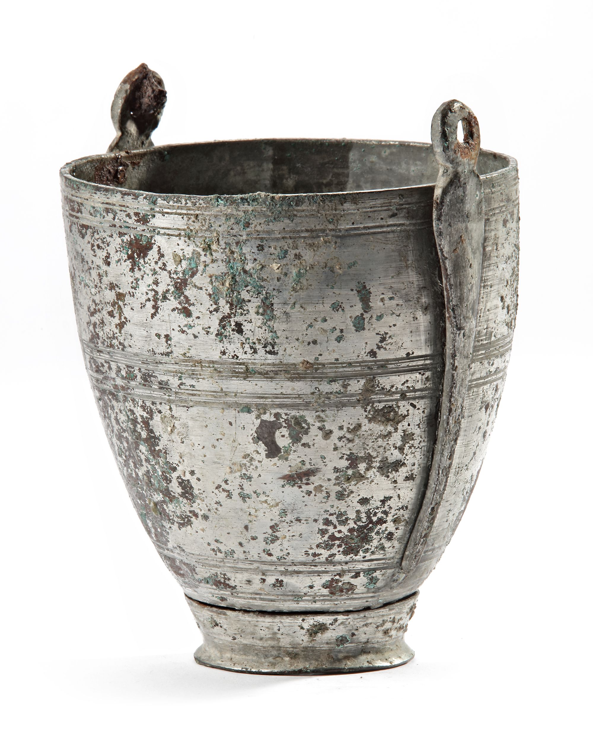 A heavily tinned small situla. The vessel is made from bronze which has been heavily tinned and then burnished on a lathe. The handle has now rusted being of iron, however the two lugs are extant made in the form of long drops which were soldered to the body. A ring base is also still extant which would have been soldered to the base of the main body.