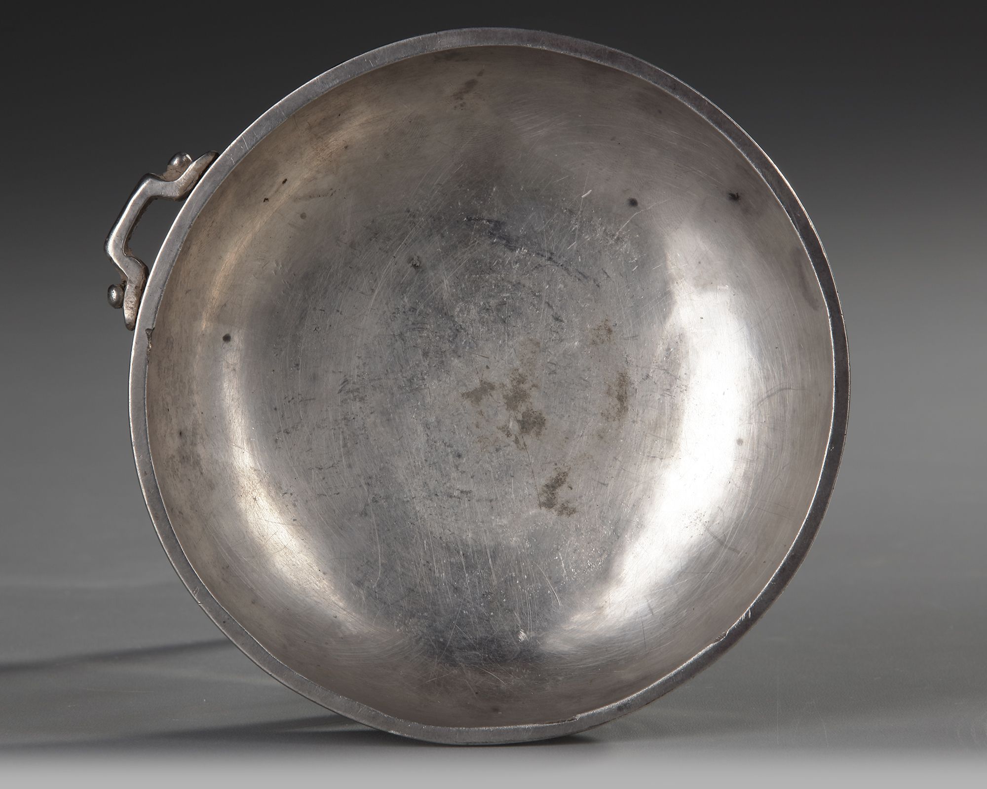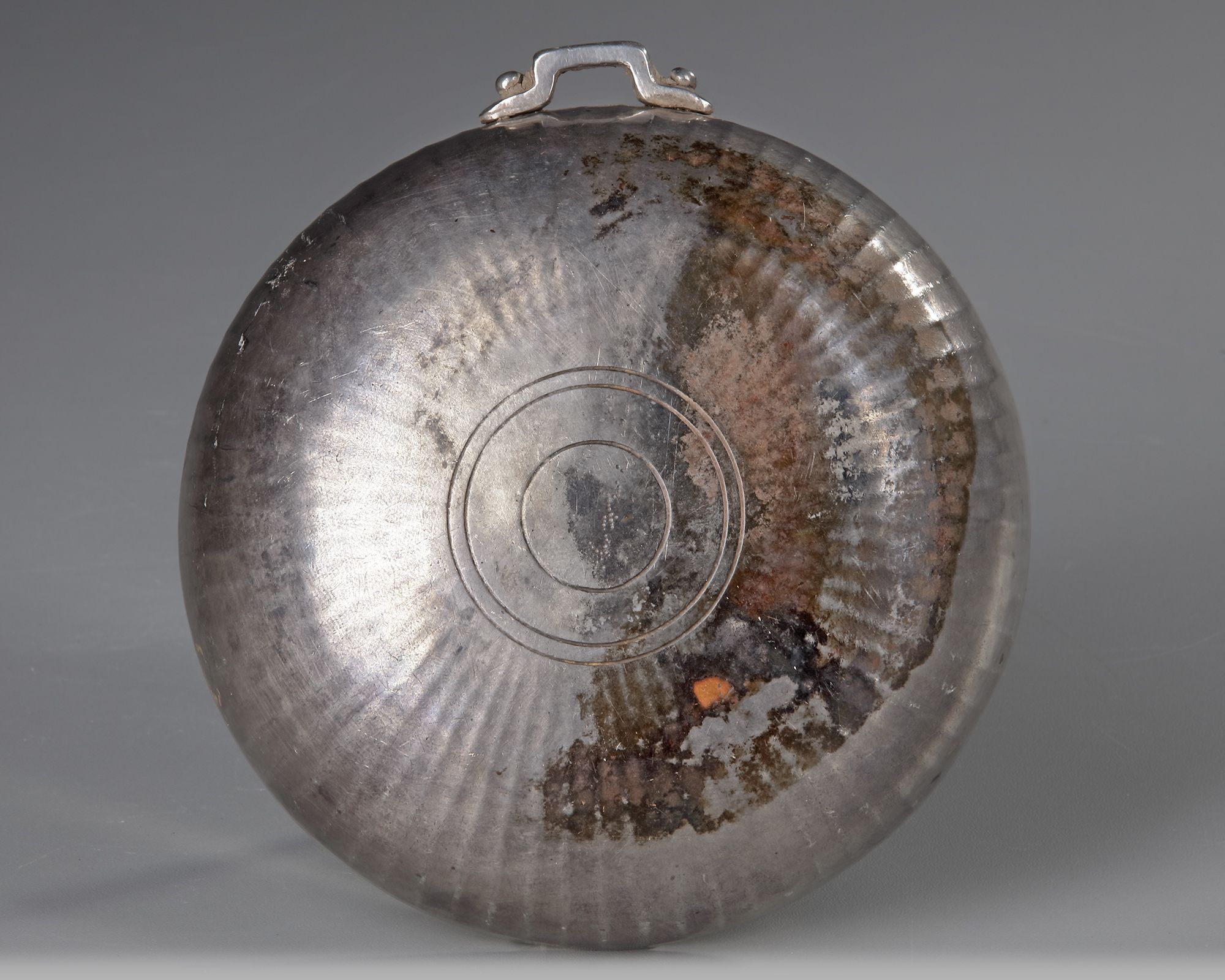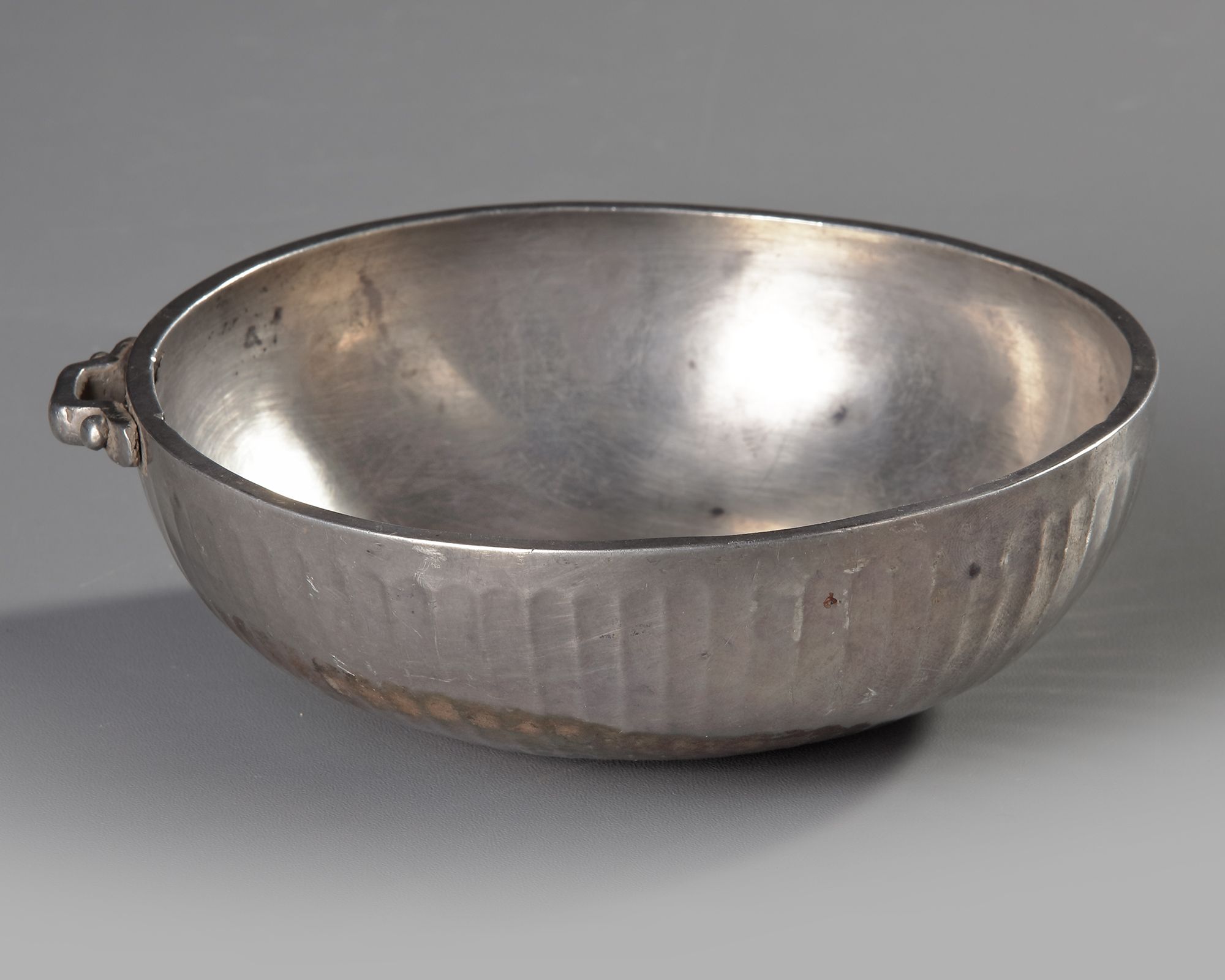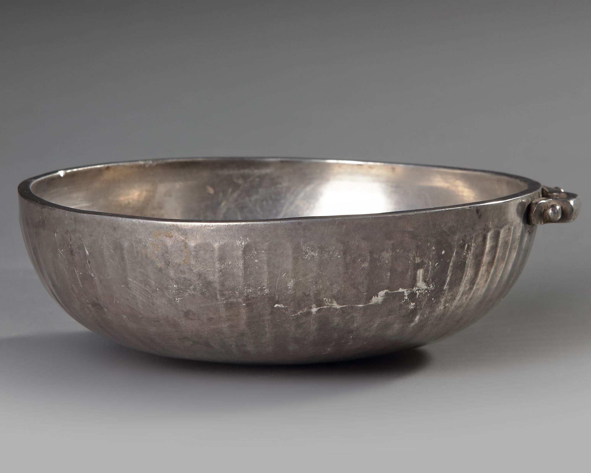 A shallow silver drinking bowl with a attachment for suspension held by two rivets. The outside is decorated with radiating fluted shallow groves. At the centre of the bowl three concentric engraved circles define the centre of the bowl. At the centre lies a three letter Pahlevi inscription.