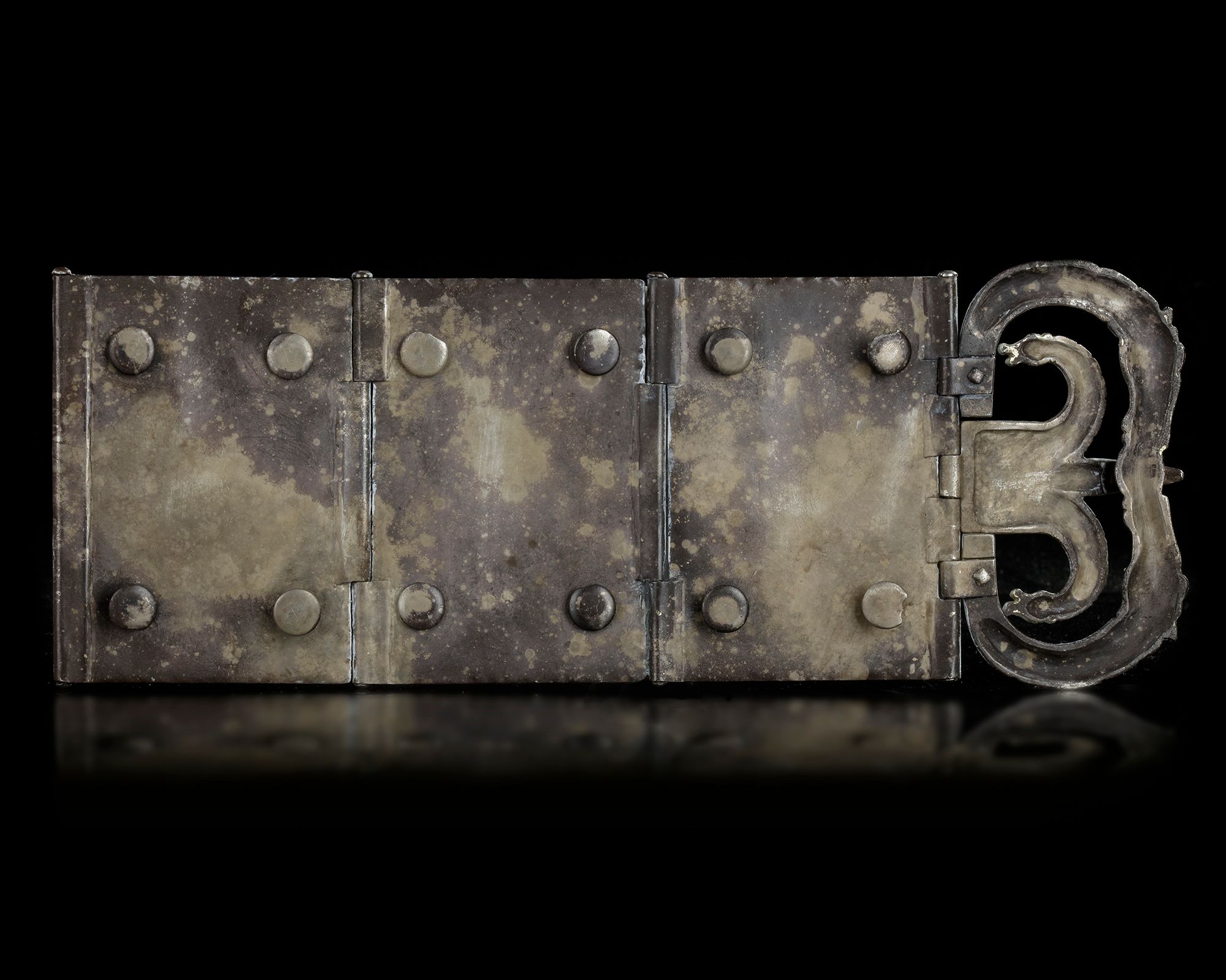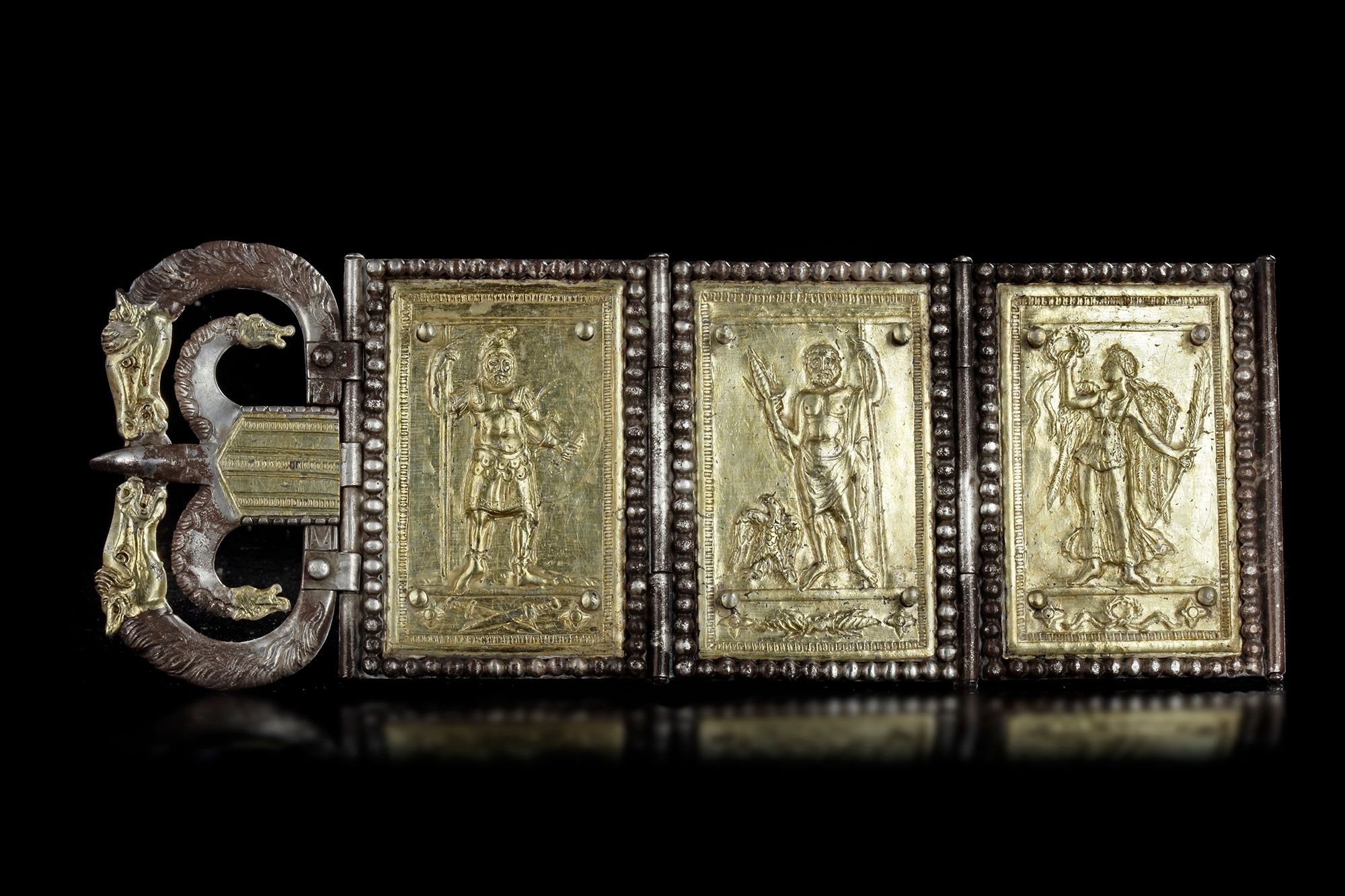 Made of multiple elements of silver sheet, strips, beaded wire and rods: hammered, cut, chiselled, punched, grooved, folded, chased and repoussé. Certain parts mercury-gilt: the plates, loop and tongue save for the beaded borders and hinged sections.This belt fitting [2] is composed of three rectangular plaques with a buckle and hinge pin. The central panel shows Jupiter standing holding the thunderbolt and scepter with an eagle at his feet. Below the ground line is another thunderbolt. Flanking Jupiter are Mars and Victory, respectively on the left and right. This ensemble compares very well with the specimen in the Ortiz collection and might be a little earlier date wise as the work is less schematic and the details are chased with more realism. 22.6 long 8.2 high. Silver with gold/mercury building. Roman 4th.c.A.D.