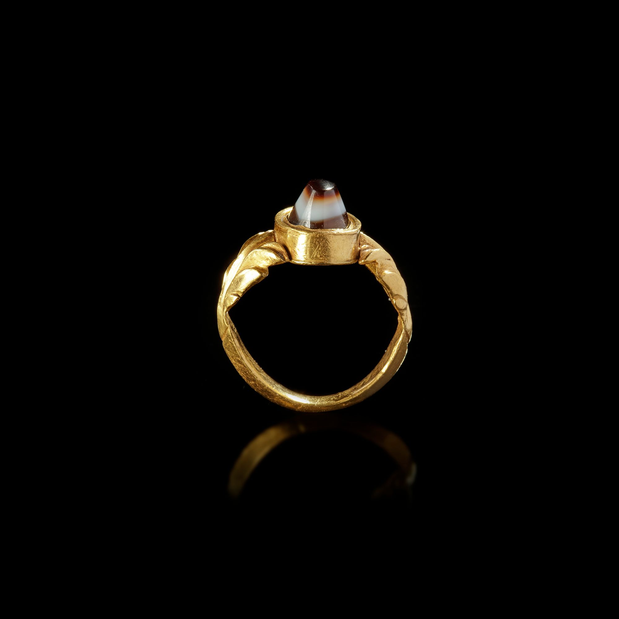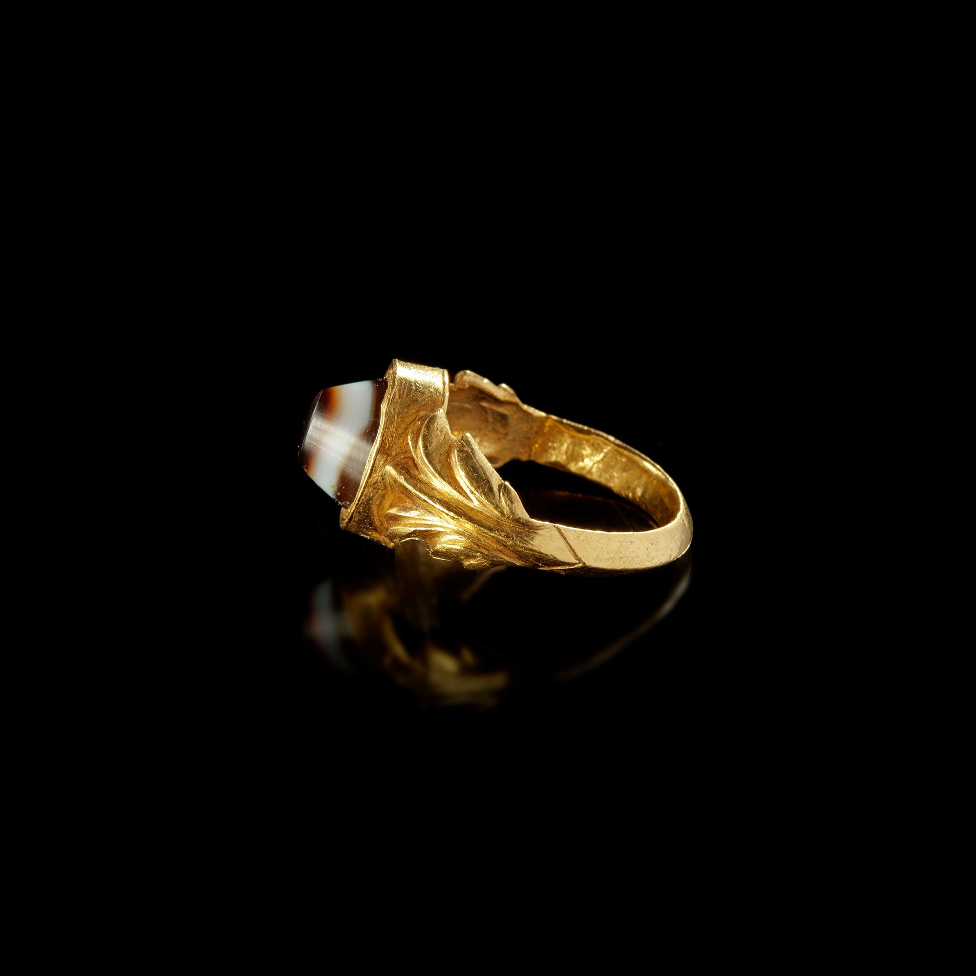 A Roman gold ring with an elaborate shank ending in palm or acanthus finials which grasp the bezel which holds a banded agate/sardonyx conical stone.