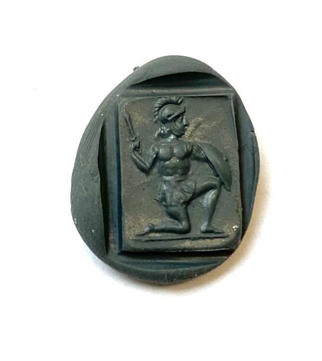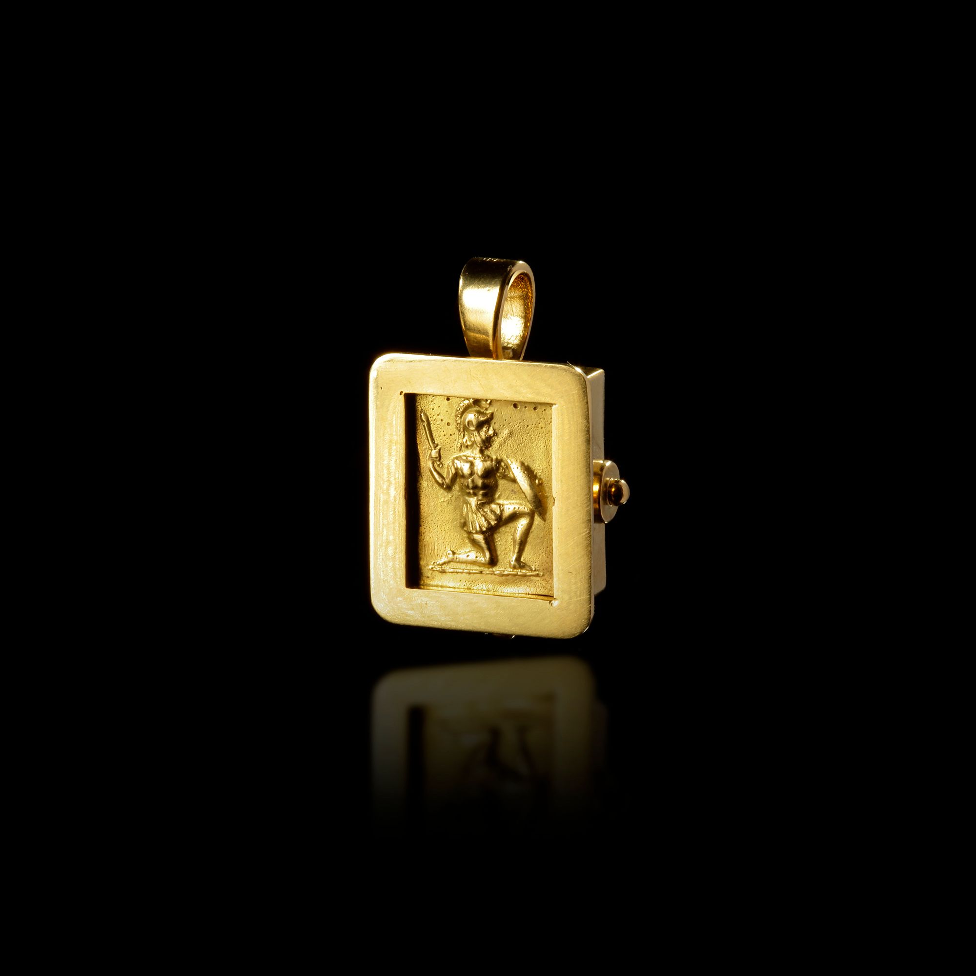 A red jasper square intaglio showing a Greek or Trojan warrior kneeling in a position of defence. The subject might come out of the Trojan War as the Romans did identify themselves with the Trojans against the Greeks. The square shape of the intaglio is unusual but known. The modern pendant mount has small diamonds on the lateral bosses on the mount while on the back a cast of the intaglio has be inserted into a frame. No hallmarks.