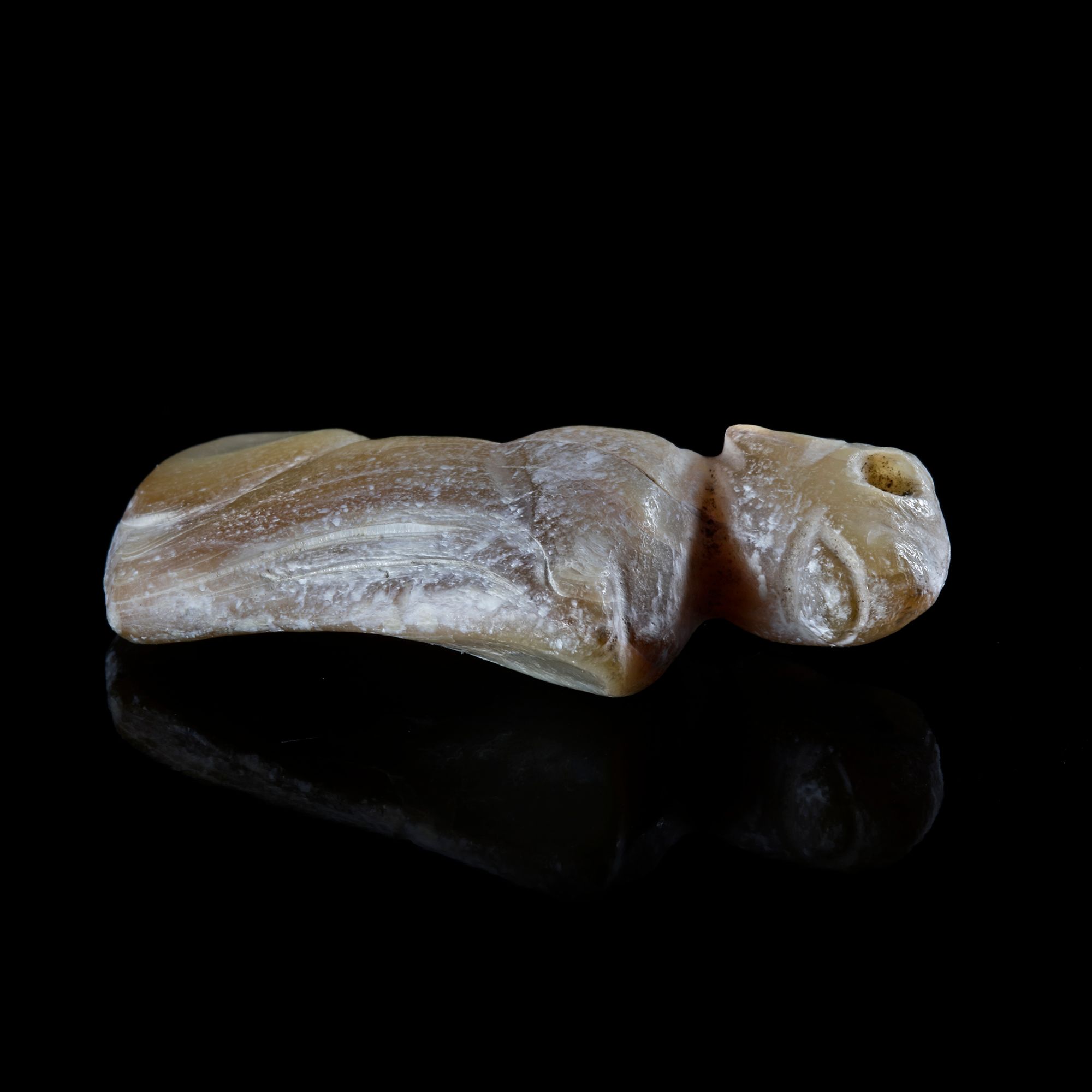 An amulet in the shape of a reclining bovine in shell. 4.7 by 2.5 cm. 16.7 gr.