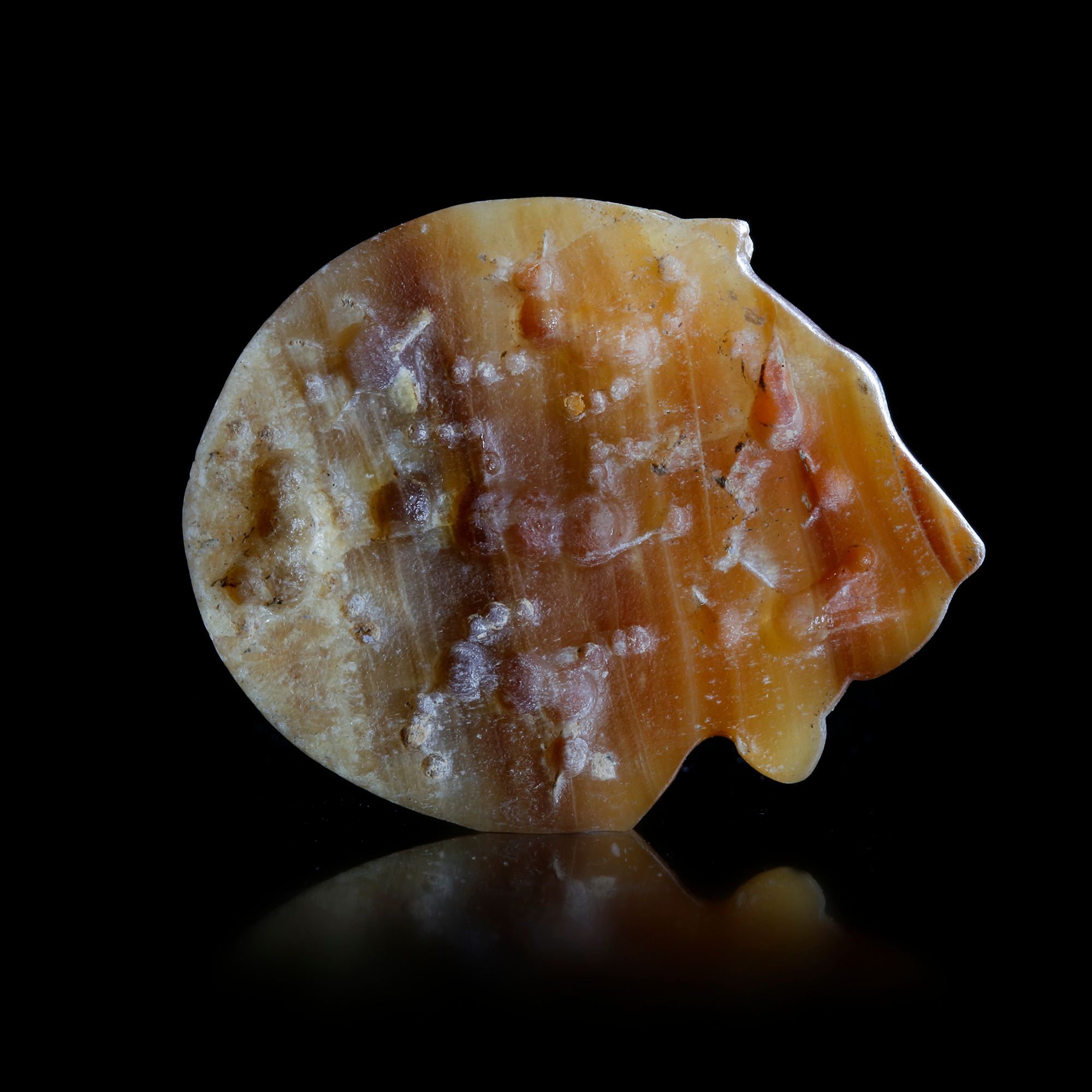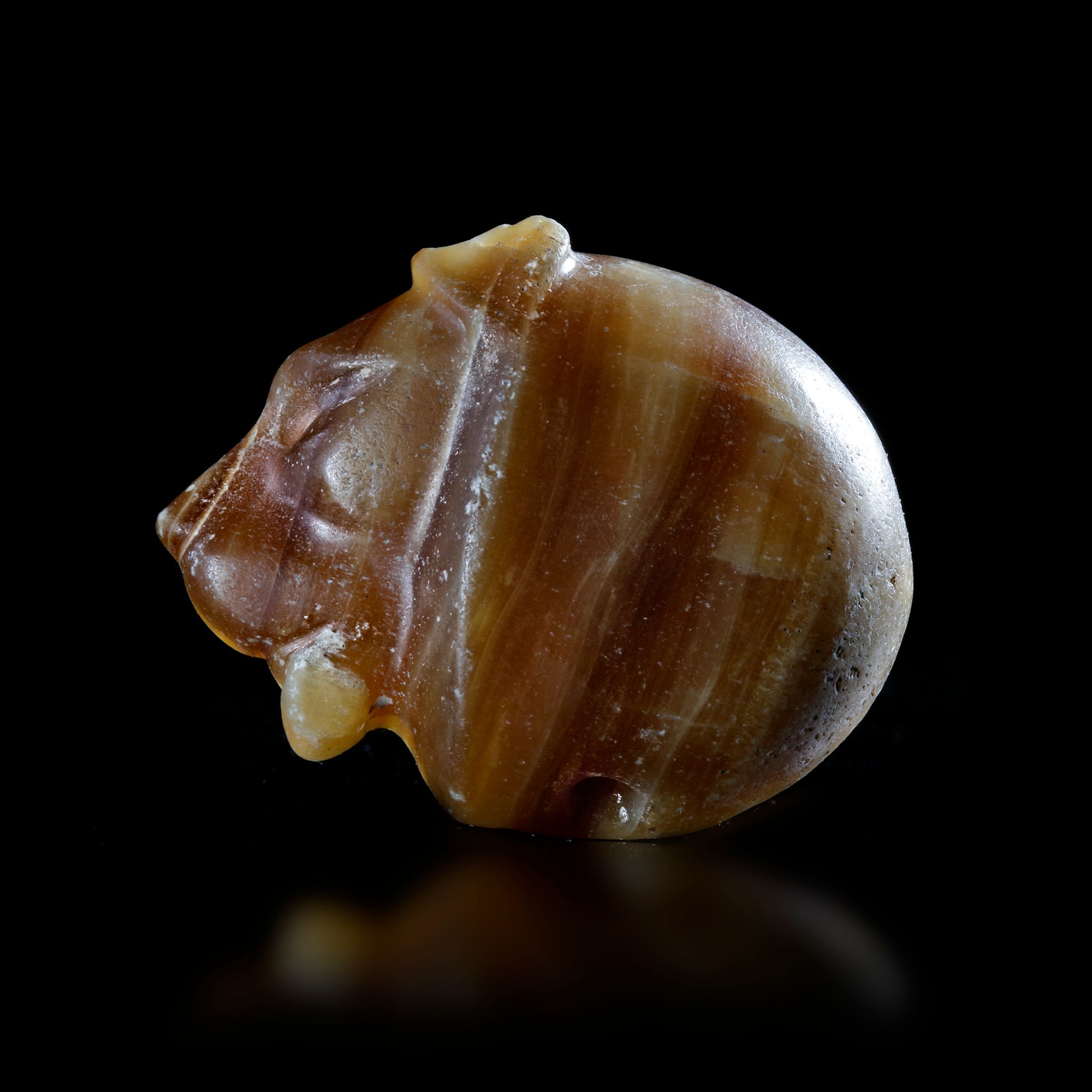A magnificent seal in brown striated calcite of a lion's head looking left. The seal on the back has five animals and two birds, of fine style.