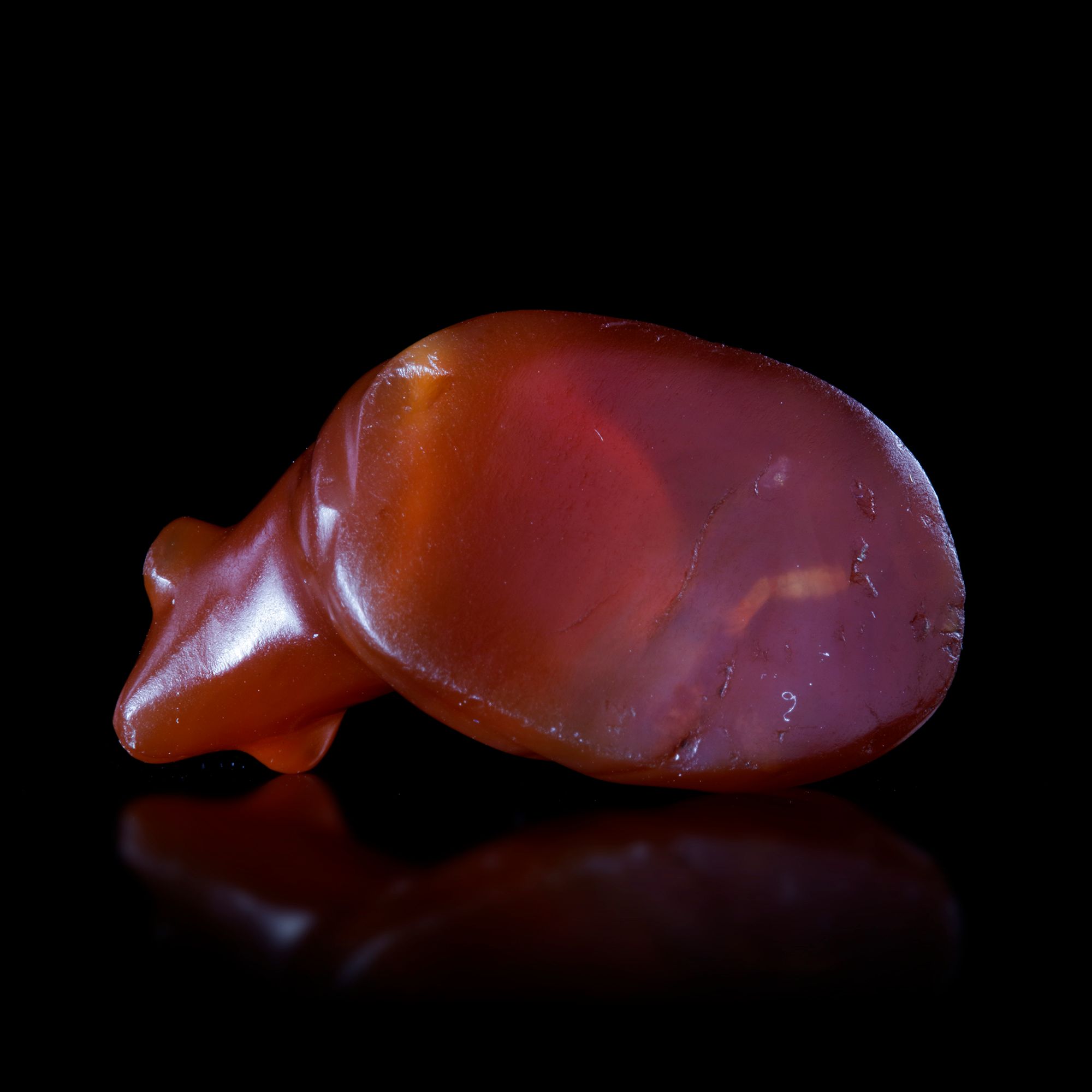 A carnelian amulet in the shape of a reclining bull/cow. A suspension hole is placed near the base of the neck. 24 mm.
