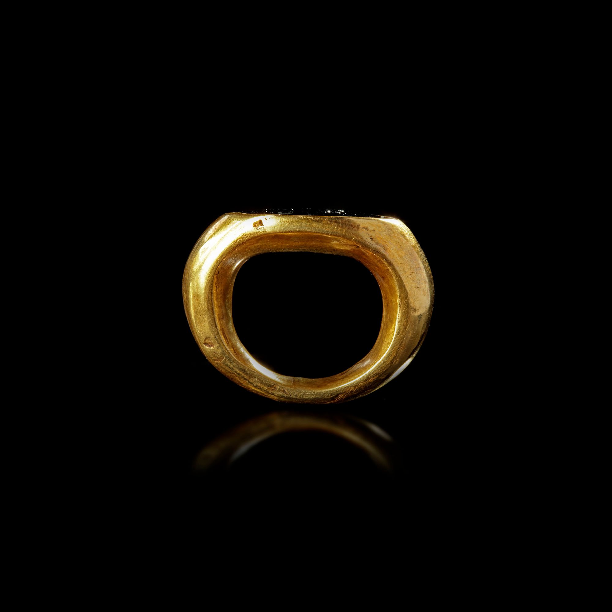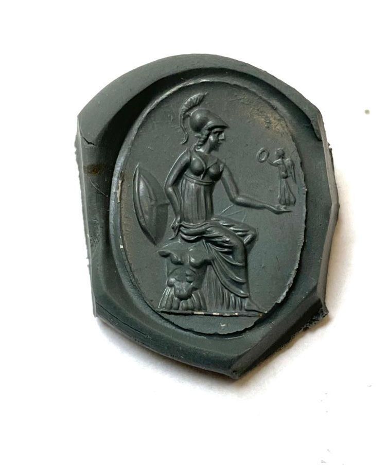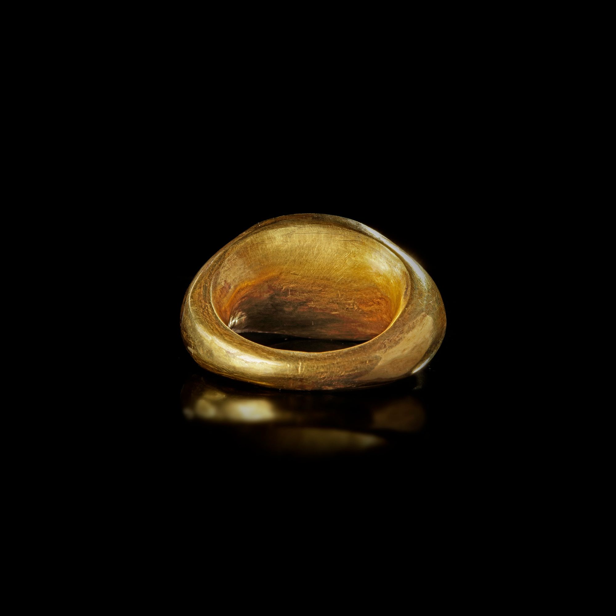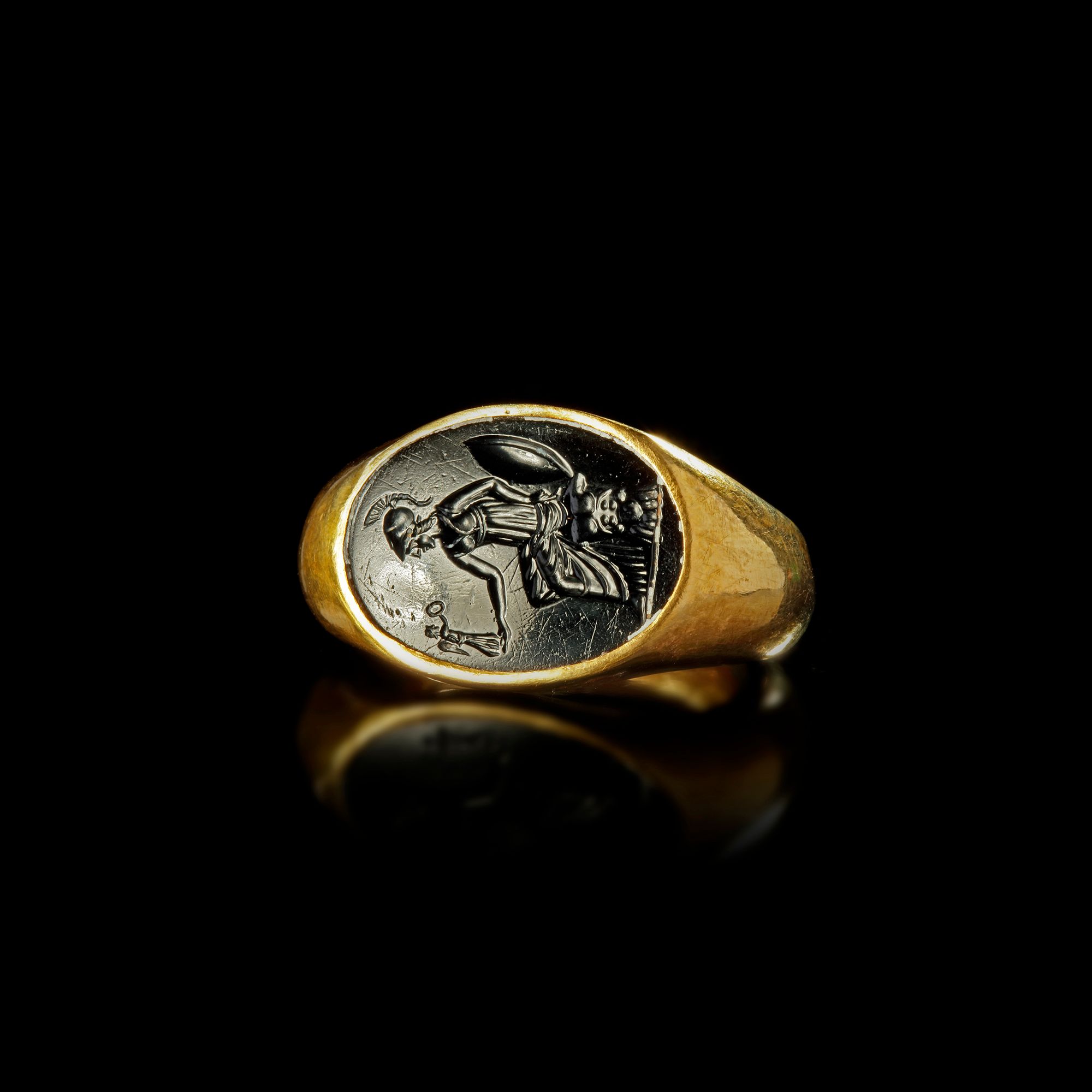 A large Roman hollow gold ring with a black jasper intaglio of Minerva/Athena sitting on a cuirass holding a statuette of Victory and a shield balanced behind her. Minerva was one of the Capitoline Triad so she was very fundamental to the idea of 'Romanitas'. It is hardly surprising