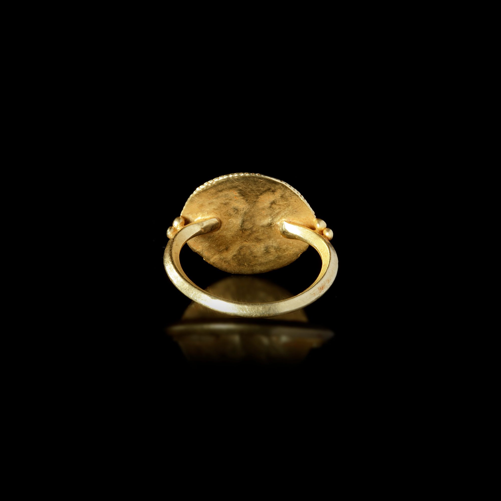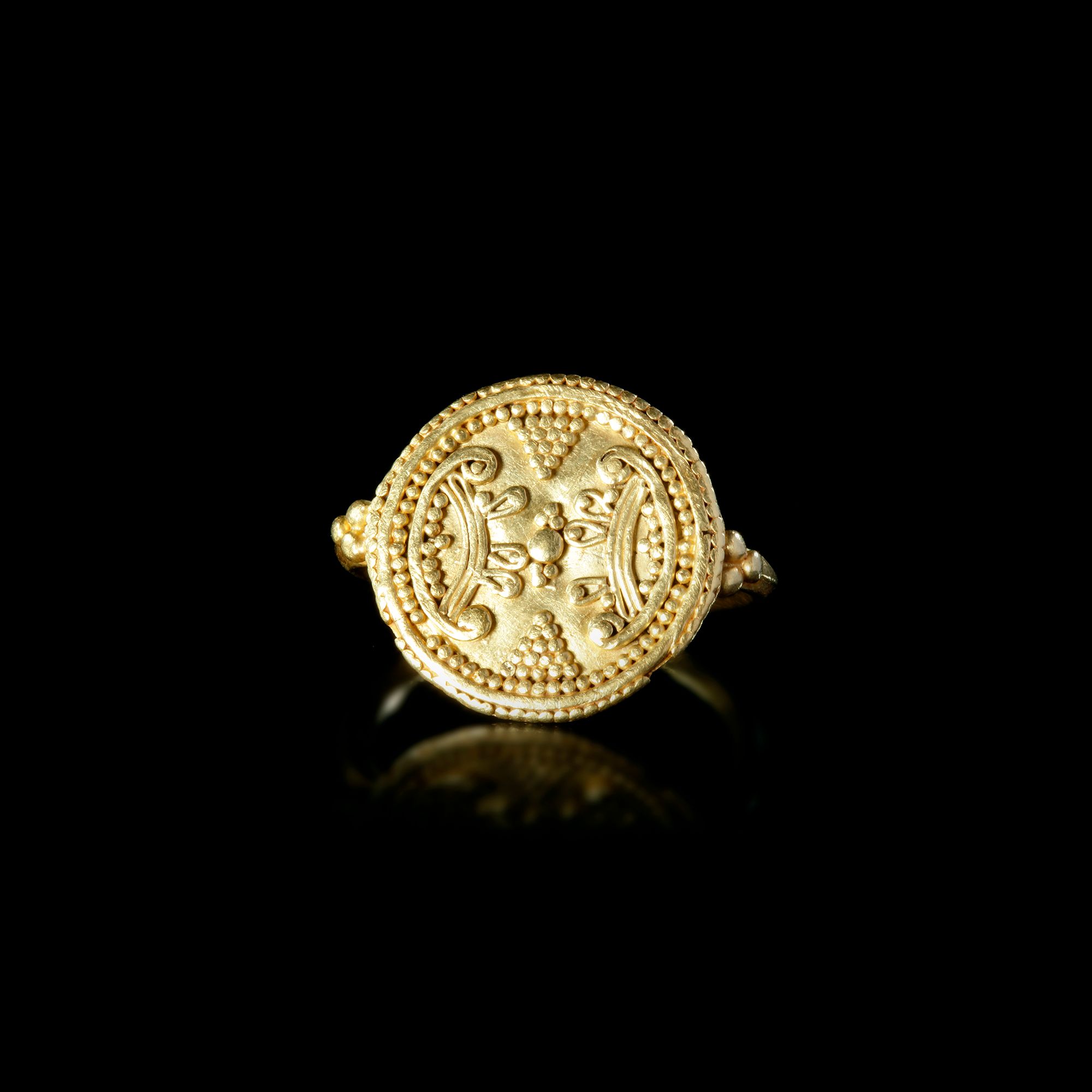 A ring in pale gold with a round bezel and simple shank made from a square sectioned rod. The bezel is decorated with filigreed granules including two representations of gold necklaces which are the hieroglyphs for the word 'Good gold' or 'negev'. Whether the wearer would have had any idea of the significance of this is an interesting question. The type might have been simply schematic but given its elaboration this is unlikely to be the case.