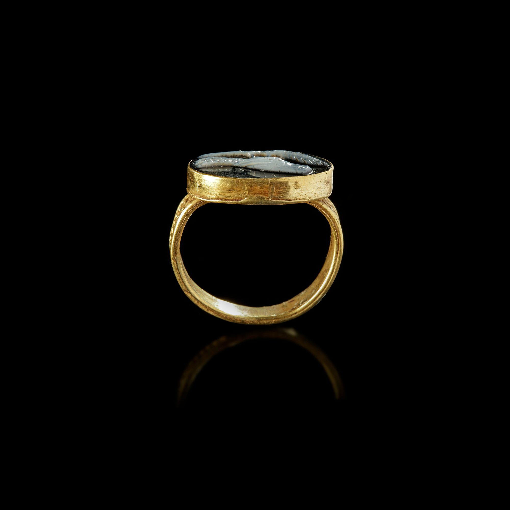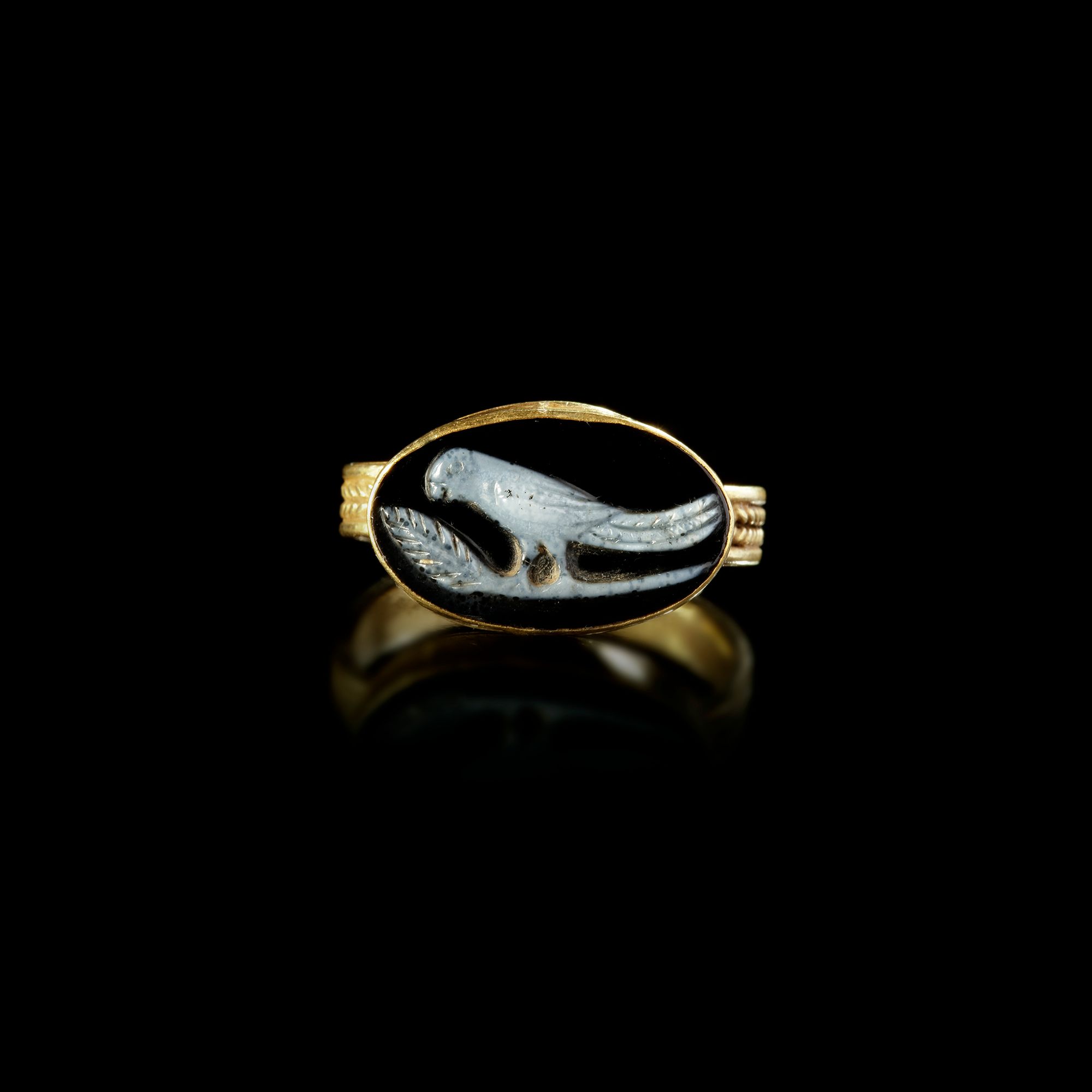 An early Byzantine/late Roman ring with a Roman cameo of a parrot perched on a palm frond. The parrot was a popular subject in the early Empire, no doubt for its intelligence and guile. This ring is a good example of an earlier stone, or inlay, being used in later antiquity. The reason for this relatively common phenomenon is that after the third century A.D. the skills of glyphic carving rapidly declined in the Roman Empire. By the fourth century only a few workshops remained in the metropolitan centres such as Rome, Constantinople and Alexandria. Even then, the output was small and often quite crude. Therefore earlier stones must have been stocked by merchants who would offer their clients the work of earlier centuries. This practice continued through the ages until in Renaissance Europe the engravers of the classical period could be matched.