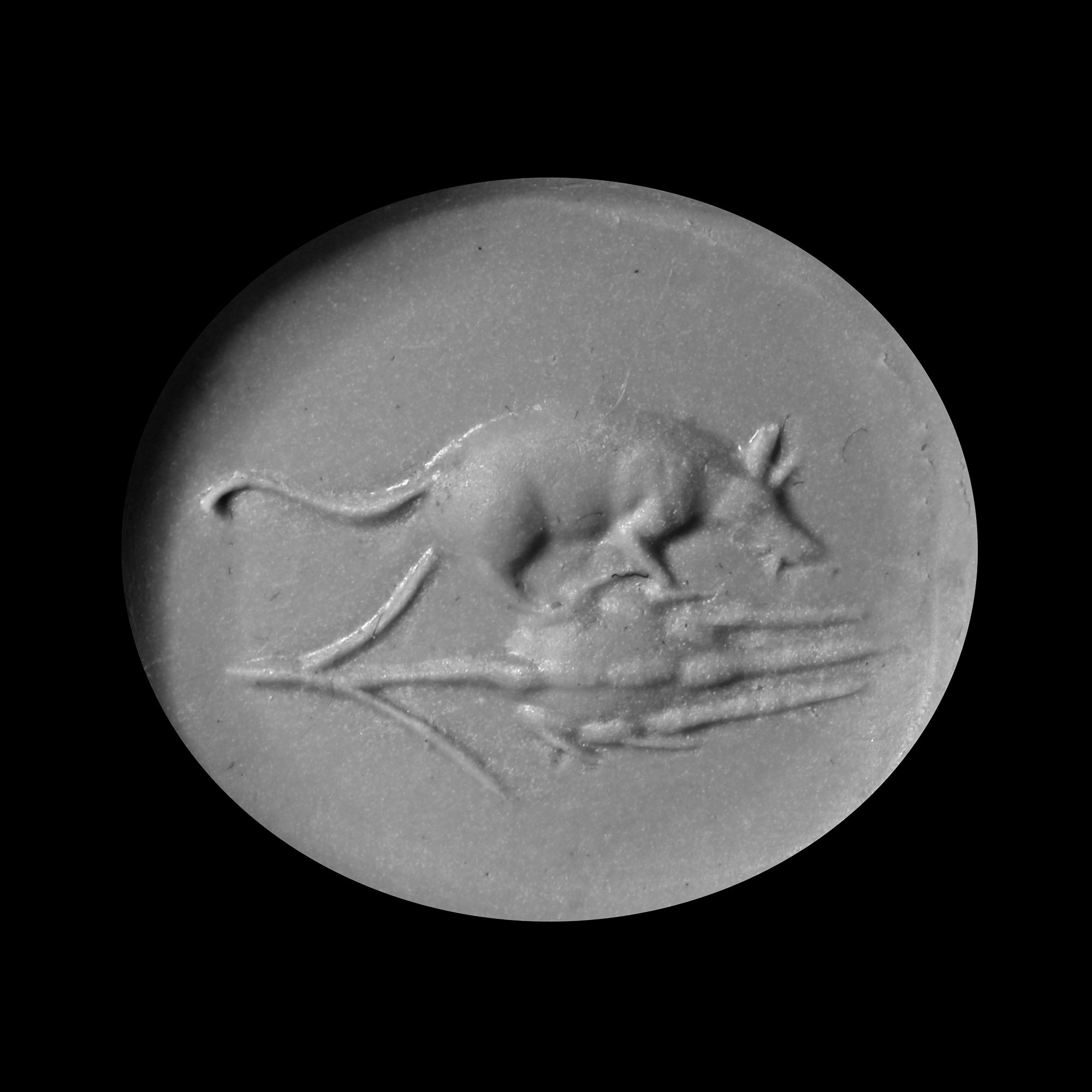A Greek scaraboid seal from a dark grey/brown stone with white inclusions. The seal shows a mouse or rat on a corn sprig.