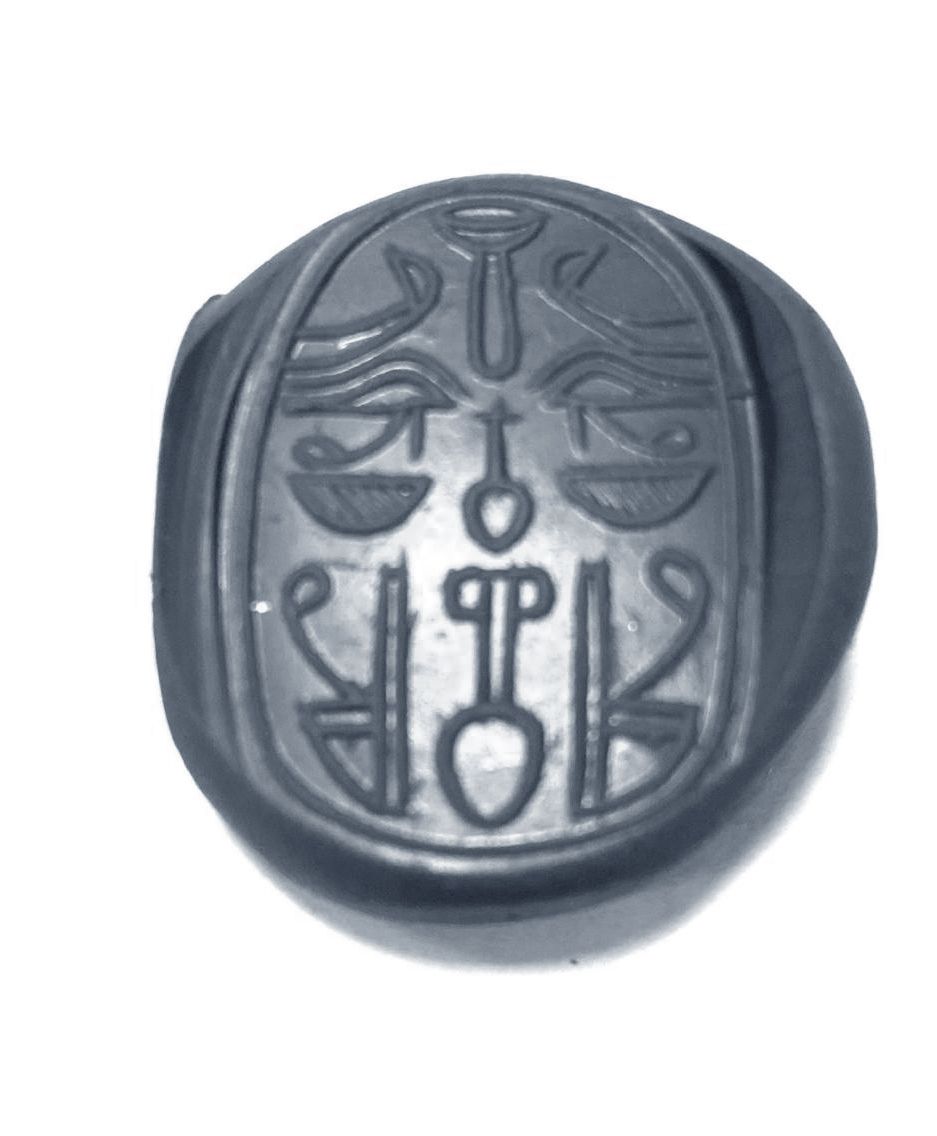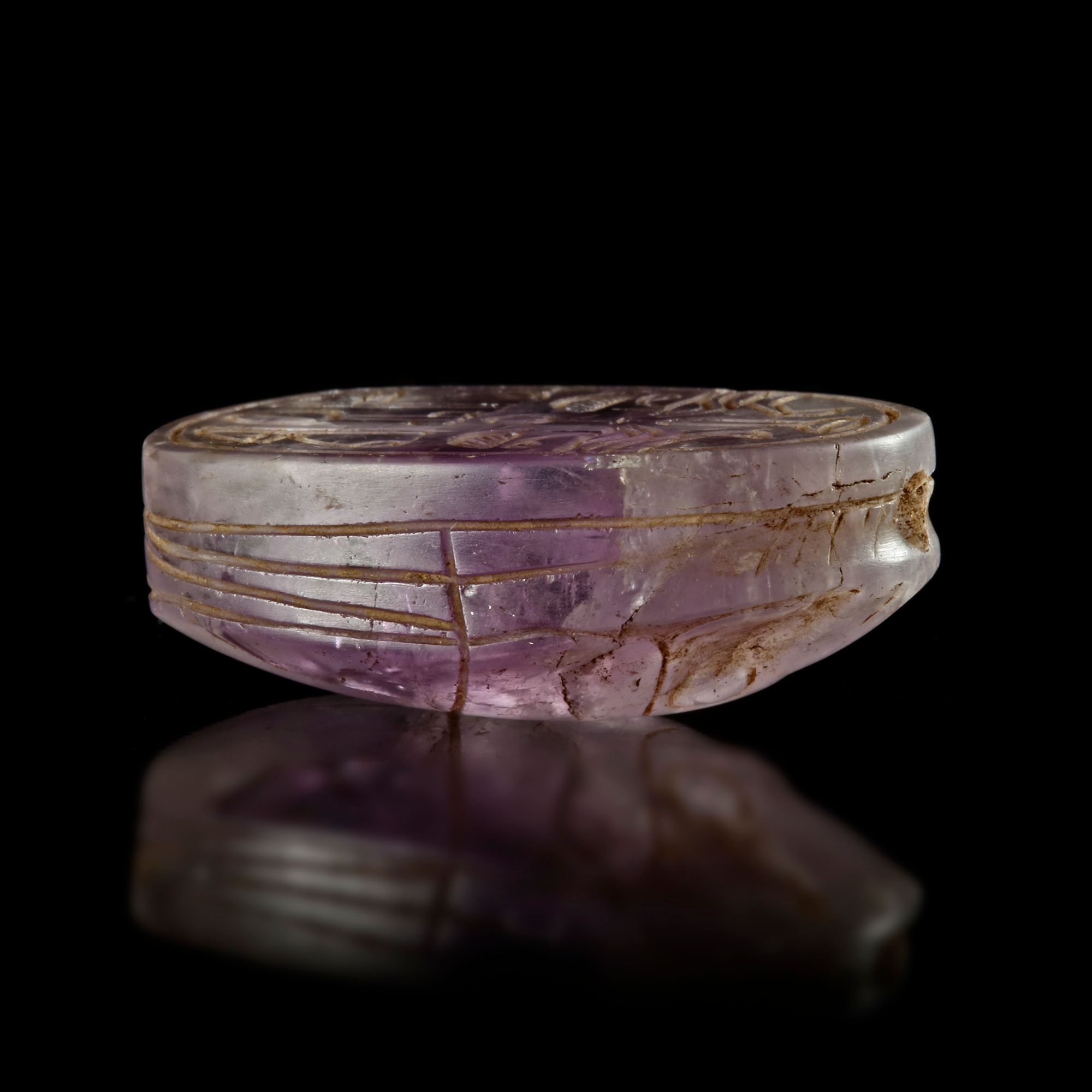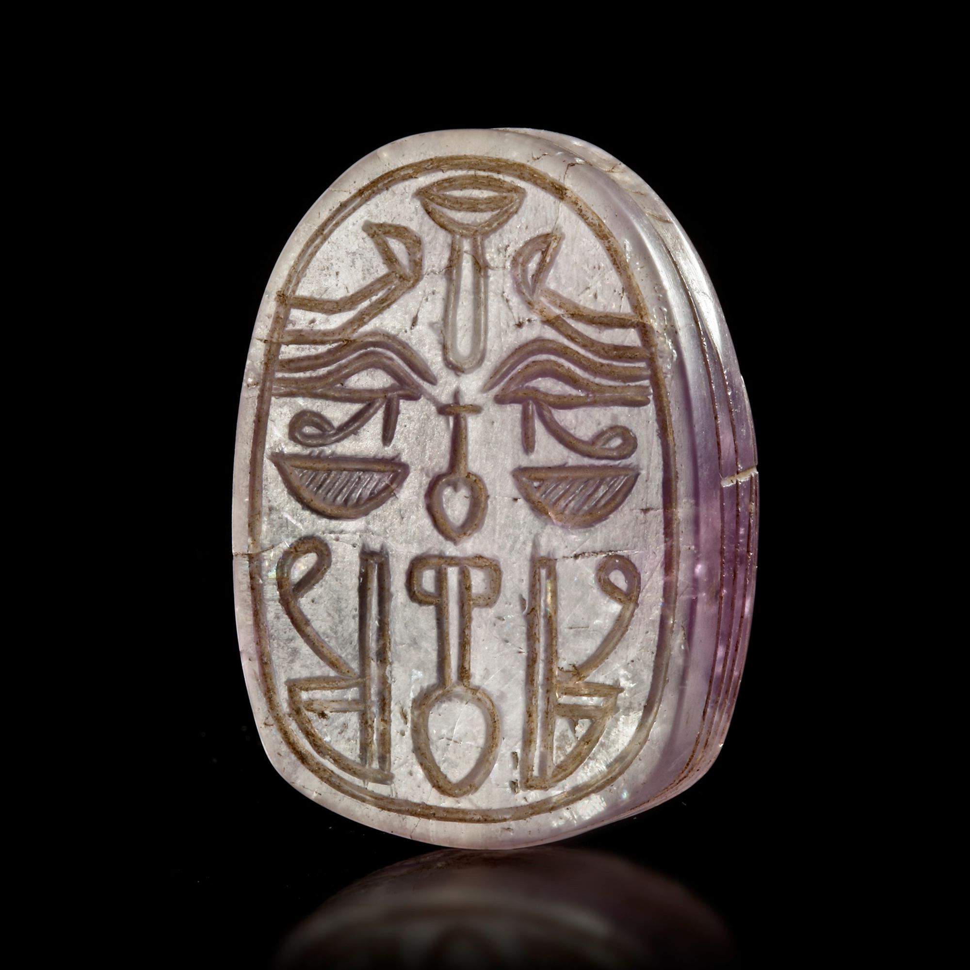 A large amethyst scarab seal with hieroglyphic symbols on the back. Amethyst Phoenician 6/7th.c.B.C. 35 by 25 mm.