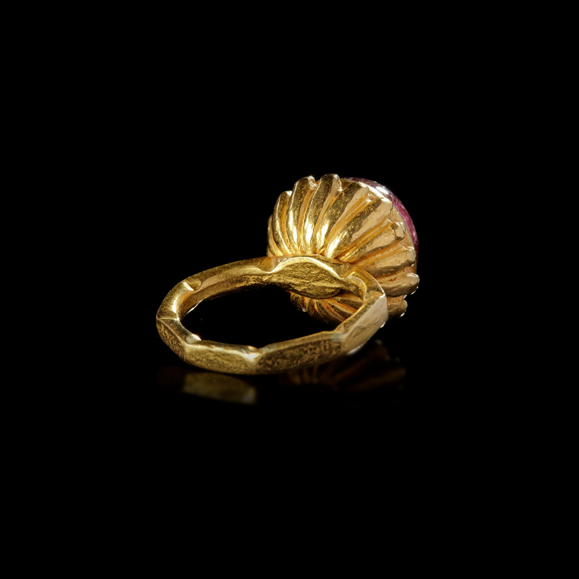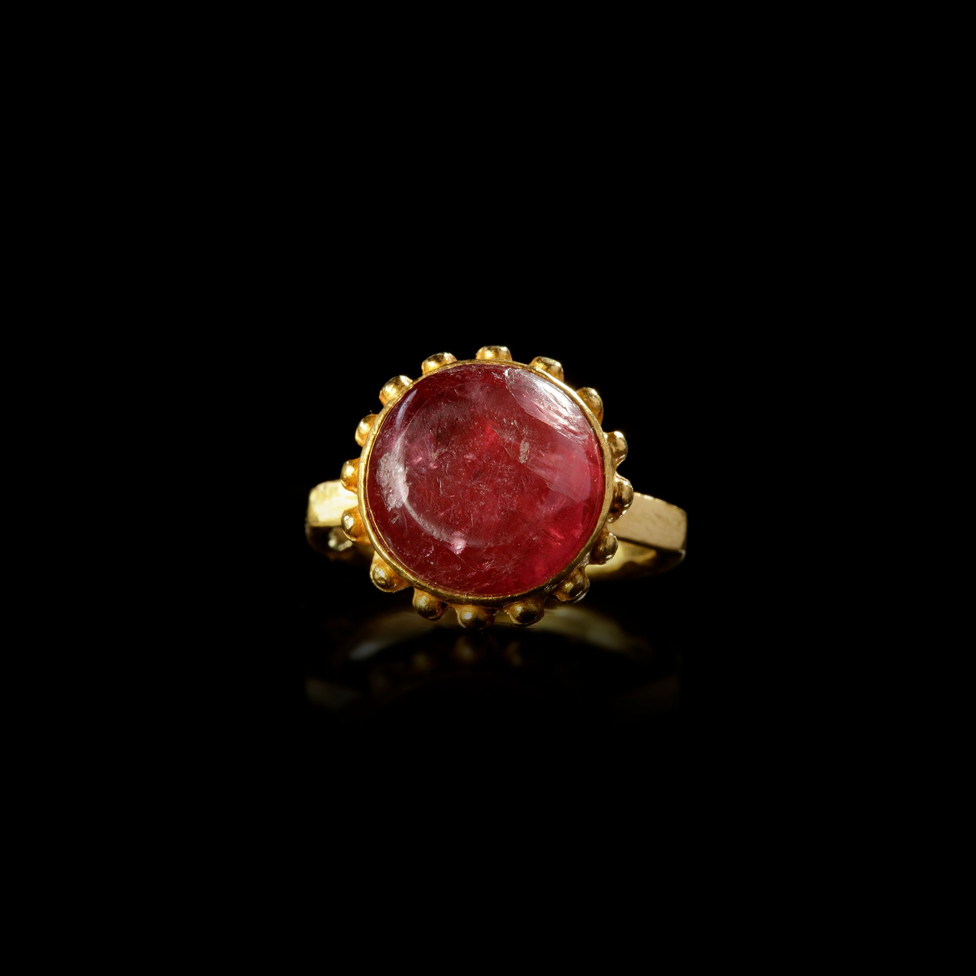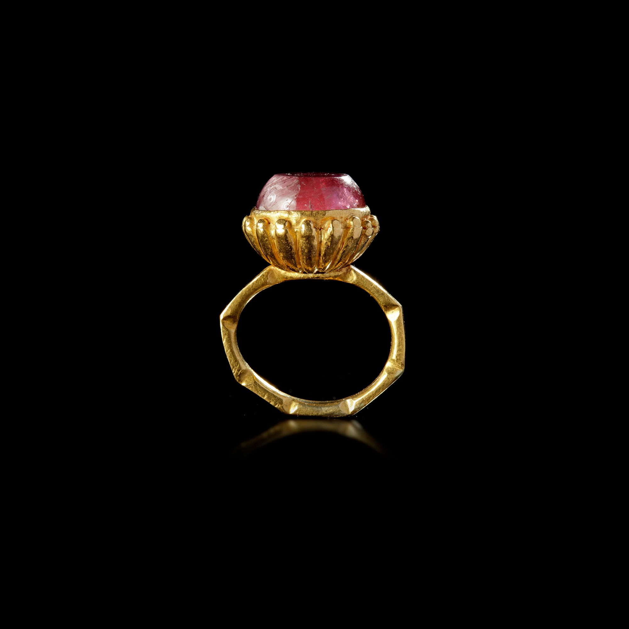 A large Byzantine gold ring, of the so-called 'basket' type with an octagonal shank. The bezel is made of a repousse bowl with ridges in relief to which are soldered solid globules. The stone is a cabochon spinel or a similar crystalline red stone, with the top cut or polished flat.