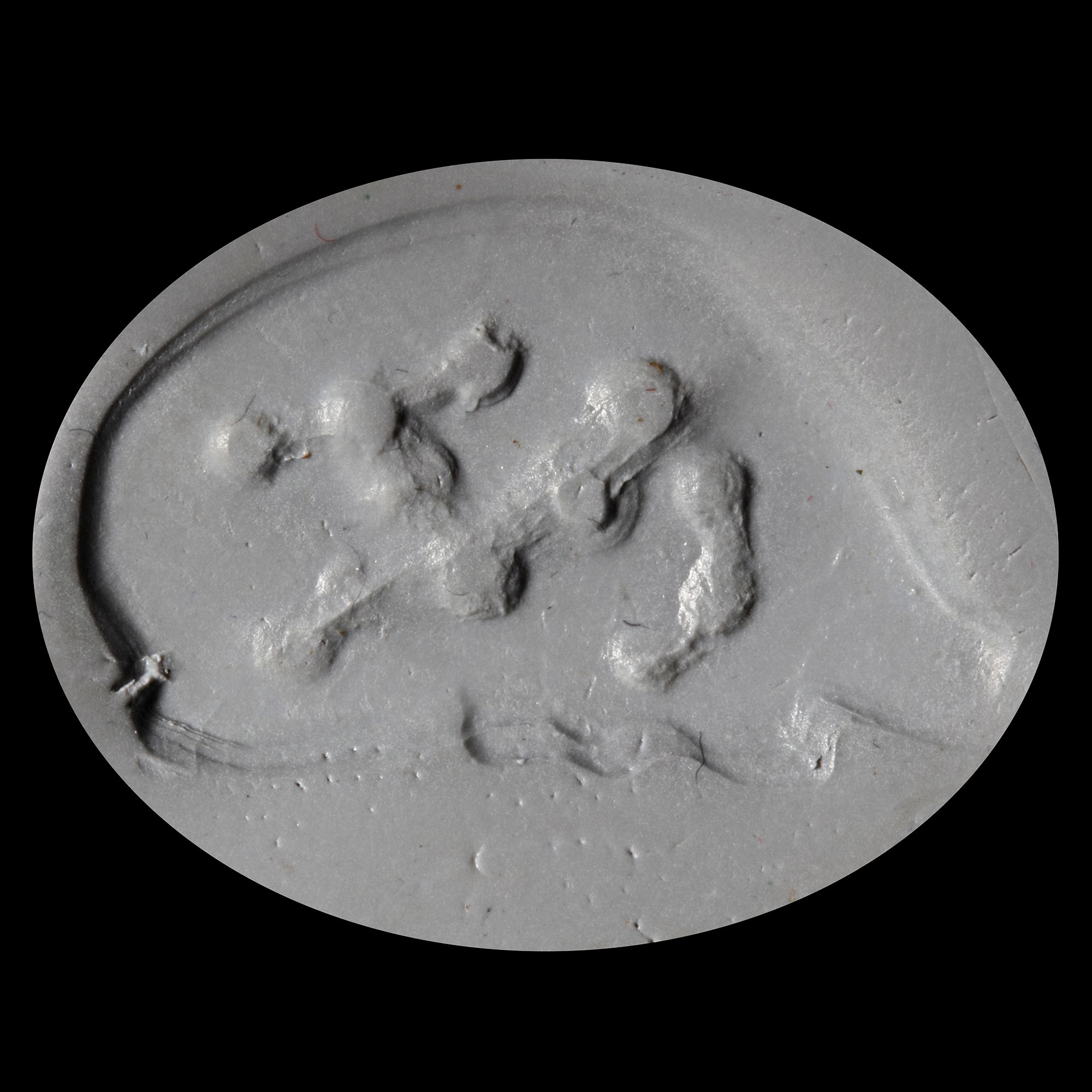 A seal in the form of a reeling pig/boar in calcitic limestone. The seal shows an animal in profile possibly a canine.