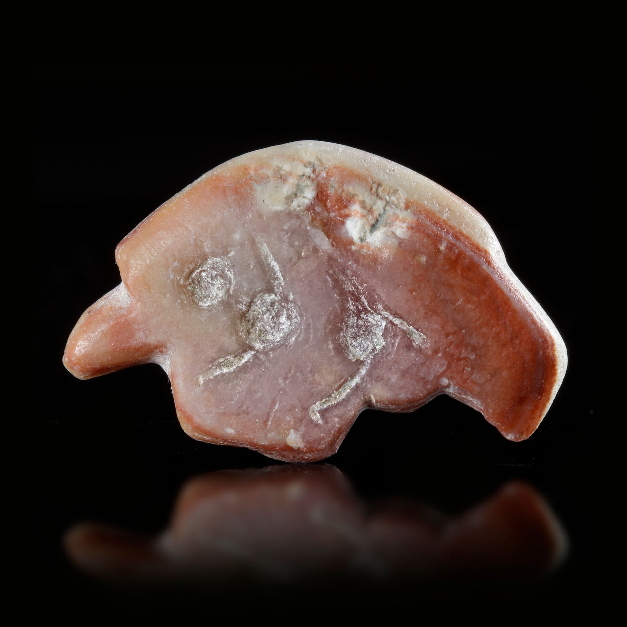 A stamp seal in a variegated crystalline limestone in the form of a vulture. The seal on the base has a crudely incised quadrupede. 34 mm.