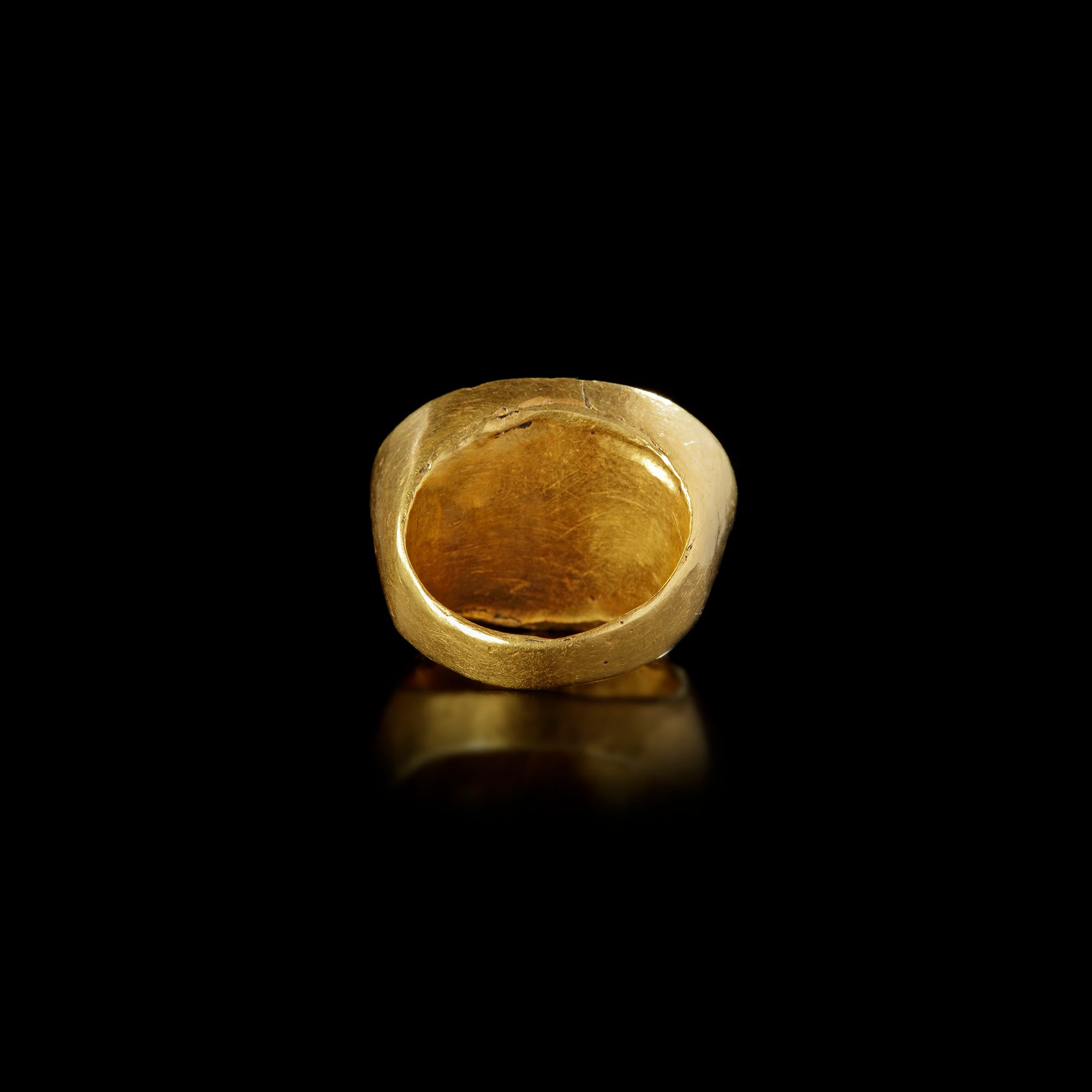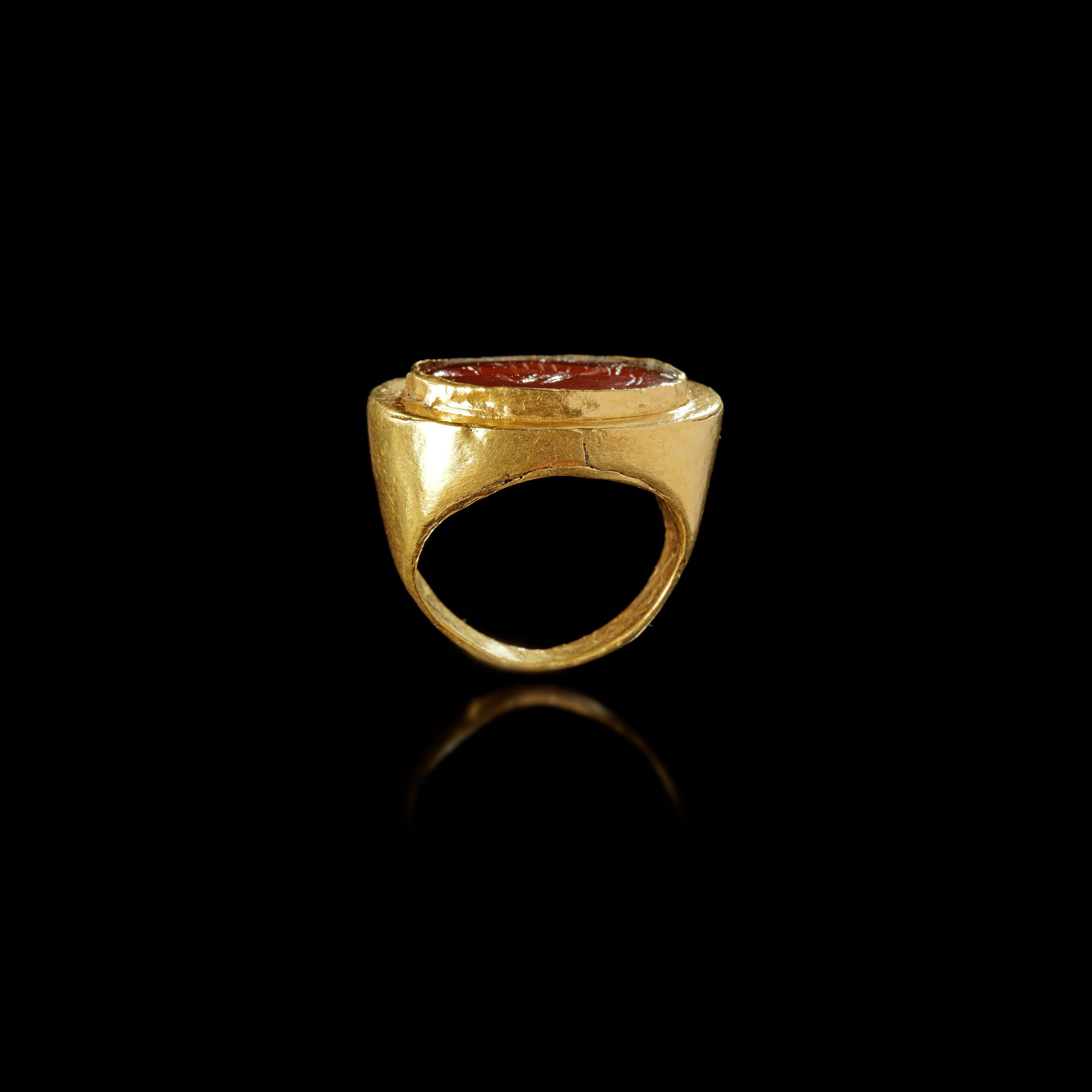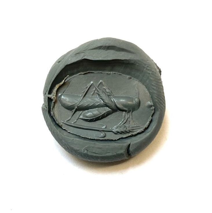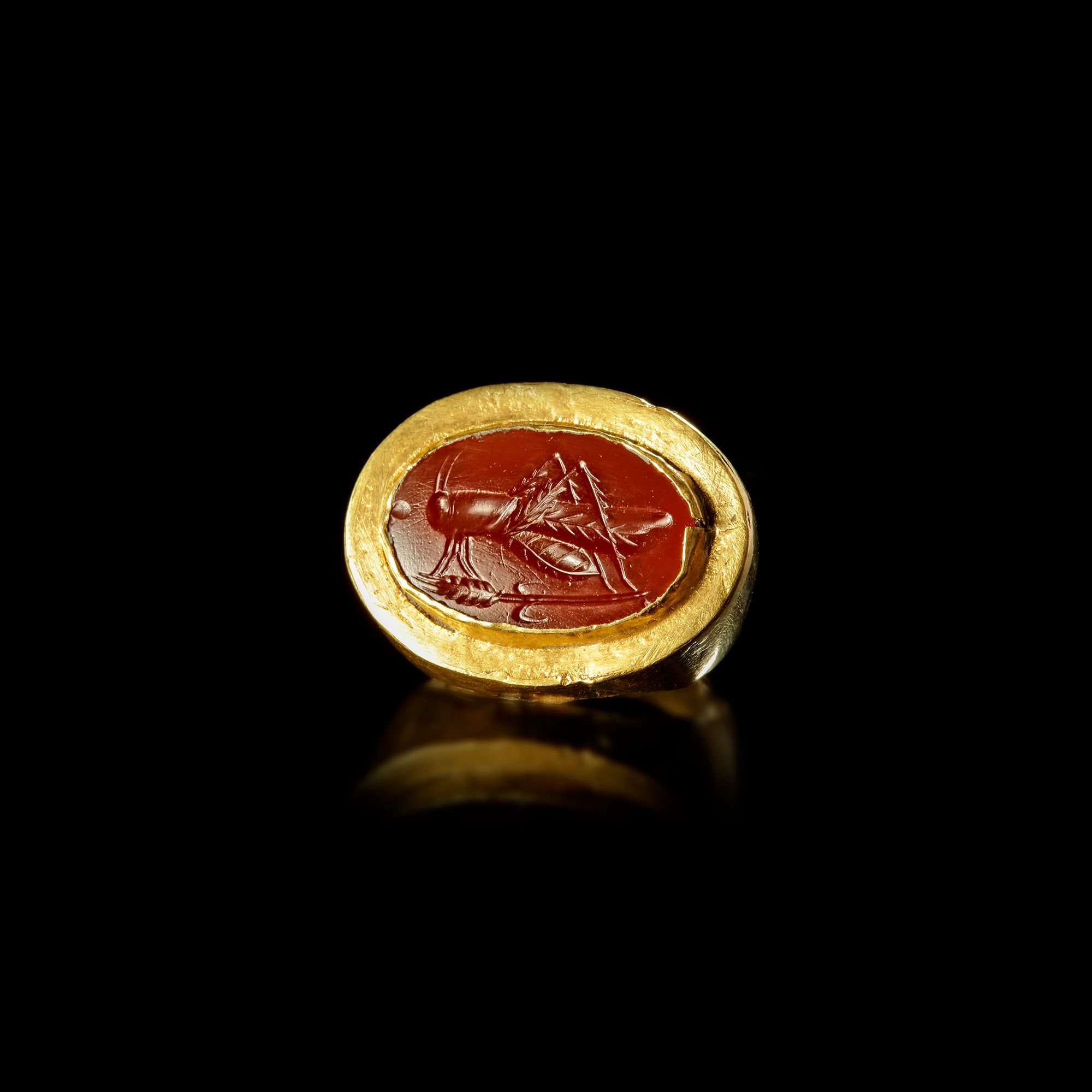 A Hellenistic ring made from composite gold sheet elements with a carnelian intaglio of a locust on a sprig of wheat. Upon careful examination one can see that the engraver has chosen to represent a locust rather than a grass hopper. This is somewhat unusual given the image of that particular insect through the ages as a harbinger of famine.
