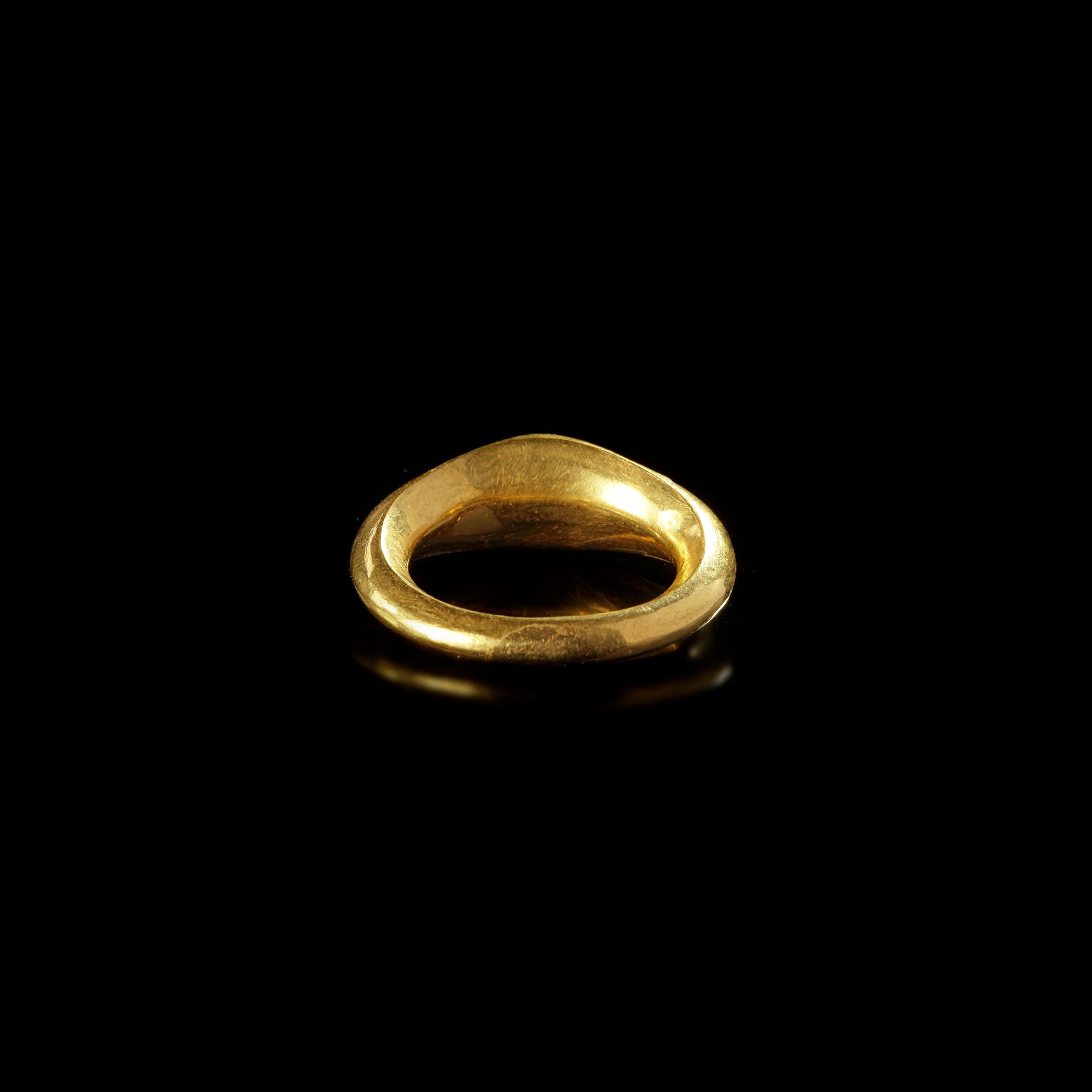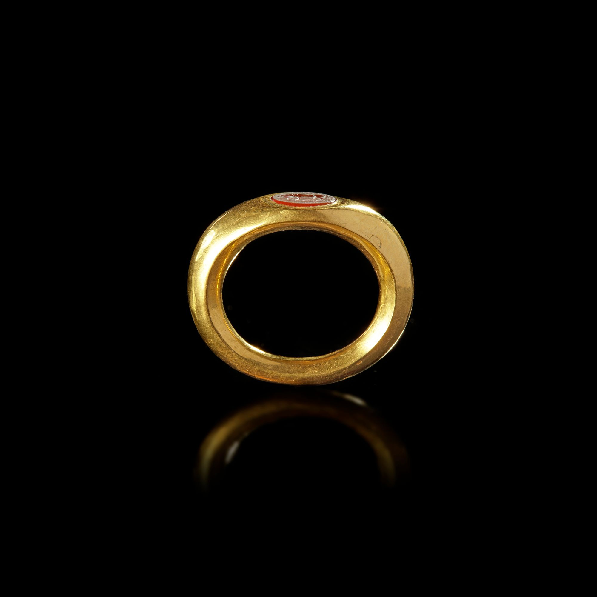 A Roman gold ring, hollow, with a small carnelian intaglio of horse to the left, lowering its head. A very elegantly made ring of robust construction with a small but attractive intaglio. The stone has been treated in order to have a slightly whitish hue on its surface in order to contrast with the engraving.