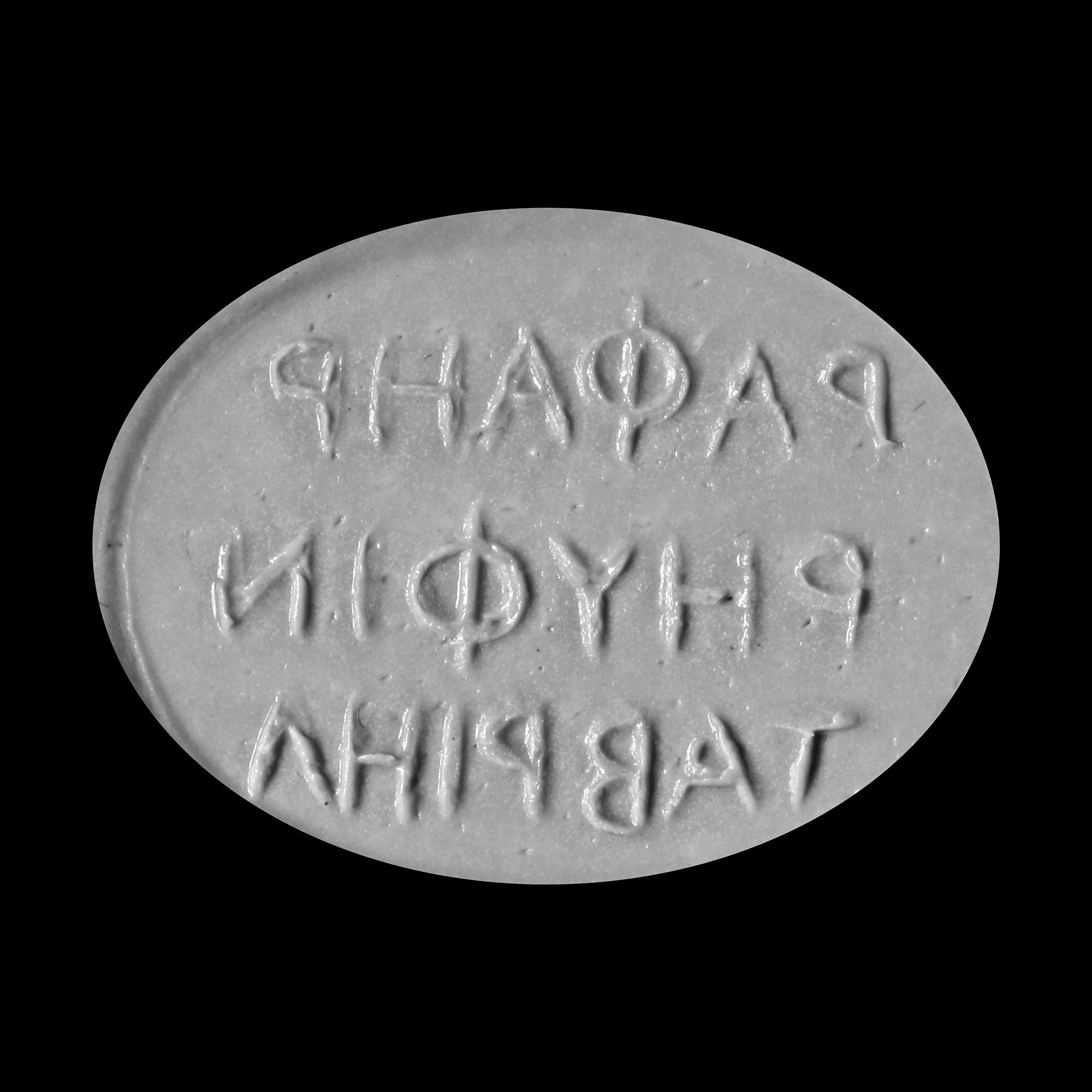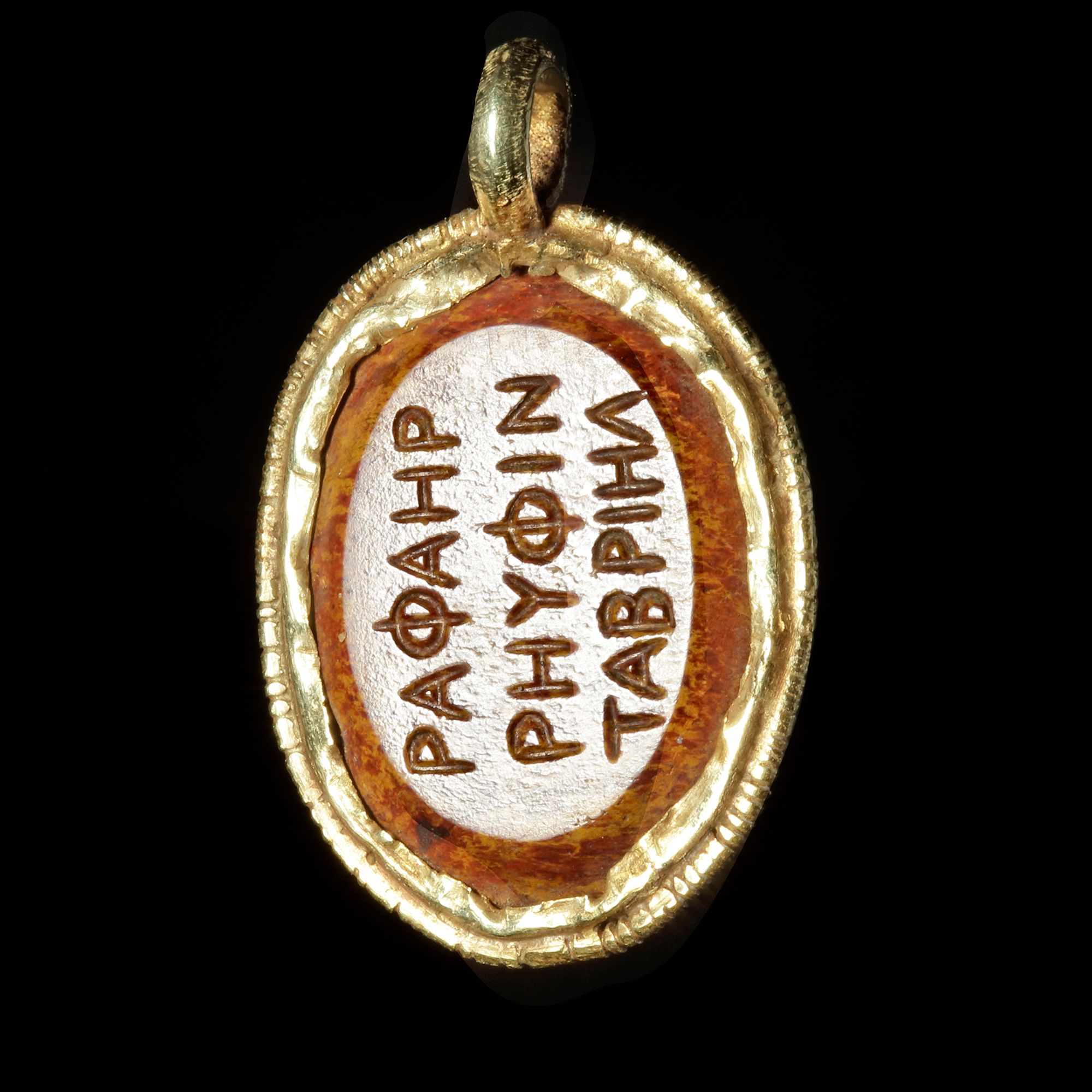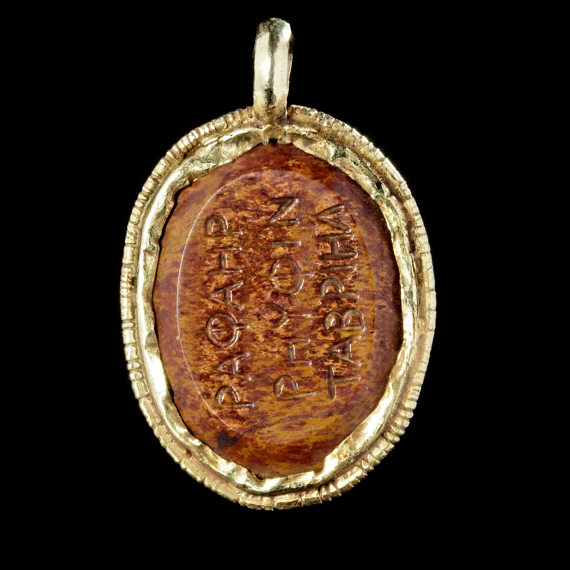A Roman intaglio in a variegated red jasper showing Abraxas with an inscription around the edge, mainly obscured by the gold frame. The back of the name has three names of angels. The gold surround is strengthened with a beaded wire which is soldered along its length to the edge of the frame. At the top there is a suspension loop.