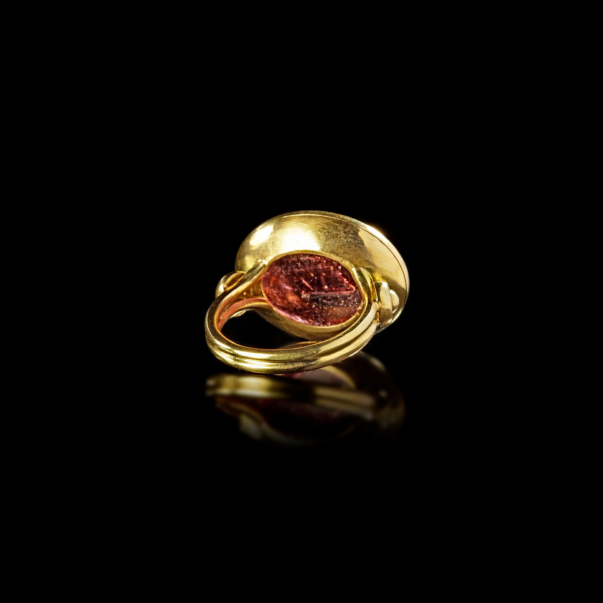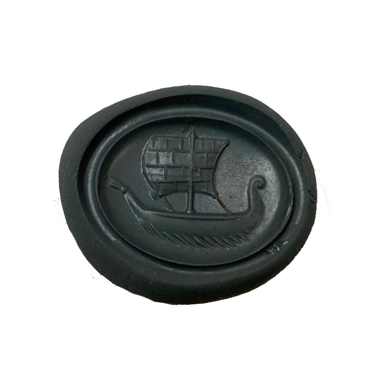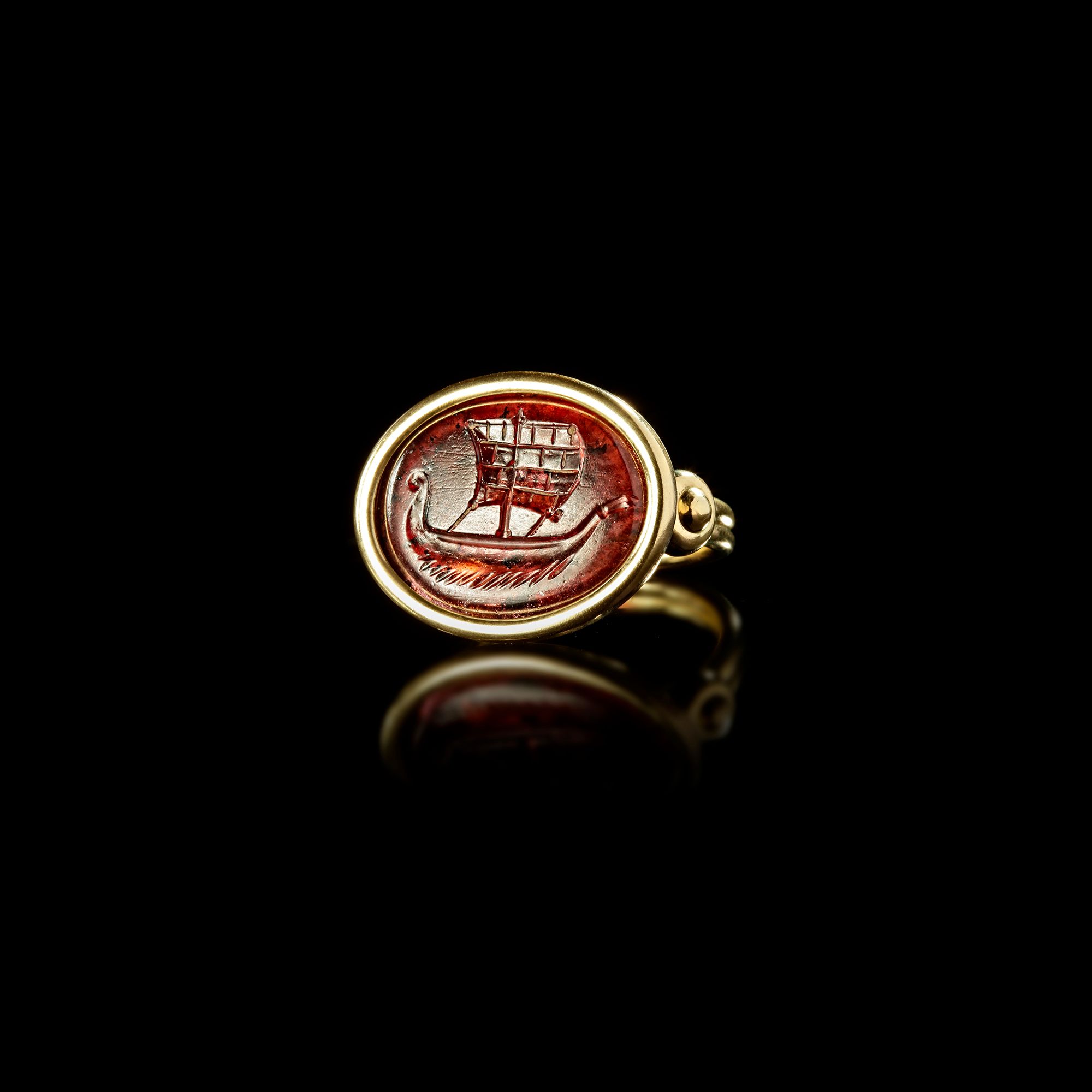 A fine intaglio in garnet of a Roman merchant ship sailing to the right. The single masted sailing ship was the staple transport method of the Mediterranean during the time of the later Republic and then till the end of the Empire. These ships transported the huge amount of grain, oil and wine which as required to keep the large cities supplied with victuals. It might be tempting to imagine that such a ring would have belonged to a ship owner of the period.