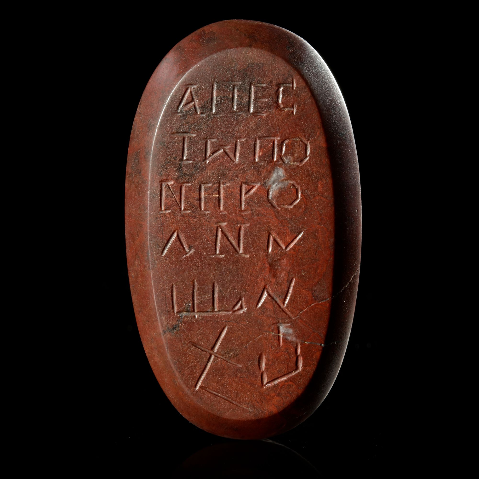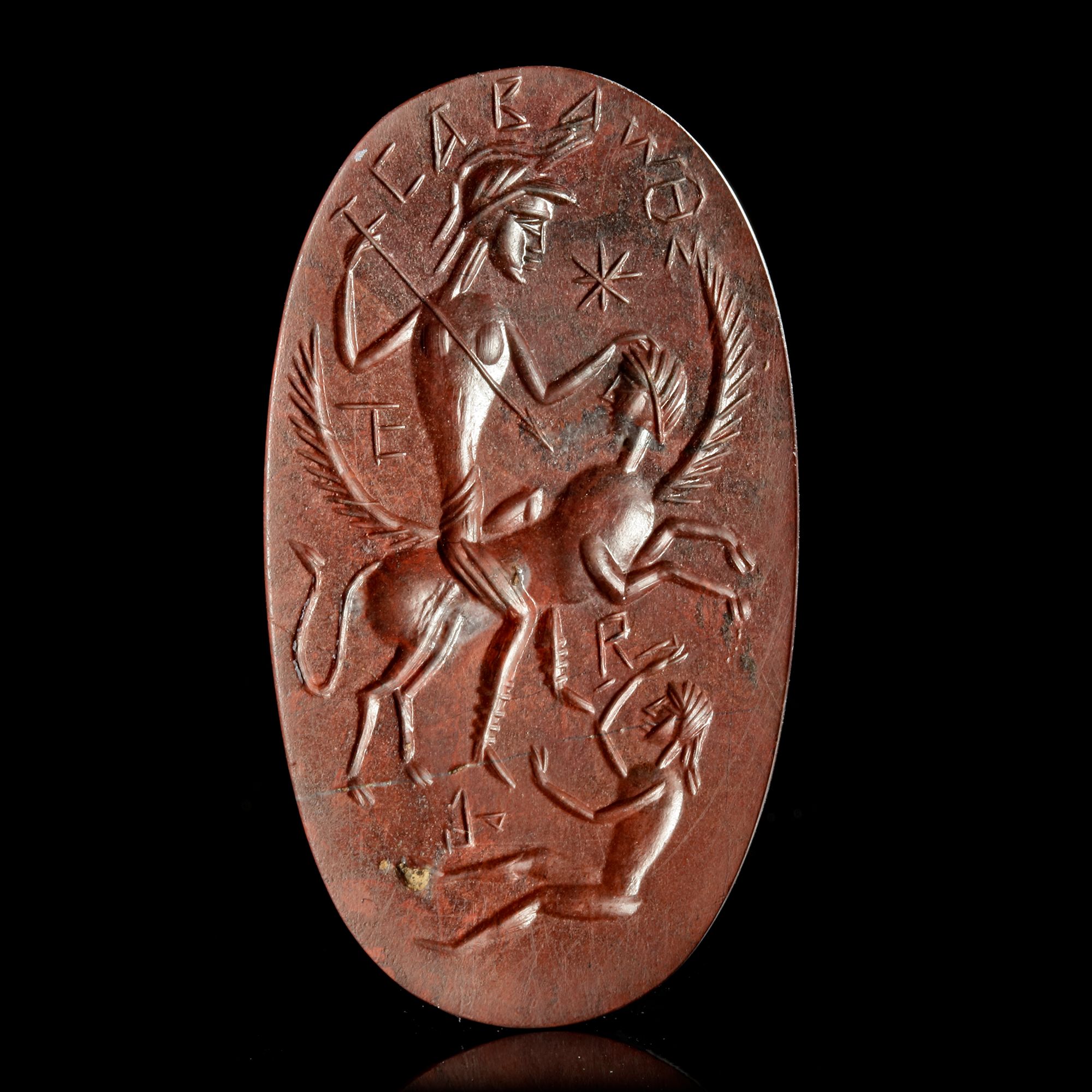 A large Gnostic intaglio in dark red jasper showing a man riding a winged centaur below which is a prostrate man. Around the type is a Greek formulaic inscription along with two small magical/Aramaic symbols. The reverse has a six line inscription, the first four in Greek, the bottom two in magic symbols. The type seems to presage the 'Solomon' rider types often found on hematite gnostic seals.