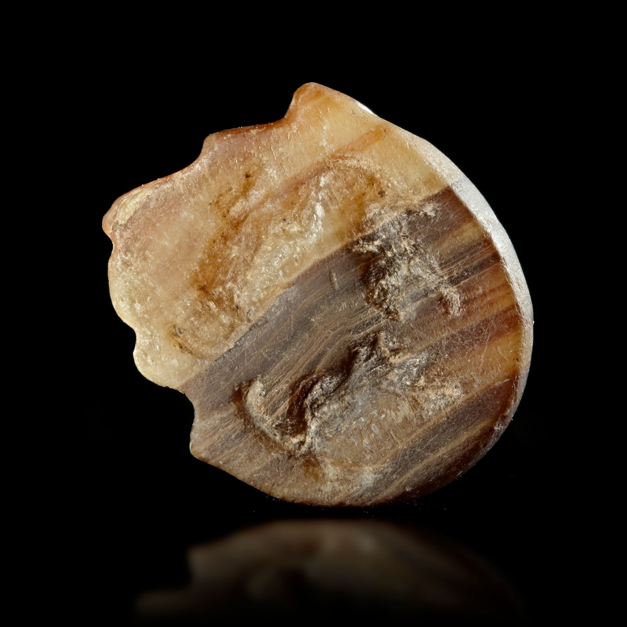 A stamp seal in the form of a lion's head facing right in a brown beige banded calcite. On the base are three animals, possibly canines.