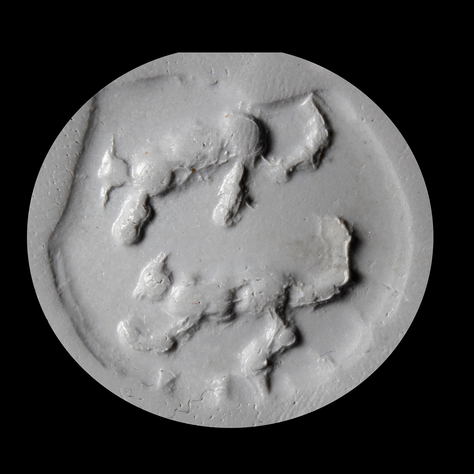 A stamp seal in the form of a lion's head. The back is engraved with two felines given the length of their tails. 38 mm x35 x 15 mm