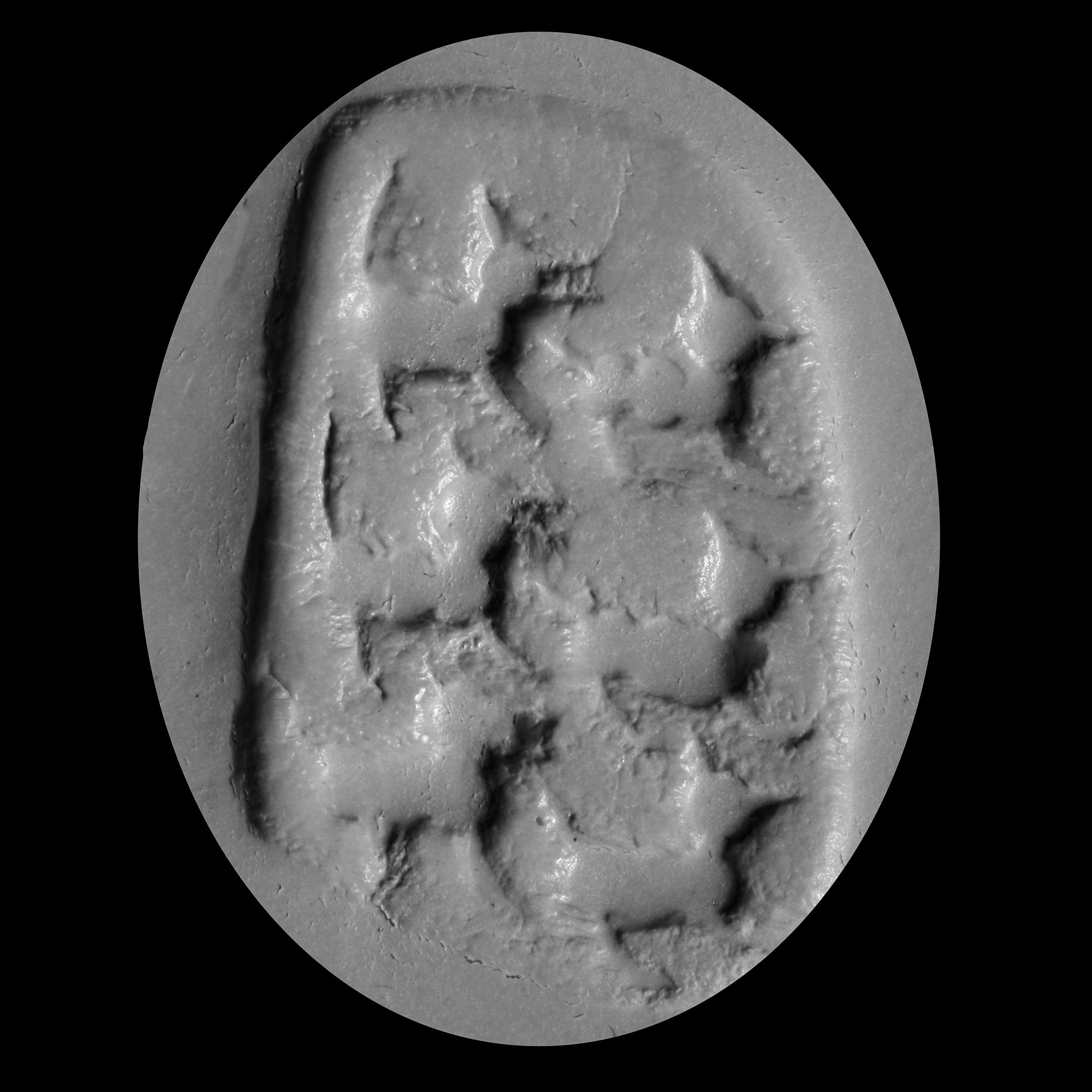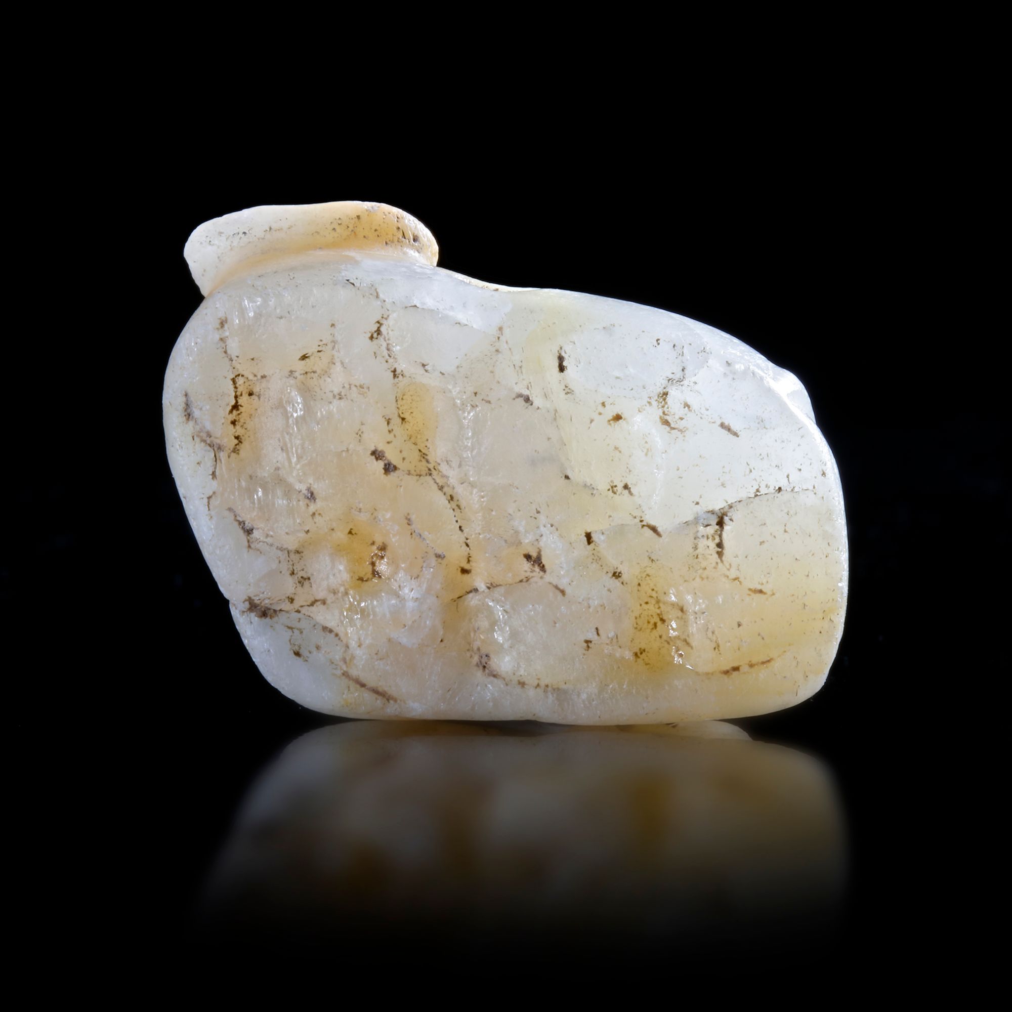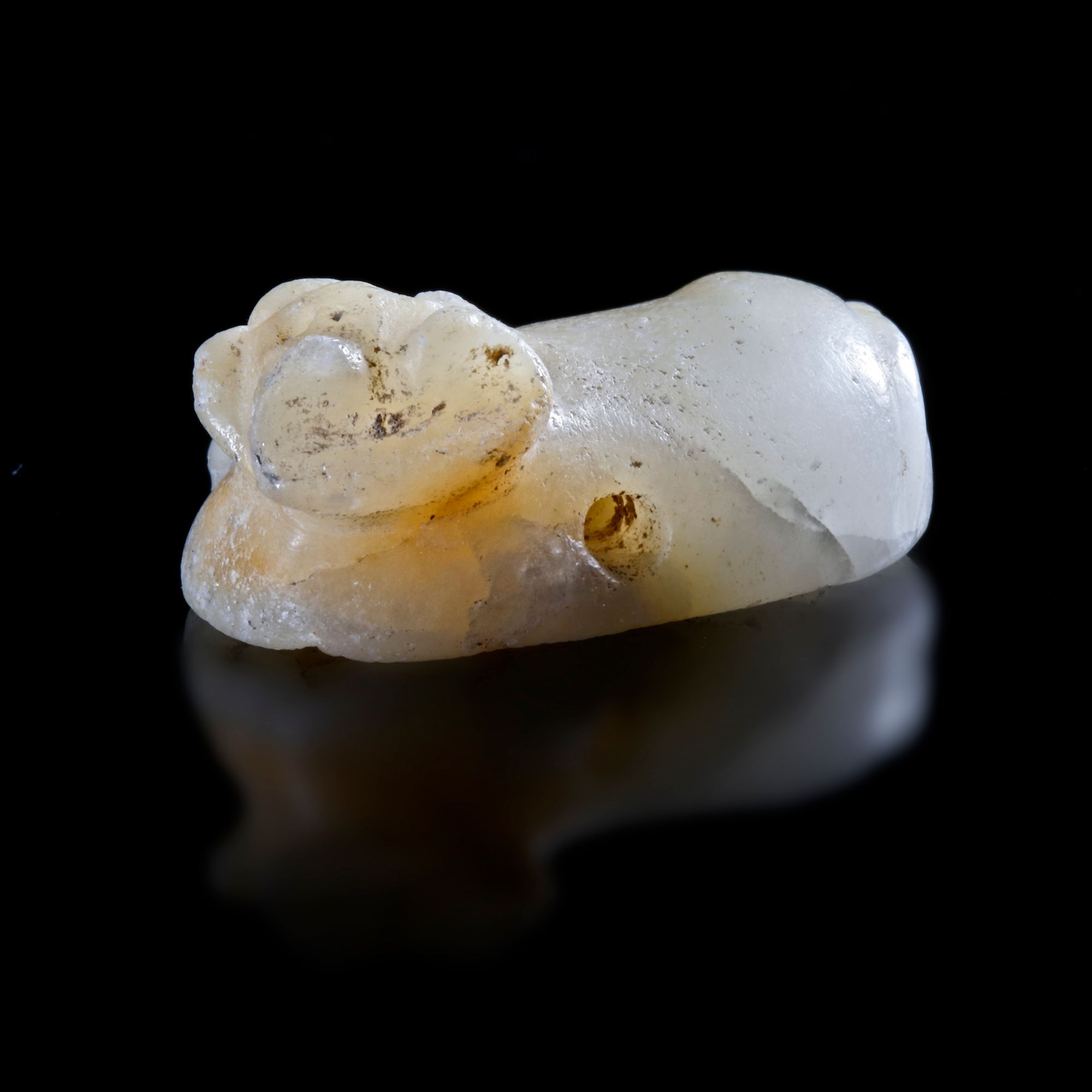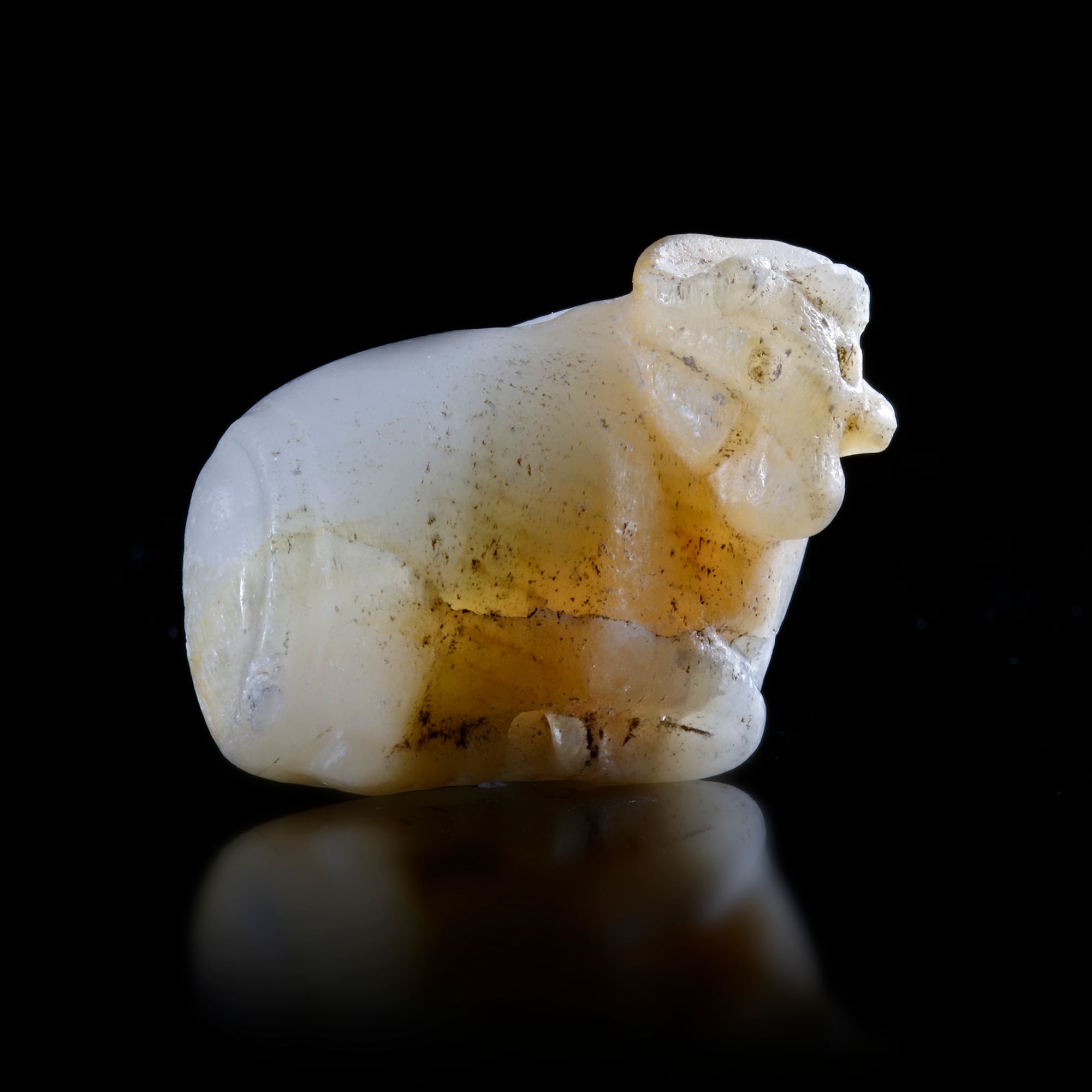 A reclining bull in calcitic limestone, the back is engraved with six quadrupeds made with bow drilling. 35 by 15 by 24 mm. Weight: 16.8 gr.
