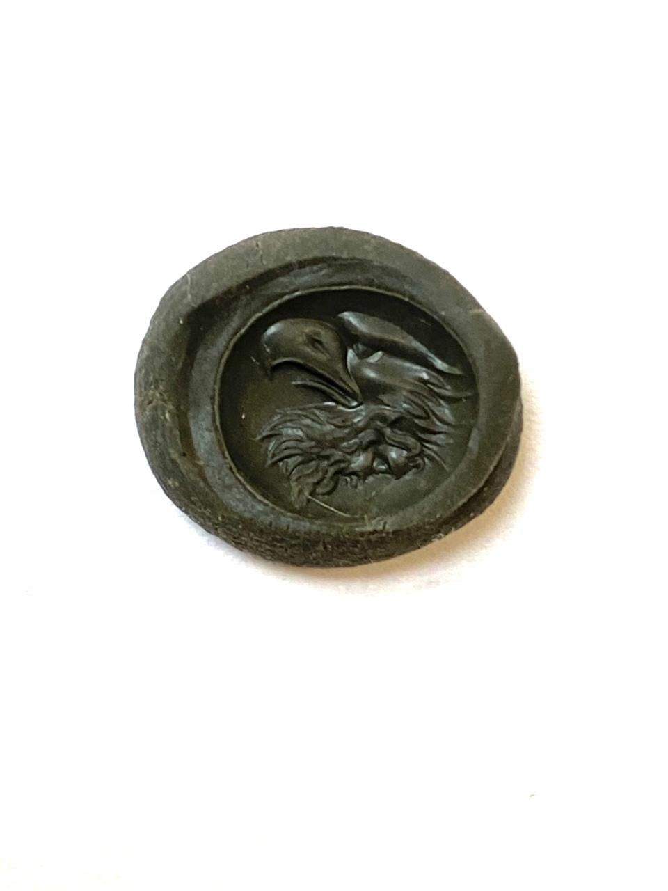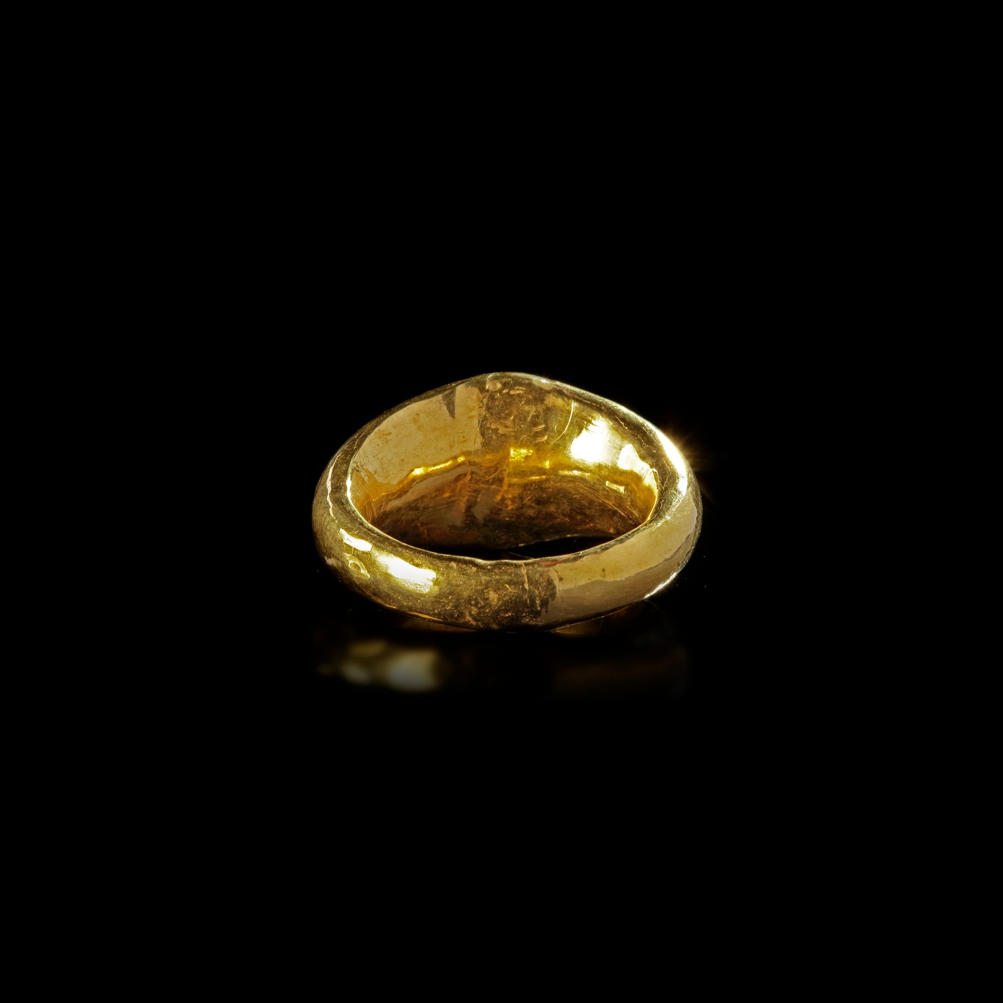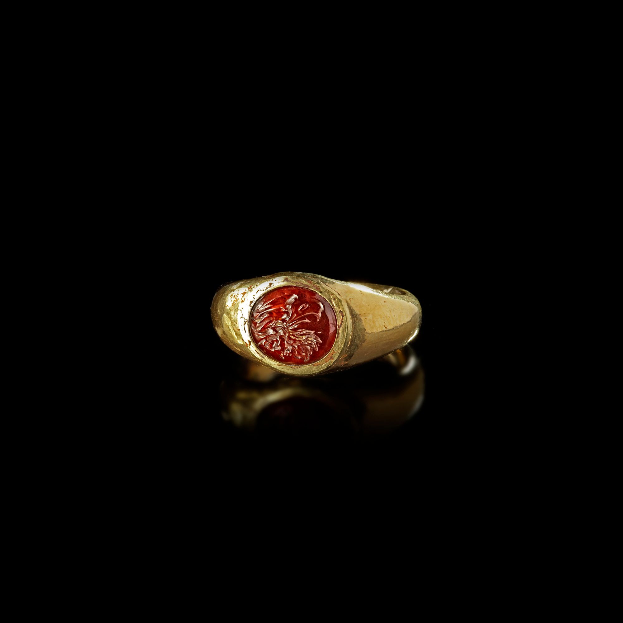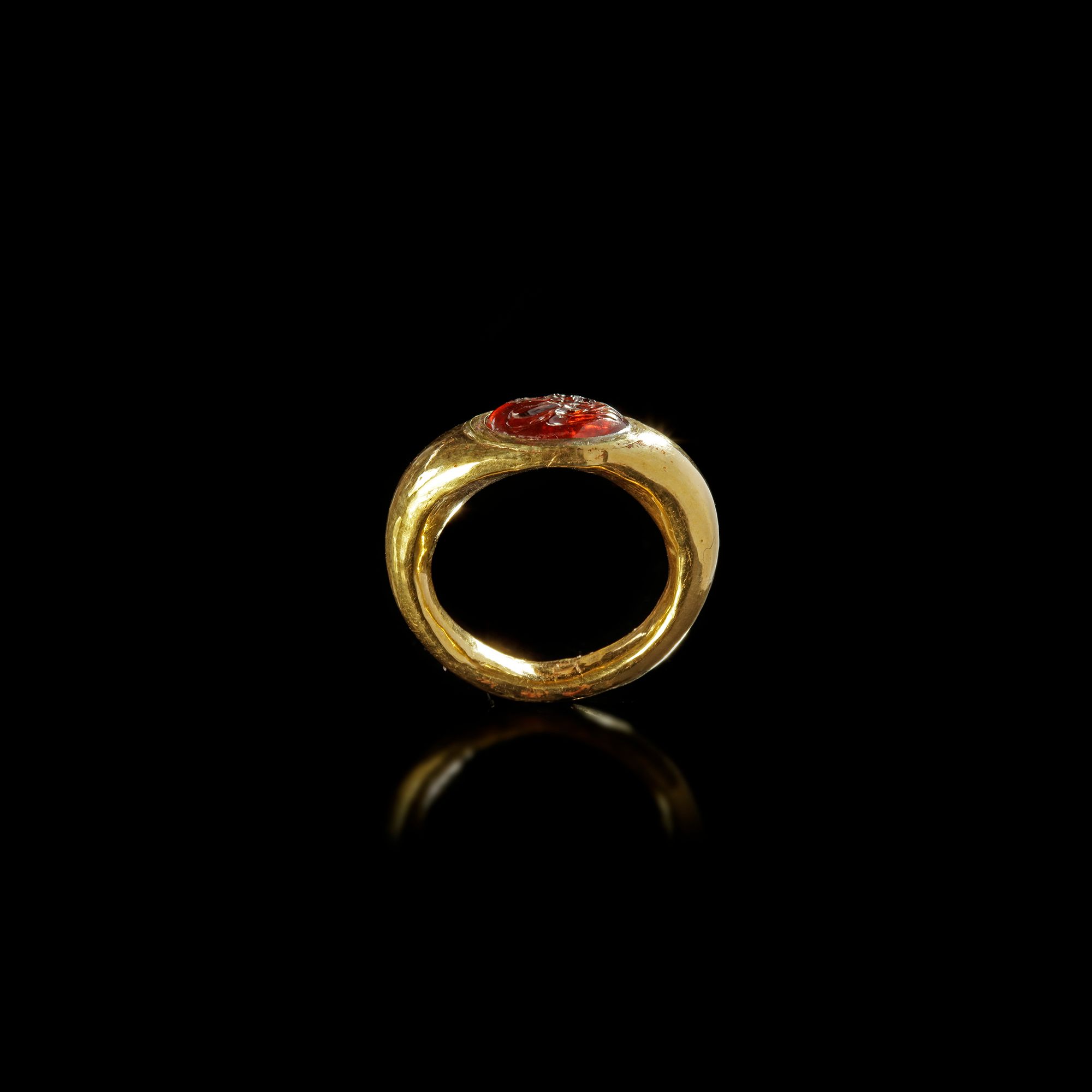 A charming hollow gold ring from early imperial times showing the head and neck of an eagle finely engraved on a cabochon garnet.