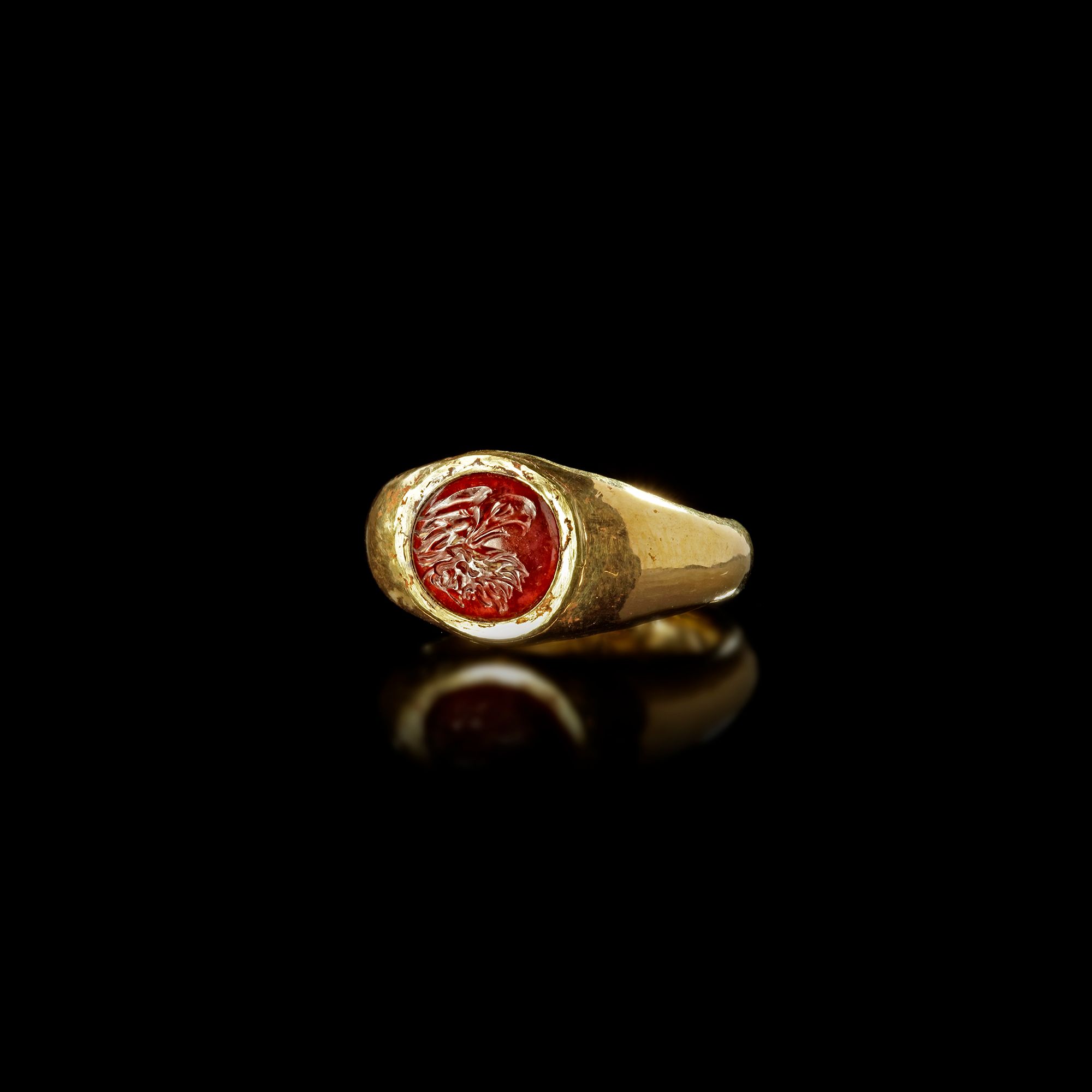 Lot 24A HOLLOW ROMAN GOLD RING WITH A GARNET INTAGLIO OF AN EAGLE'S HEAD, 1ST CENTURY AD
