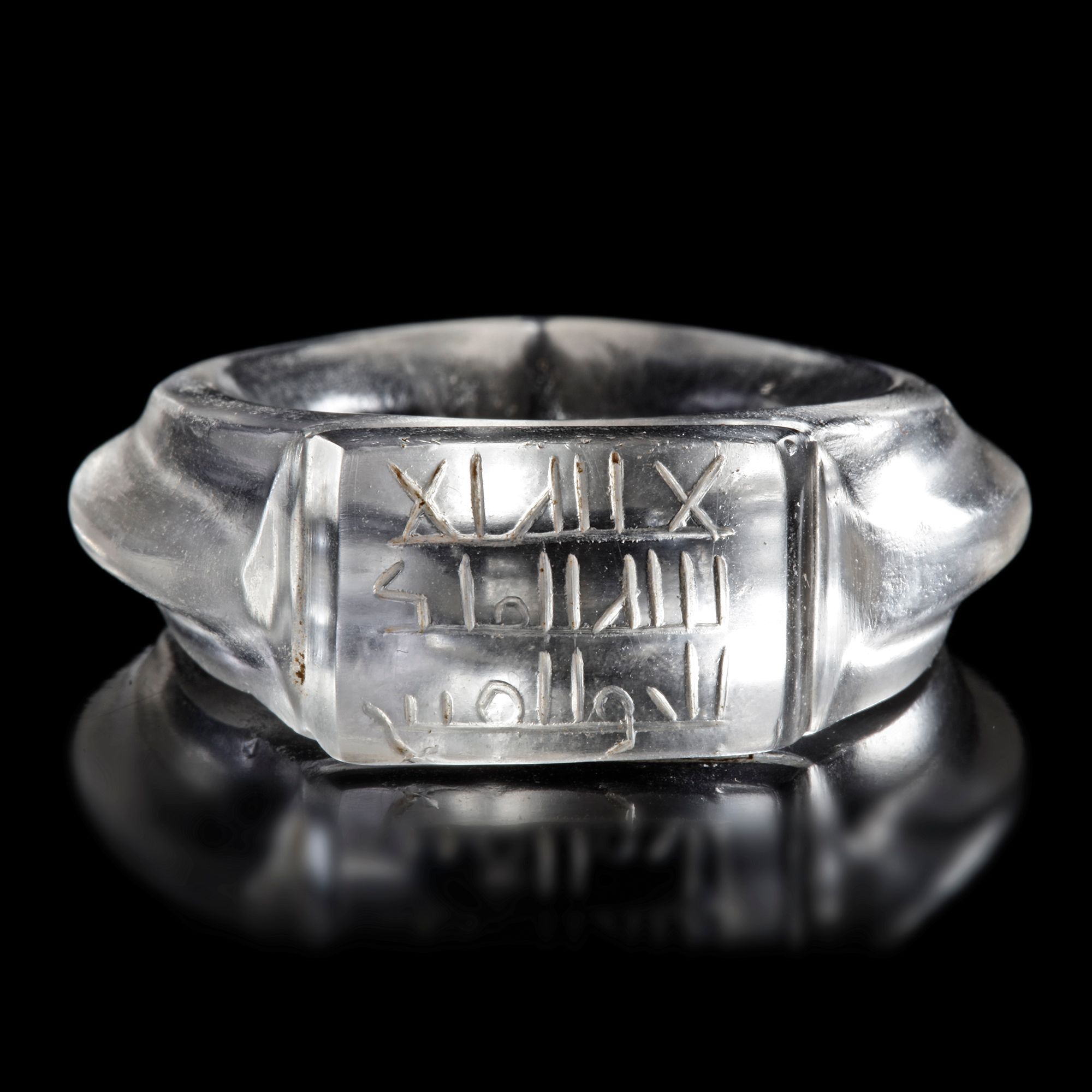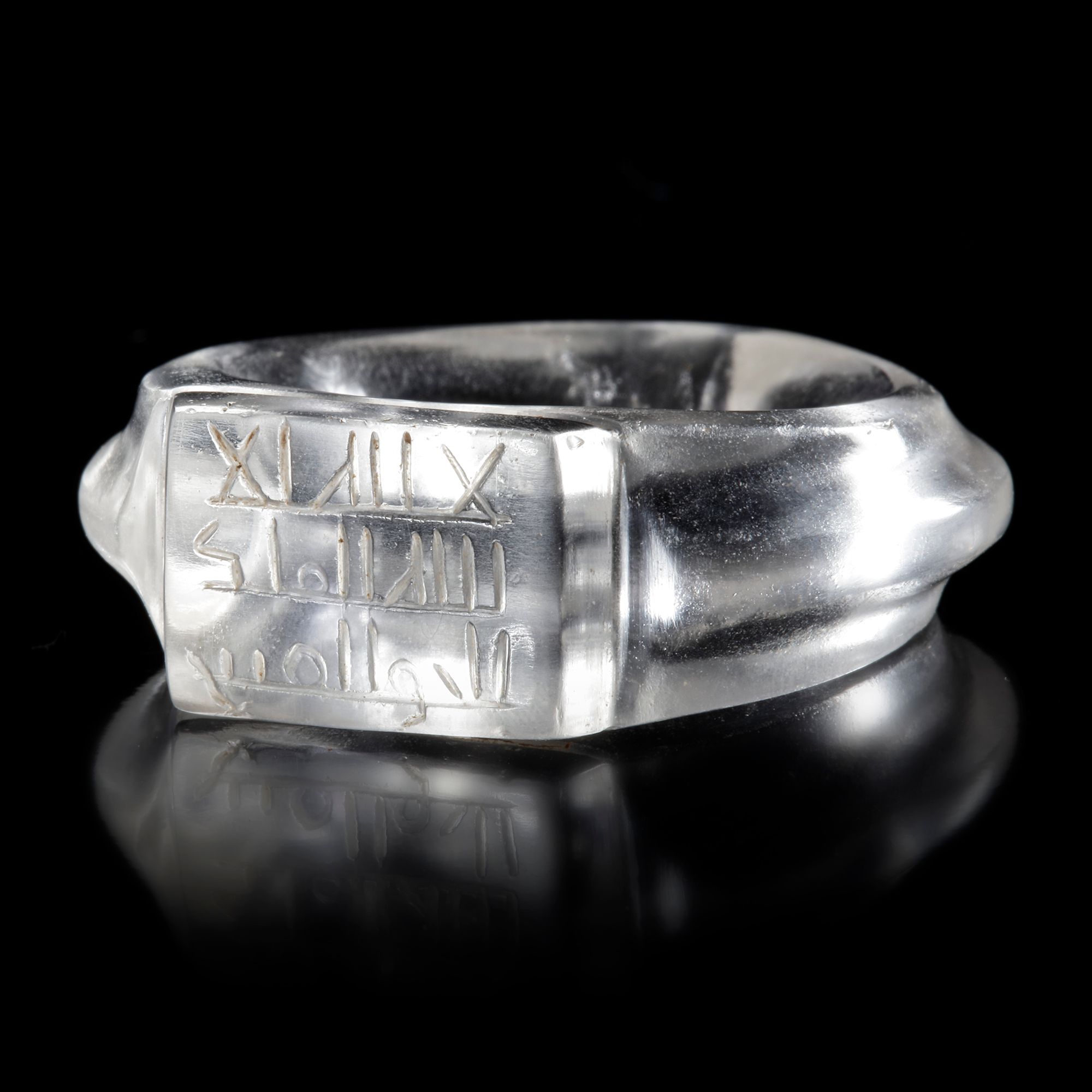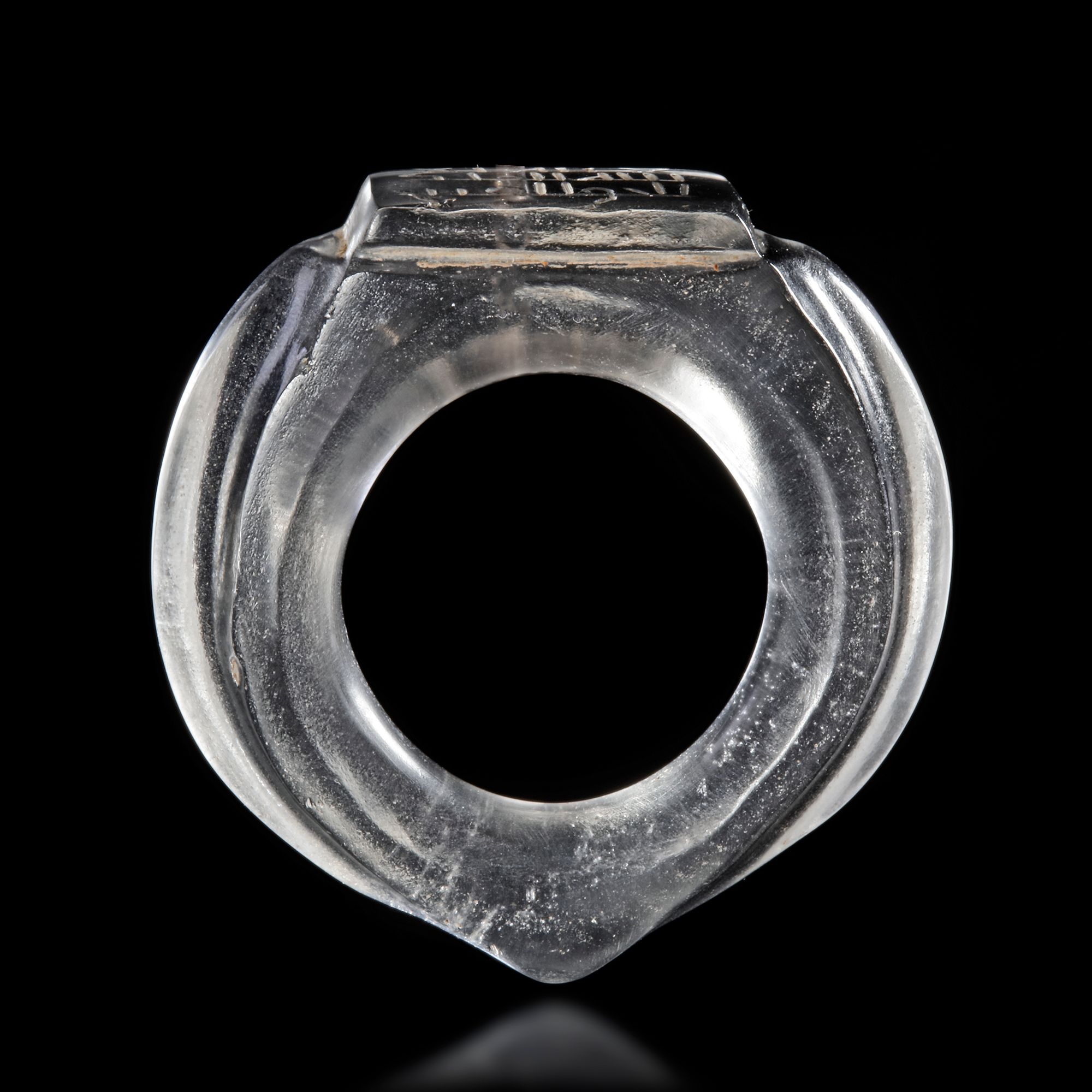 An Islamic rock crystal ring with an inscribed bezel. The ring consists of a single piece of flawless rock crystal which consists of a masterfully carved shank and a rectangular bezel upon which a Kufic inscription is engraved. The shank is made with an elegant sweep which descends to a point at the base, meanwhile a flat facet is made on both sides while the outside is fashioned in a ridge. This allows the rings to reflect the facets and give the piece volume and grace.