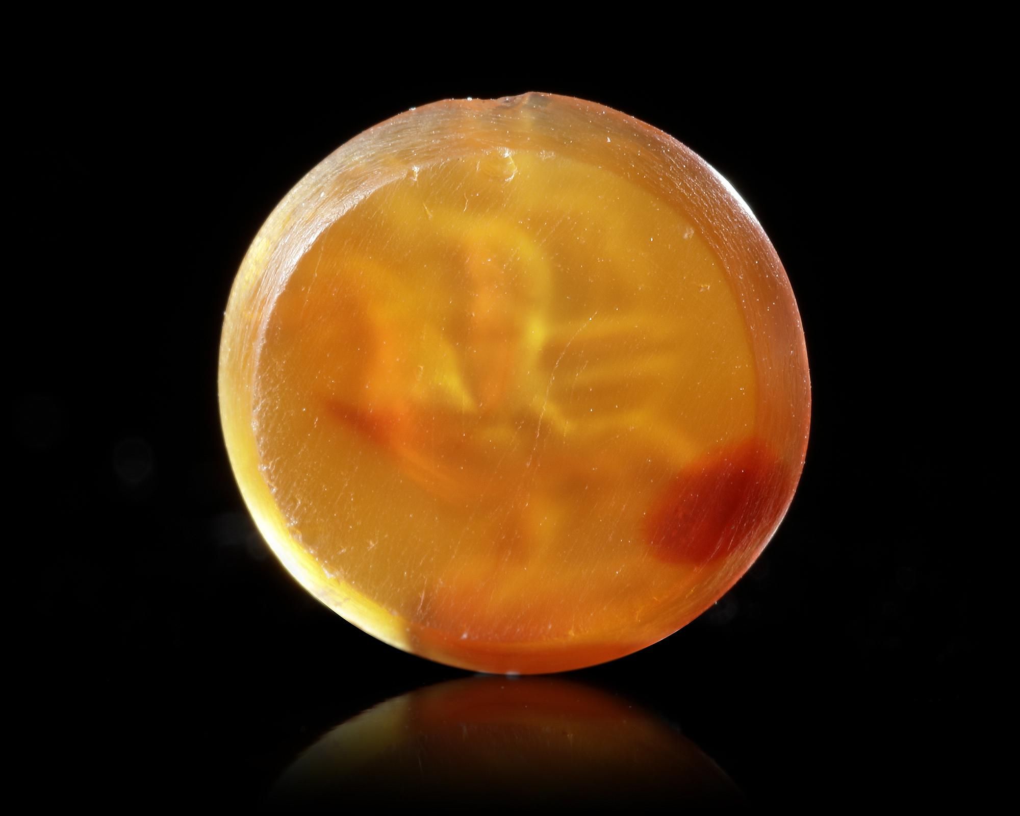 A carnelian intaglio showing Eros riding a goose, a type which refers to Eros conquering love as the goose was associated with Venus.