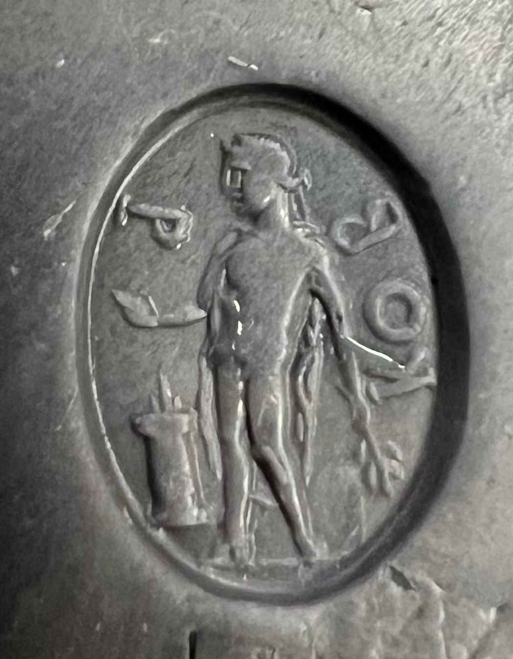 A red jasper intaglio with Apollo standing right facing a lit altar holding a branch in his right hand. Around him in the field are four Greek letters 'KOB P' indicating the owners name. Well executed engraving with traces of iron from a ring on the back. Red jasper, 11 x 8,5 mm.