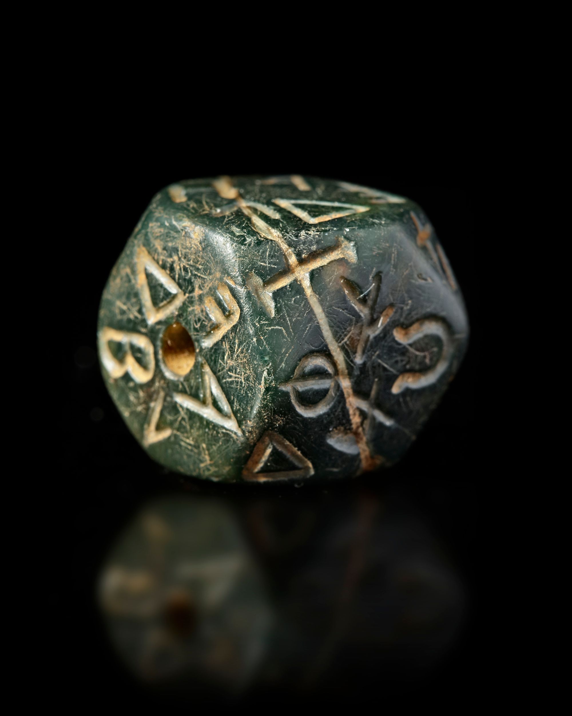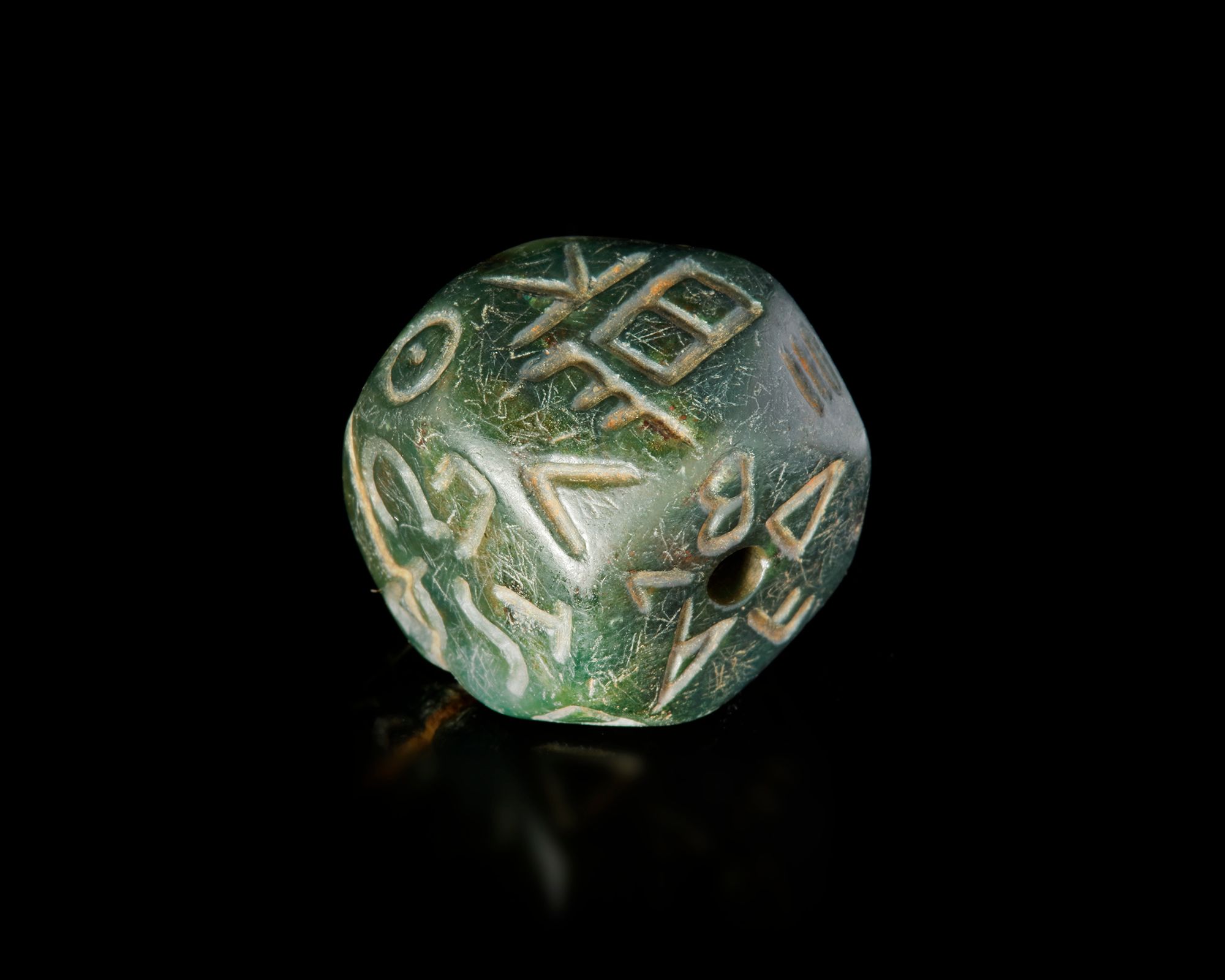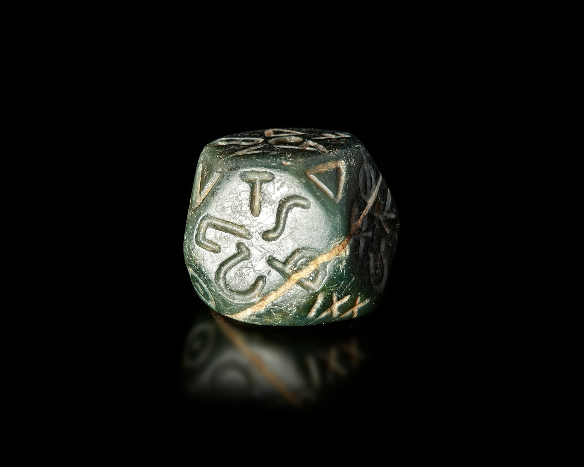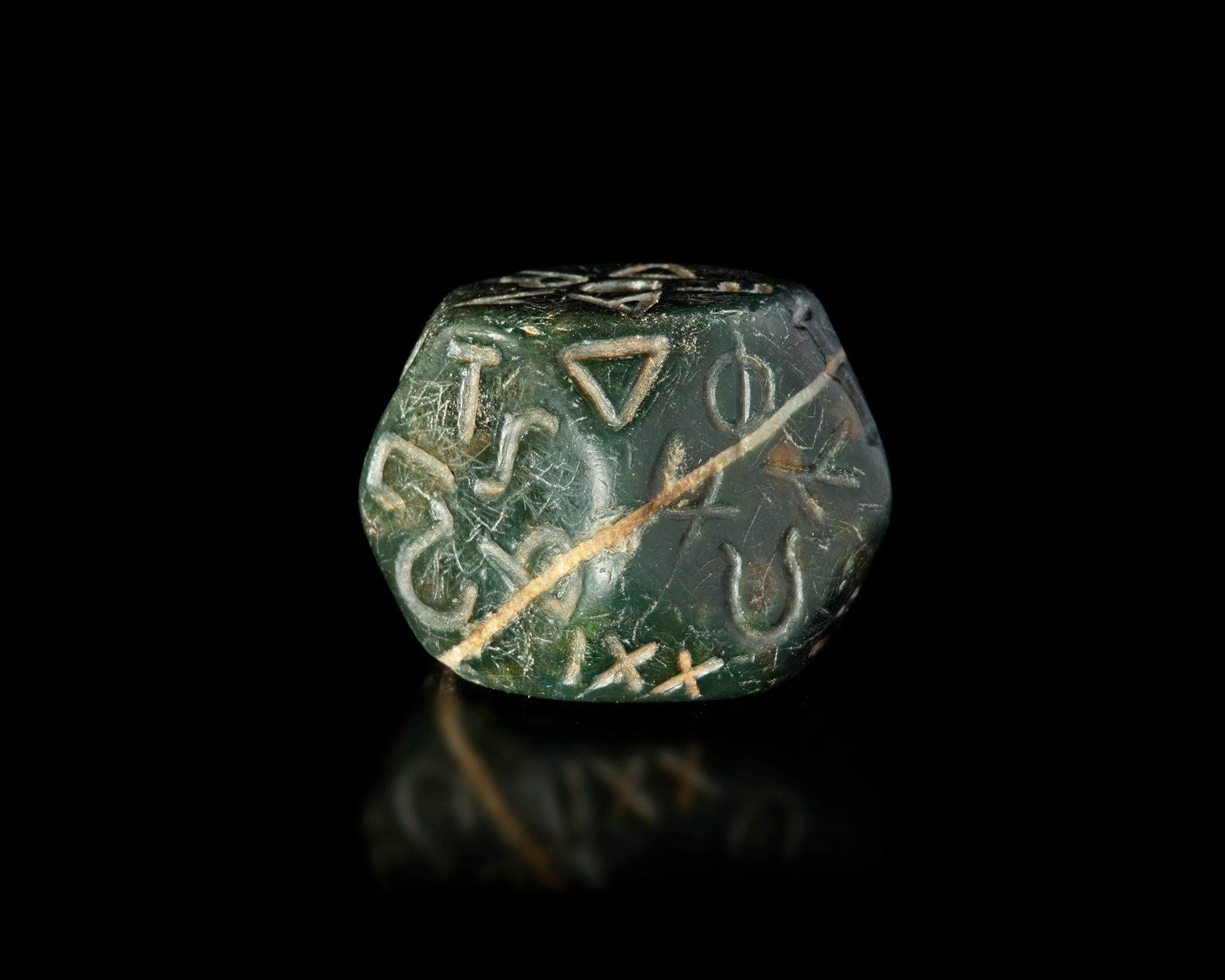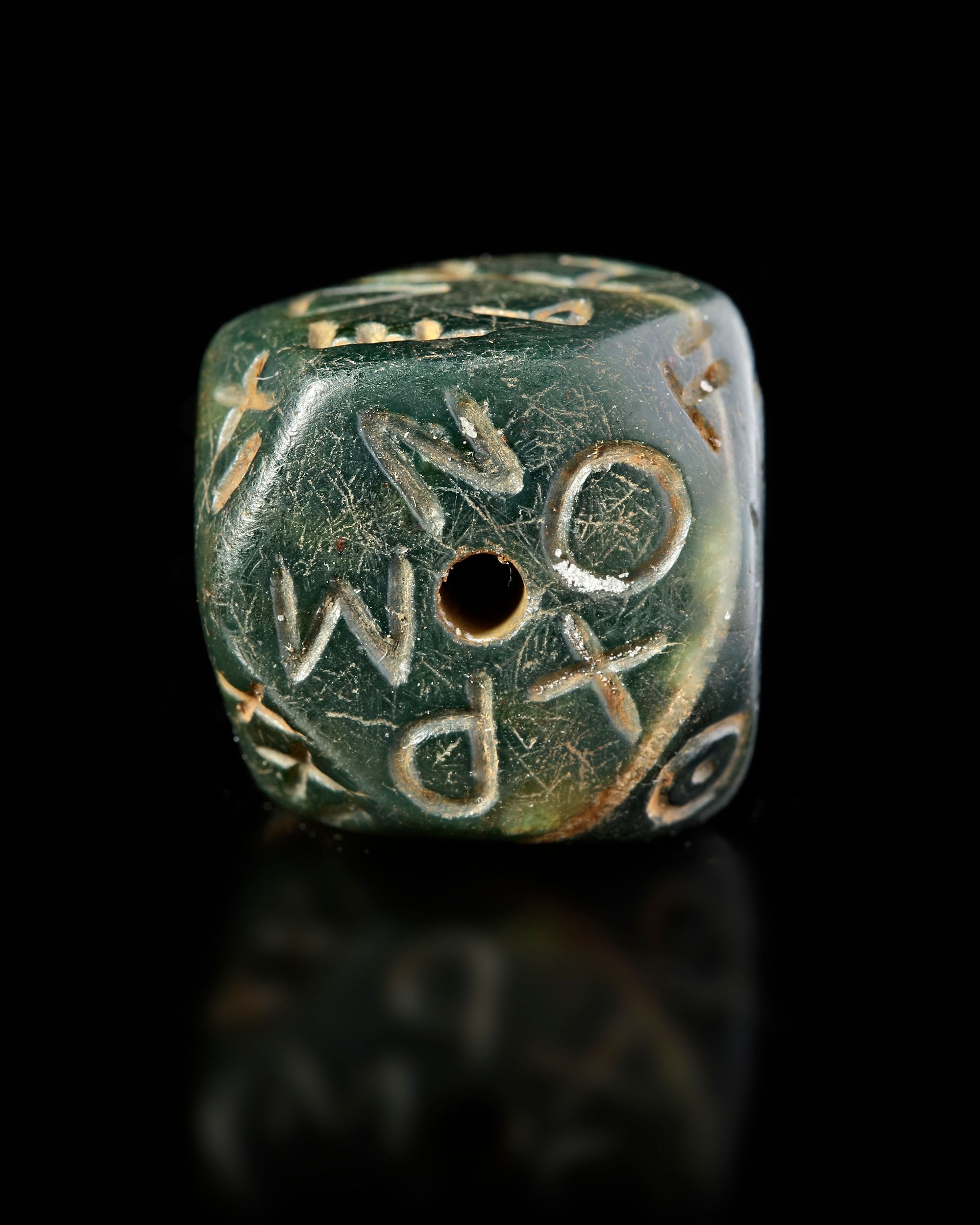 A trucated square amulet in green agate with various letters engraved on the surface. The appearance of 'XXI' suggests that this is from the Roman period although if it is magical then we could expect a mix of letters and symbols to appear.