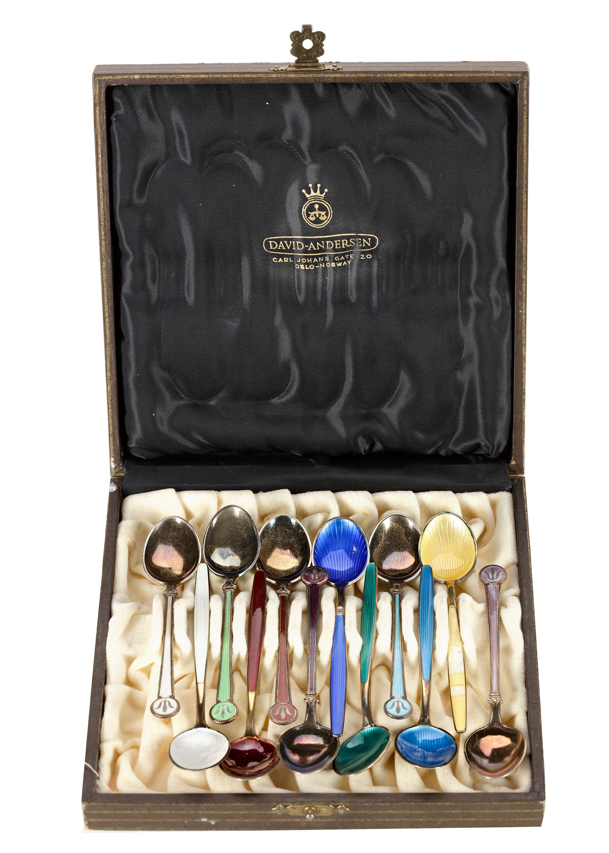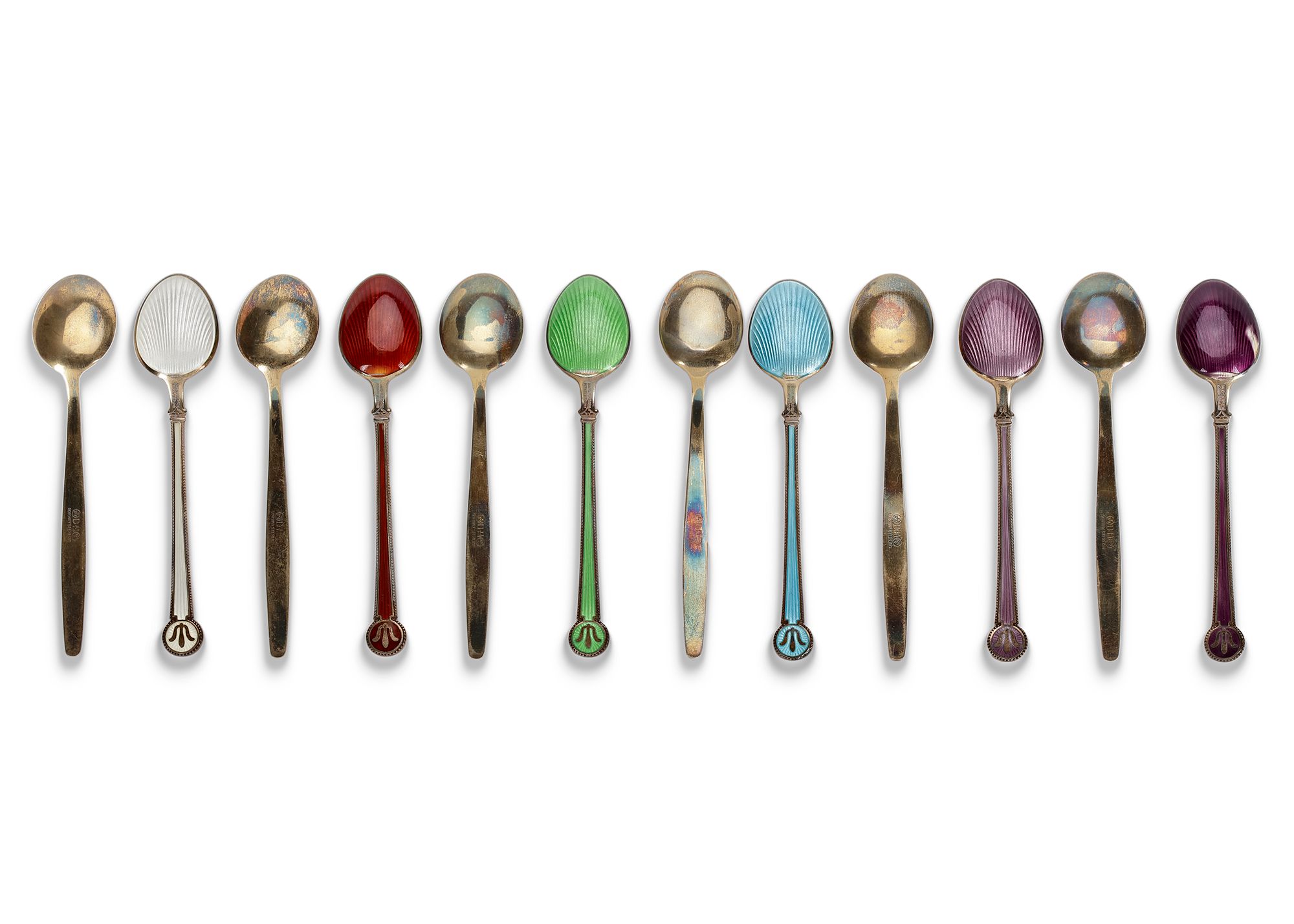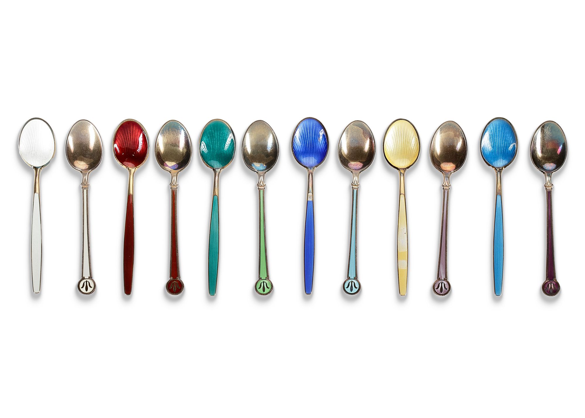 TWELVE NORWEGIAN SILVER AND ENAMEL COFFEE SPOONS, MID 20TH CENTURY
