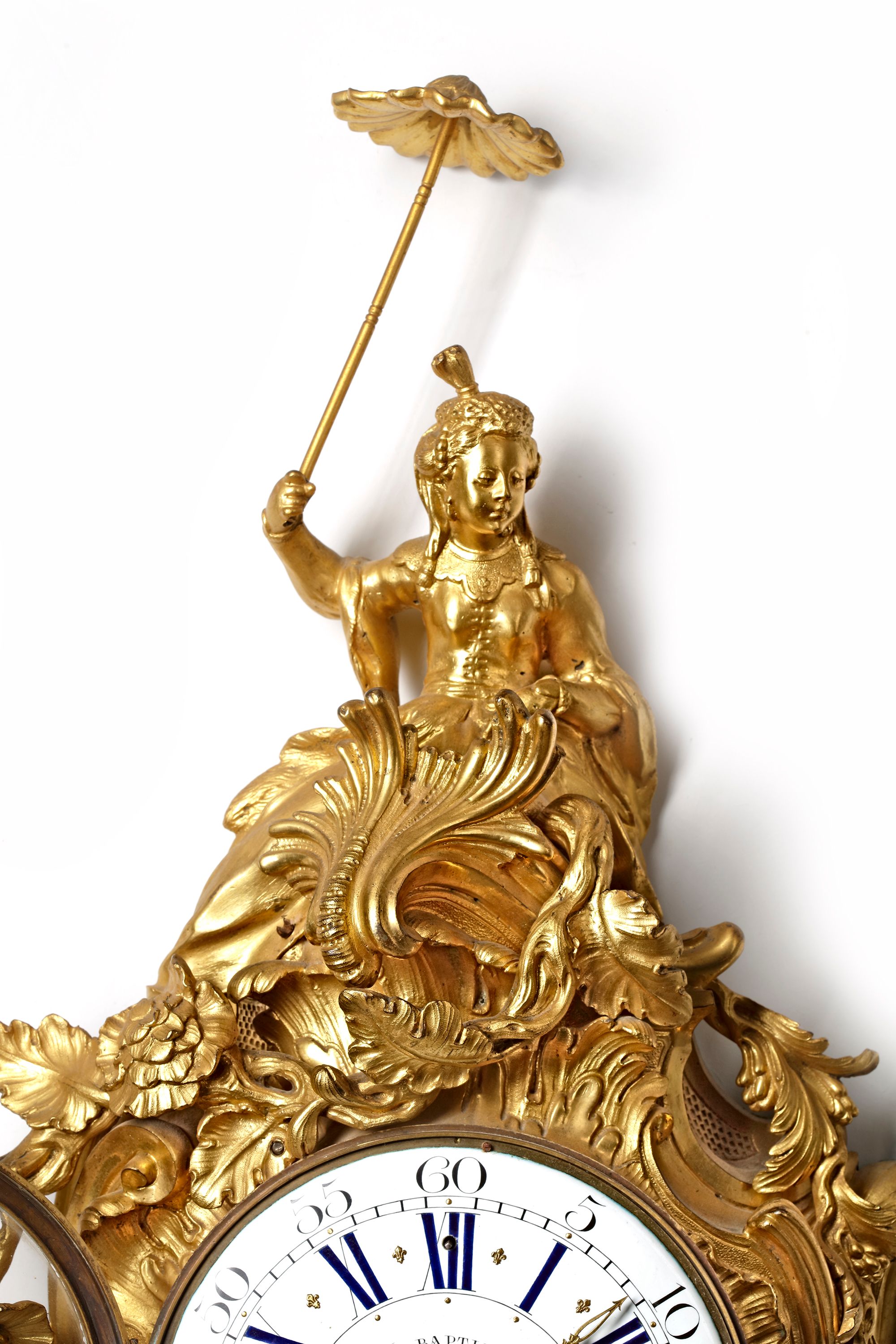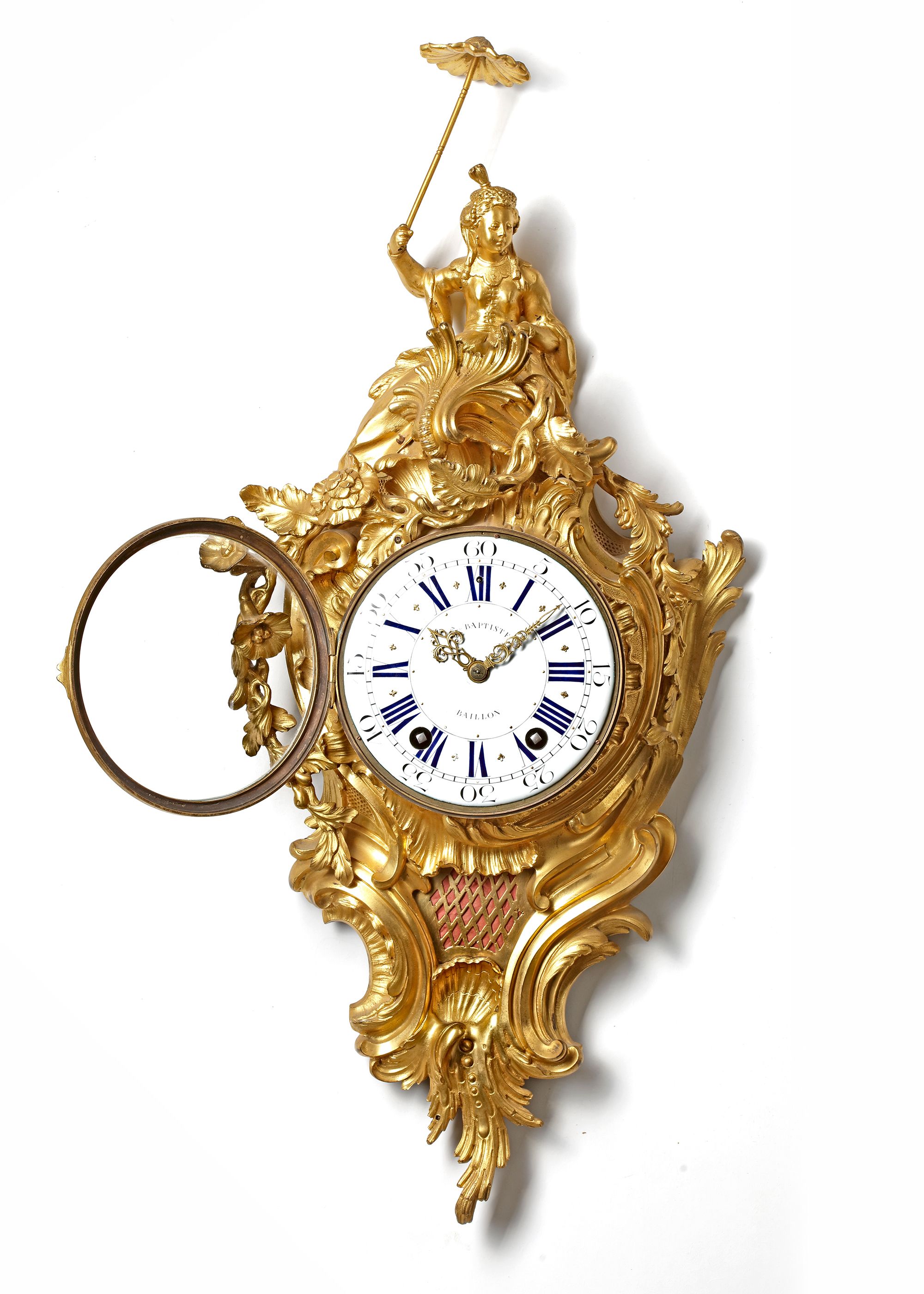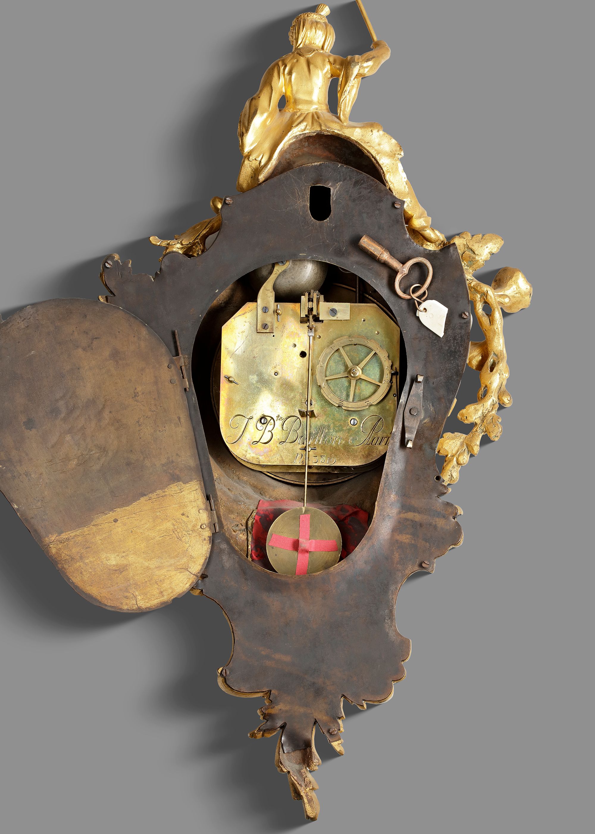 The case adorned with scrolling foliage and a seated elegant young lady with a parasol, The white enamel dial with Roman hours and Arabic five minute markers, pierced gilt hands and signed 'JN. Baptiste / Baillon', The backplate of the movement signed 'J.B. Baillon a Paris / No 3819'