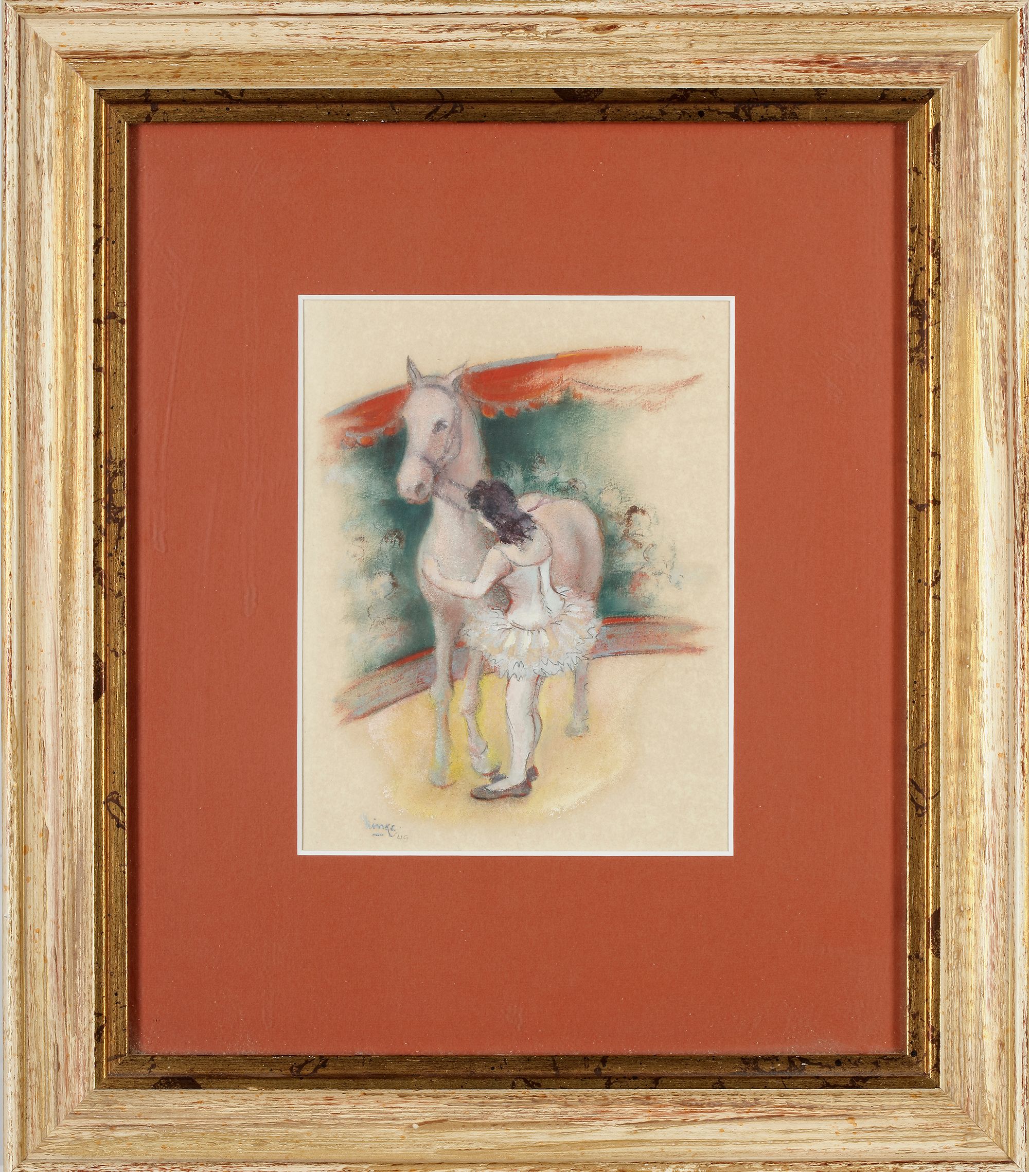 A delicate and expressive artwork depicting a woman in a white tutu holding a white horse. The soft brushstrokes and warm color palette create an ethereal and nostalgic atmosphere. The background features an impressionistic crowd, with vibrant red drapery adding a sense of depth and movement. Framed in a rustic wooden frame with an orange matting that complements the artwork’s tones.