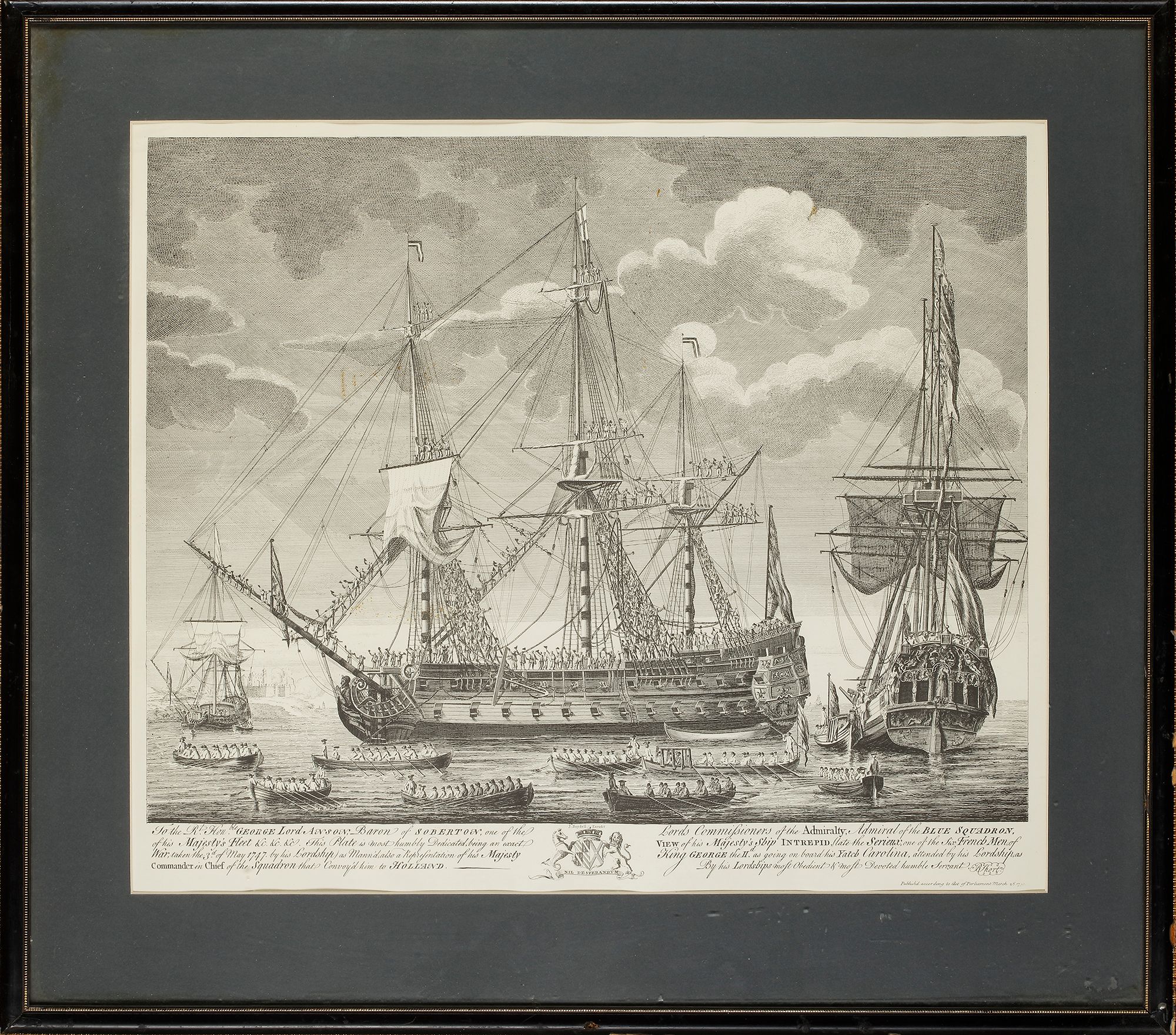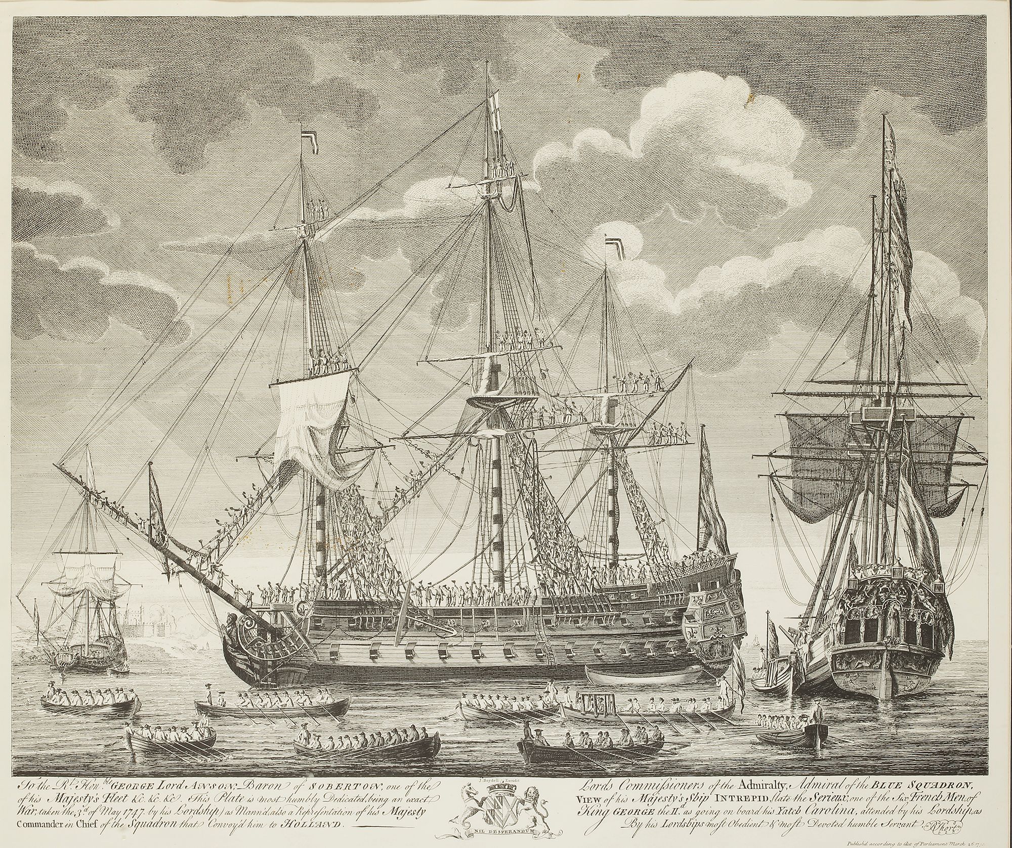 A historical maritime engraving depicting the fleet of George Anson, Baron of Soberton, and his flagship HMS Intrepid, formerly the French ship Serieux. The scene captures the grand naval formation and the ceremonial boarding of King George II’s yacht Carolina, attended by high-ranking officers and rowboats filled with crew members. This detailed engraving is dedicated to the Lords Commissioners of the Admiralty and was published under an Act of Parliament on March 26, 1747.