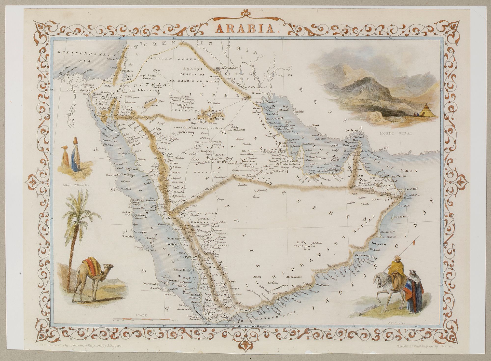 The Arabian Peninsula outlined in gold showing drawings of Mount Sinai, a camel and depictions of the Arab people. Simple border surrounds the map.