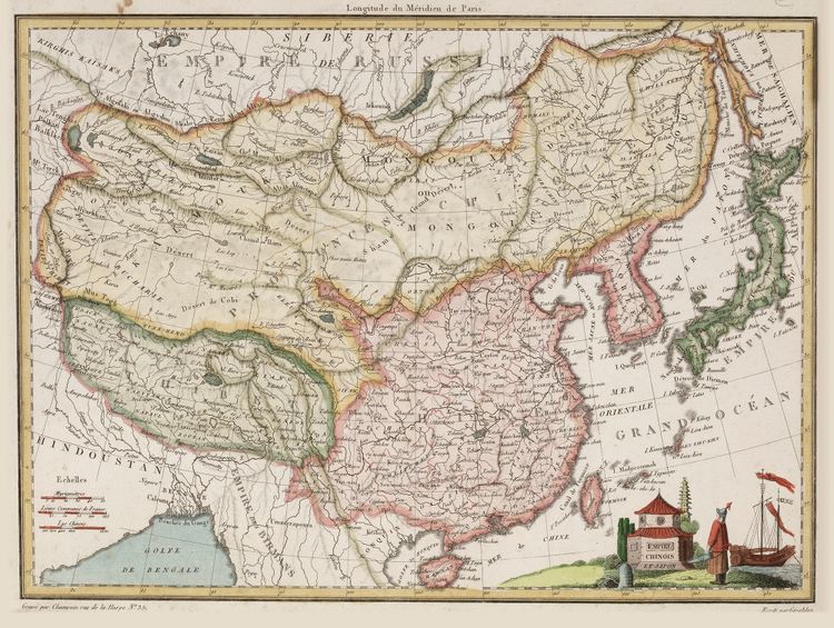 A detailed 18th-century map depicting the Chinese Empire and surrounding regions, including Mongolia, Tibet, Korea, and Japan. The map is intricately hand-colored, with political boundaries and geographical features clearly marked. Engraved by Giraldon.
