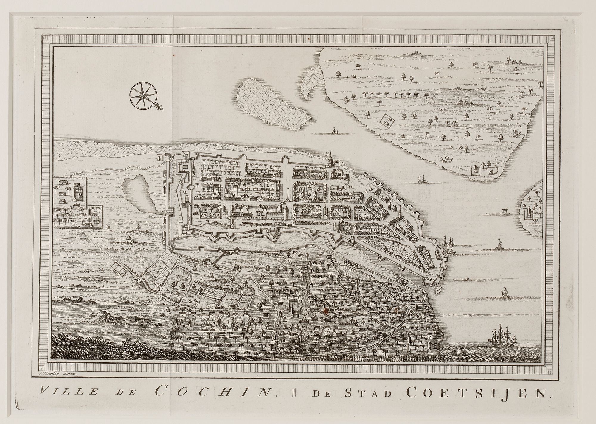 A detailed engraving of Cochin (modern-day Kochi), showing its fortified European settlement, surrounding native town, and maritime infrastructure. The map highlights the city’s strategic importance as a key trade hub on India’s Malabar Coast.