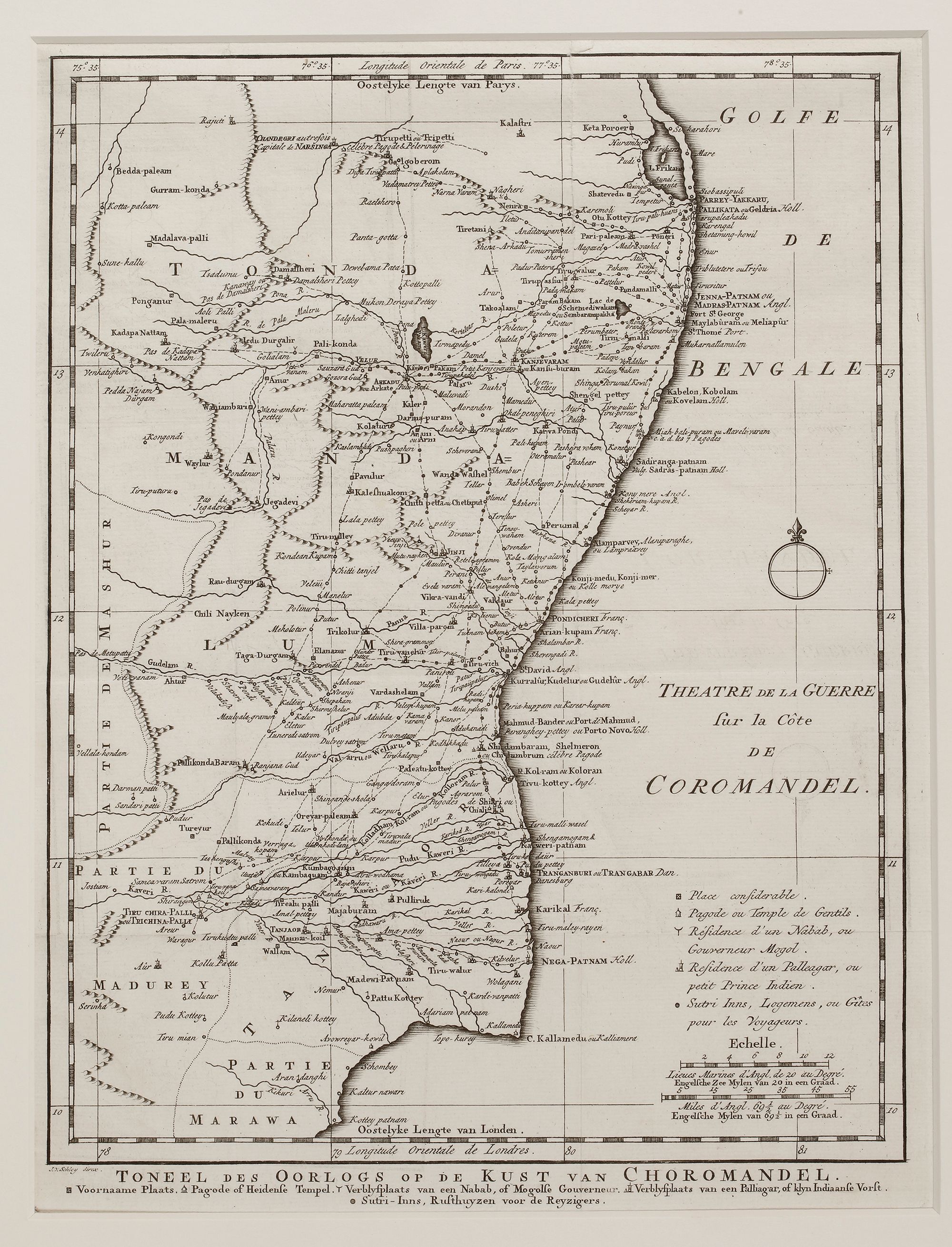A historical map detailing the Coromandel Coast of India, highlighting key cities, forts, and strategic locations involved in colonial conflicts. The map provides insight into the region’s geopolitical significance during the 18th century.